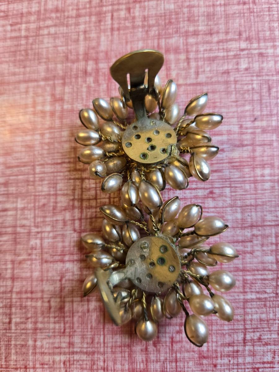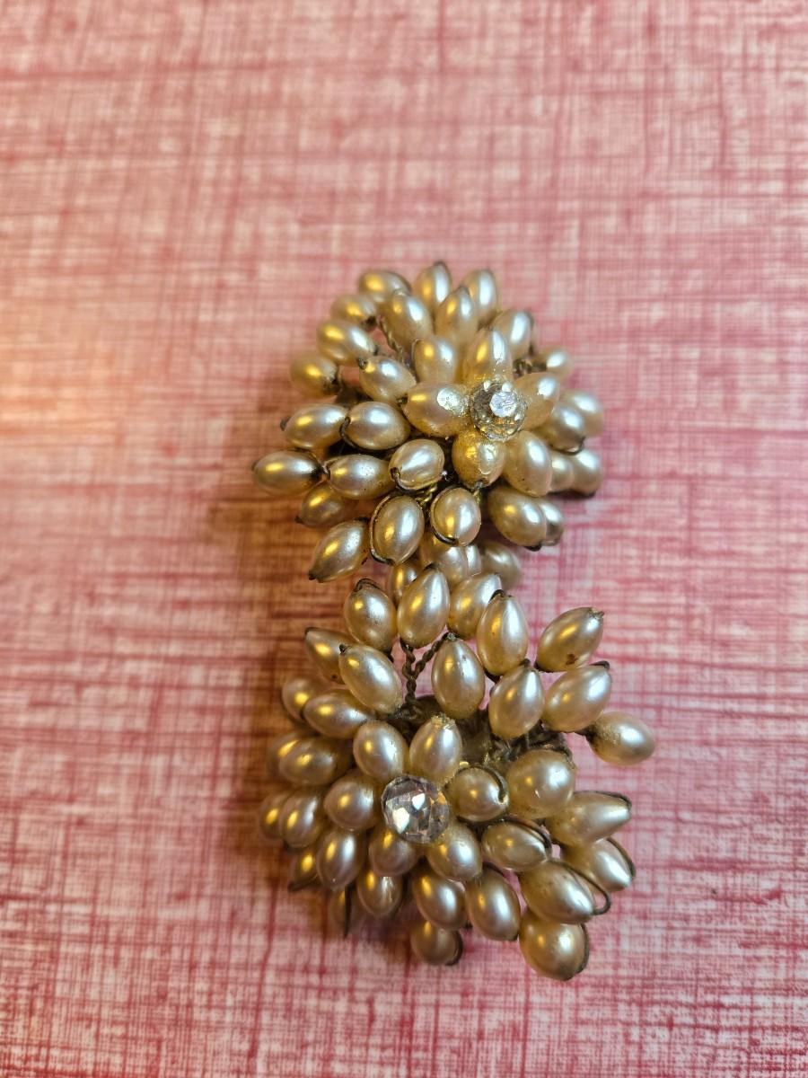 Wired freshwater pearl looking, rhinestone center clip on earrings. Approx 1" across