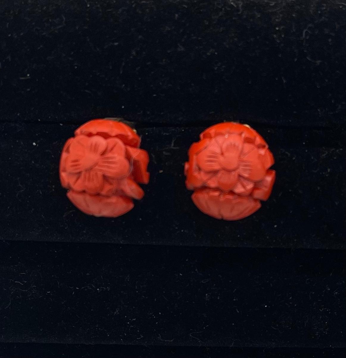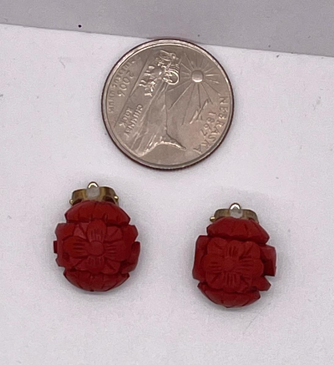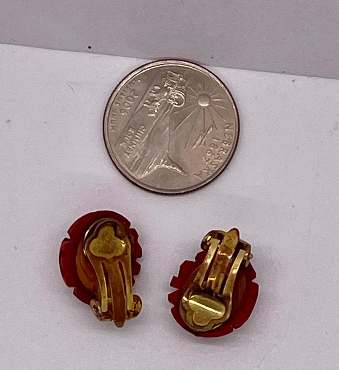 Pair of Vintage Red Cinnabar Carved Flower Button Style Clip Earrings