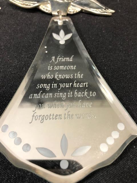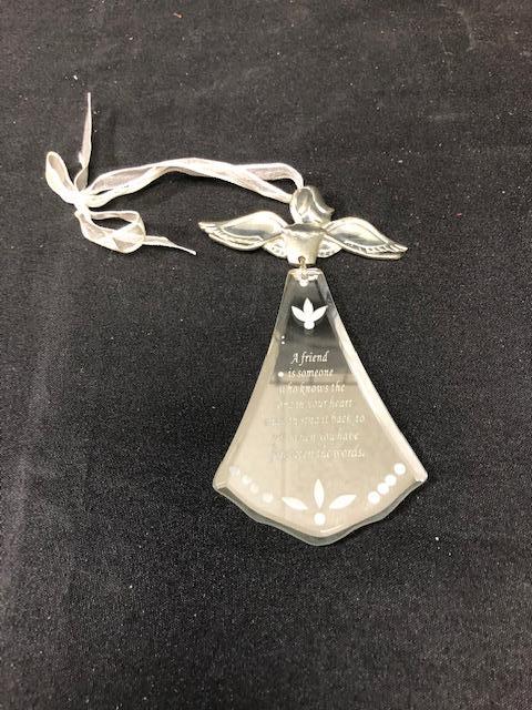Angel ornament. Has a quote about what a friend is on the mirrored body. Good condition.