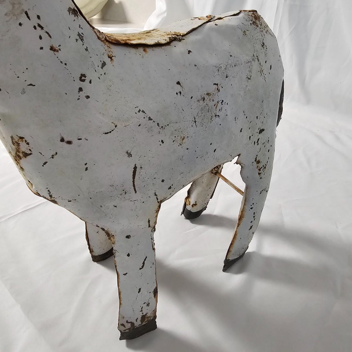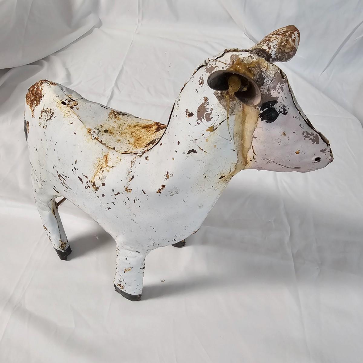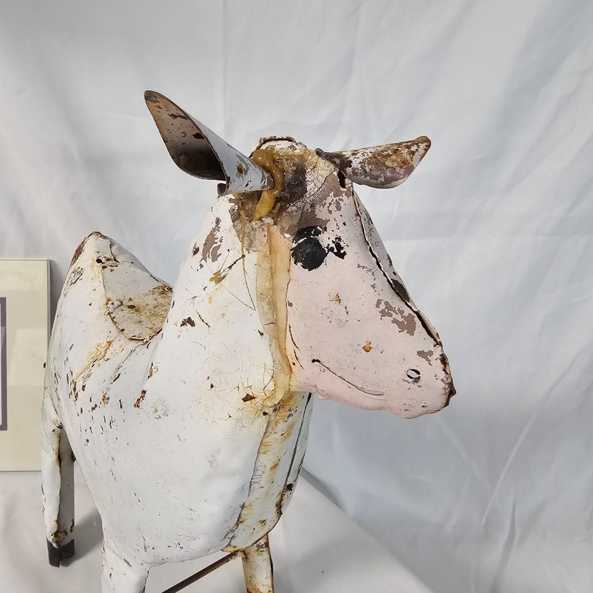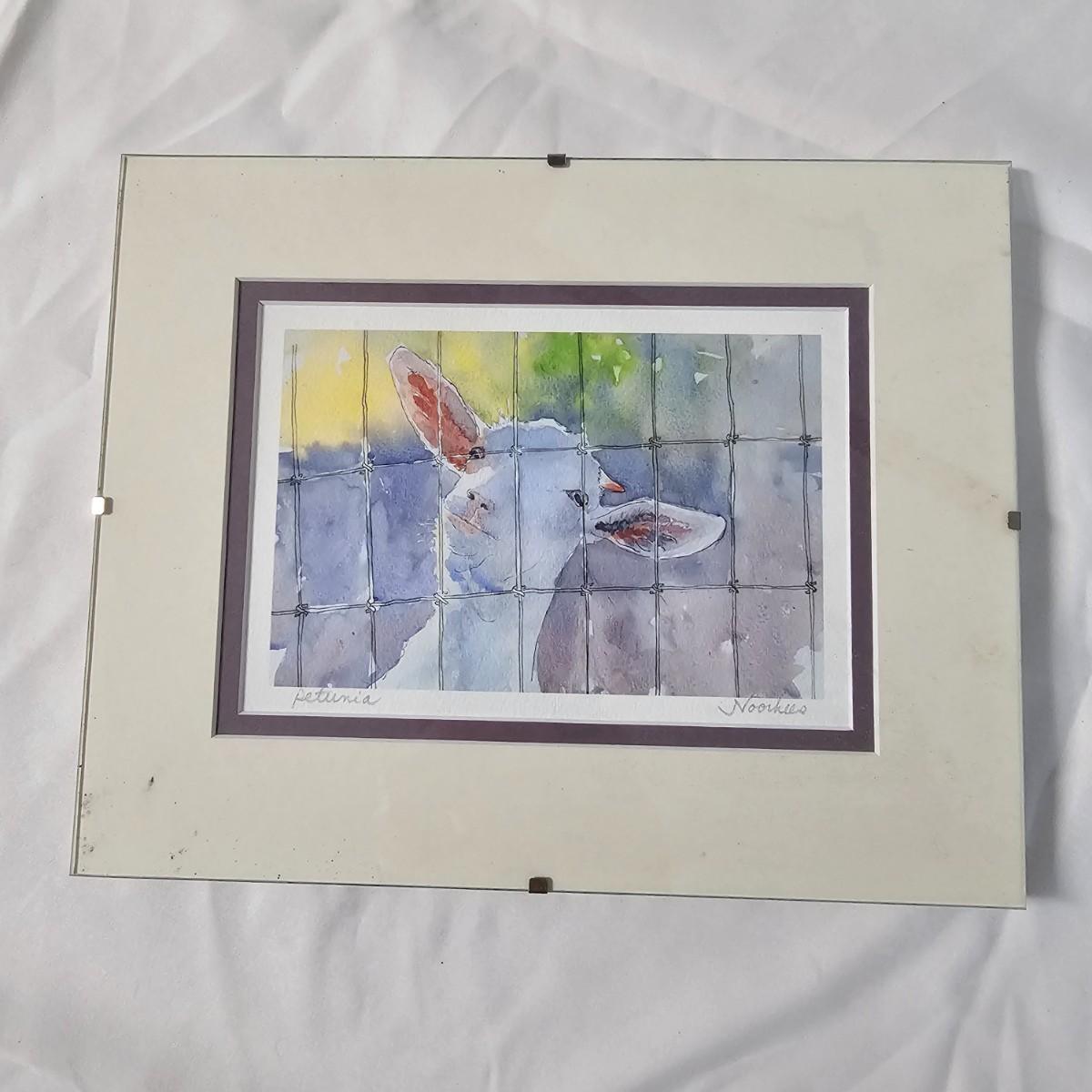 Two whimsical goat representations. The sculpture is formed and soldered tin, has had some repair on ears and measures 14" x 4.5" x 14"H. Various rust spots throughout. The framed piece appears to be an original watercolor titled 'Petunia' and pencil signed by the artist. Measures 10" x 8.5"H. See photos for details. Shipping available.