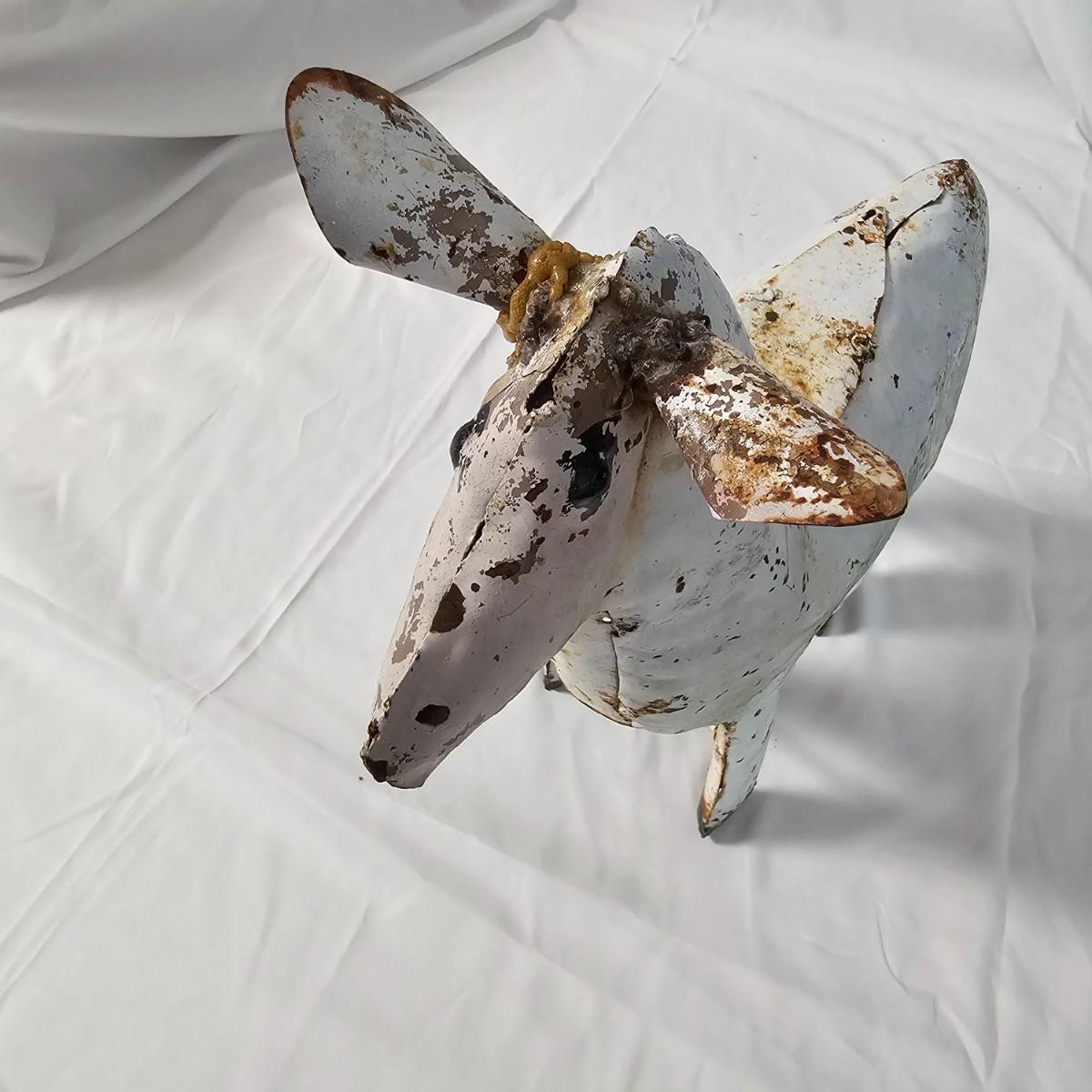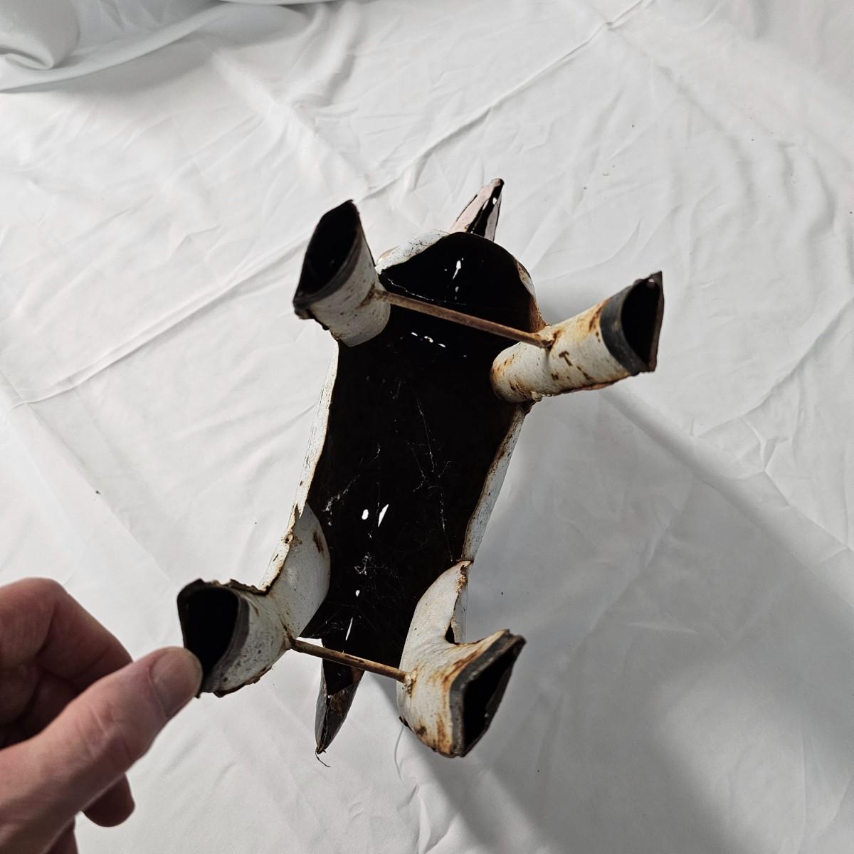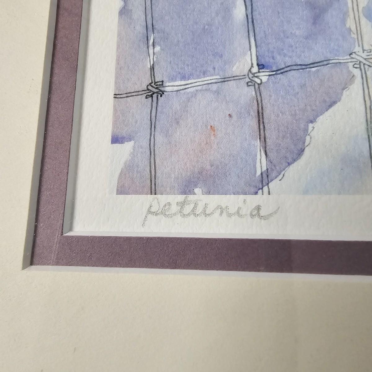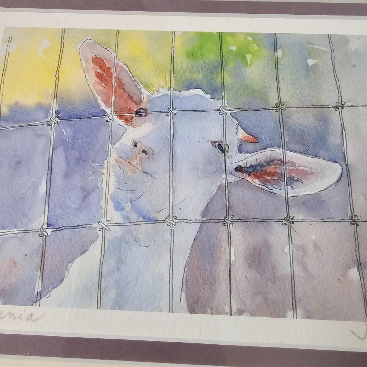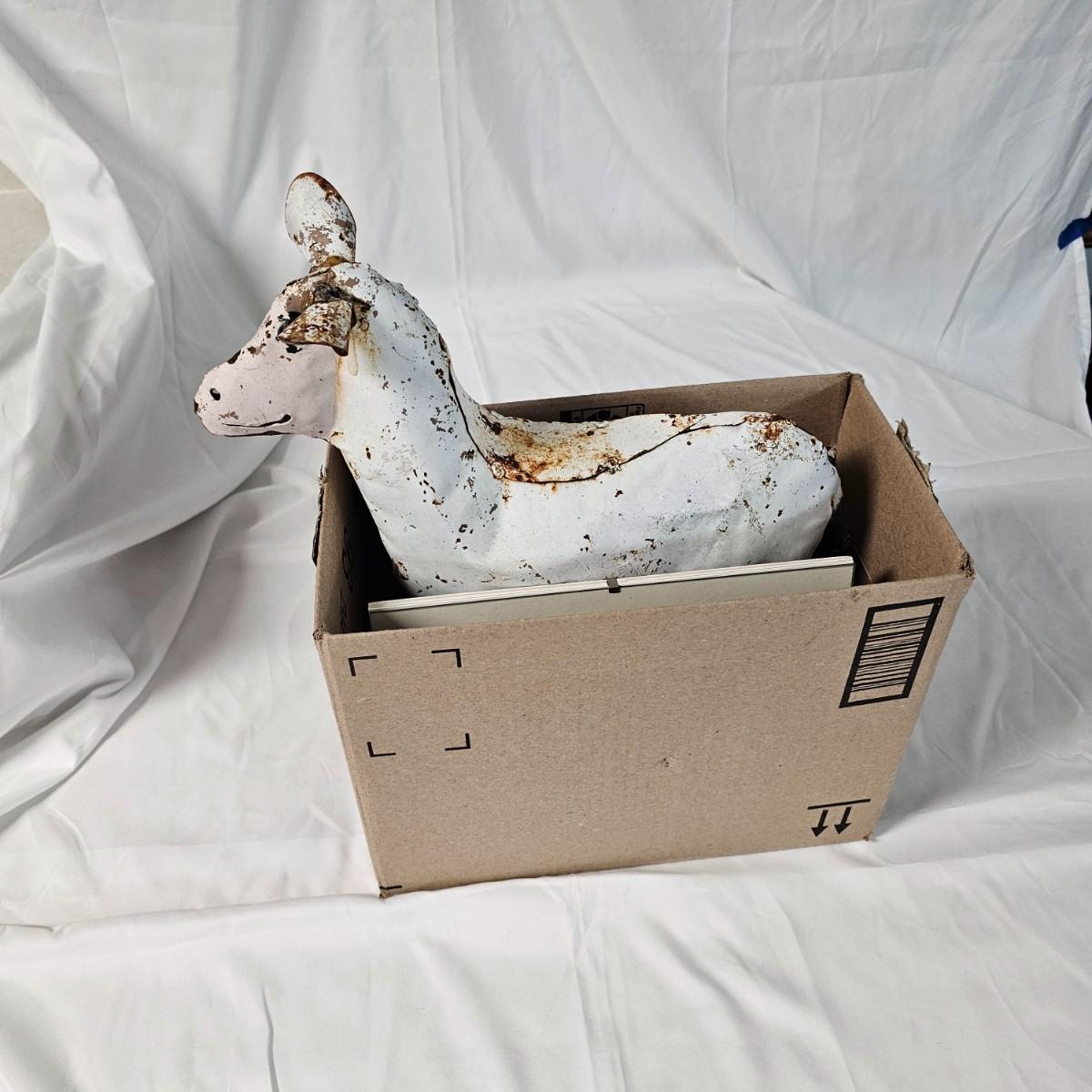 Two whimsical goat representations. The sculpture is formed and soldered tin, has had some repair on ears and measures 14" x 4.5" x 14"H. Various rust spots throughout. The framed piece appears to be an original watercolor titled 'Petunia' and pencil signed by the artist. Measures 10" x 8.5"H. See photos for details. Shipping available.