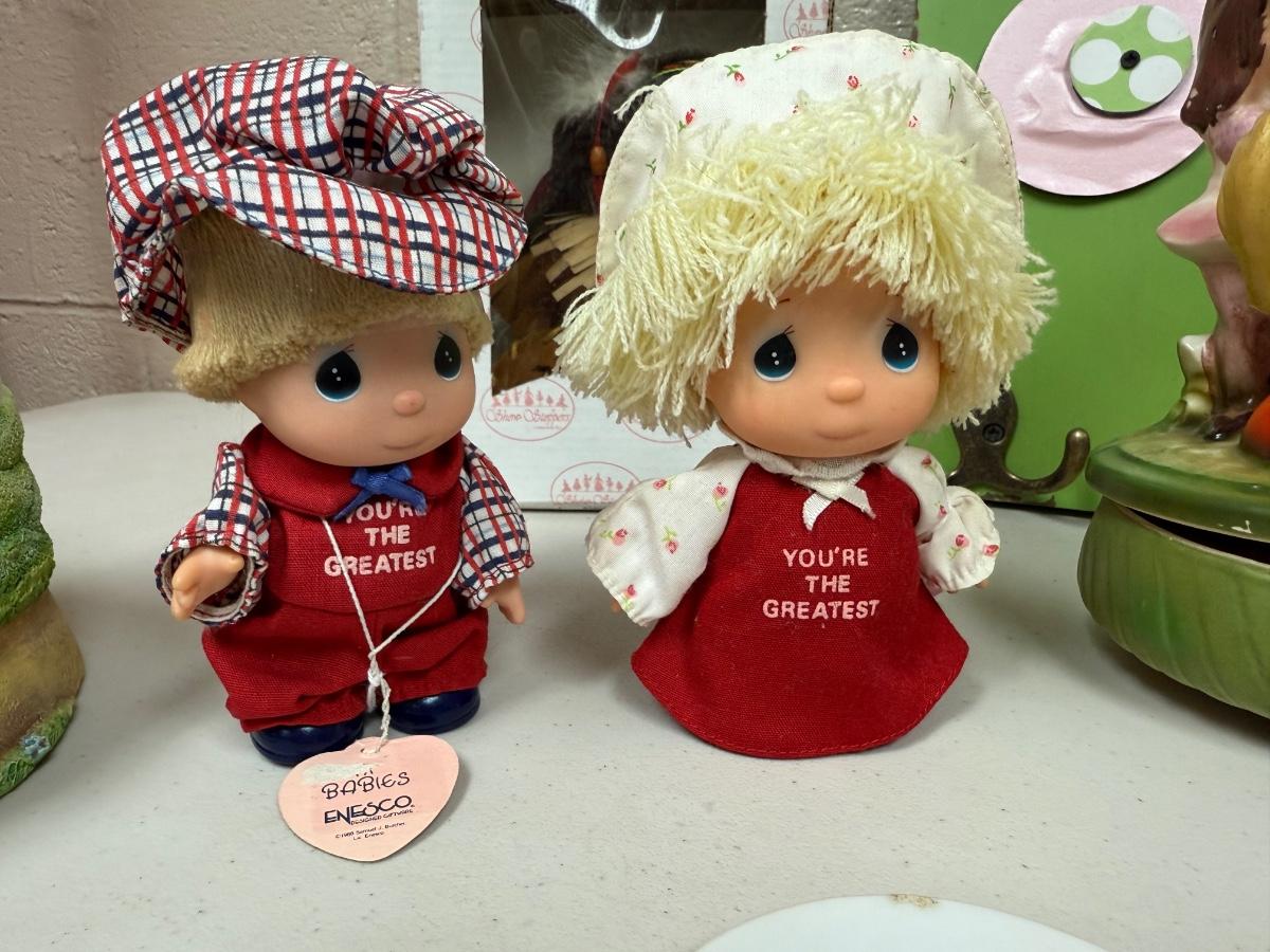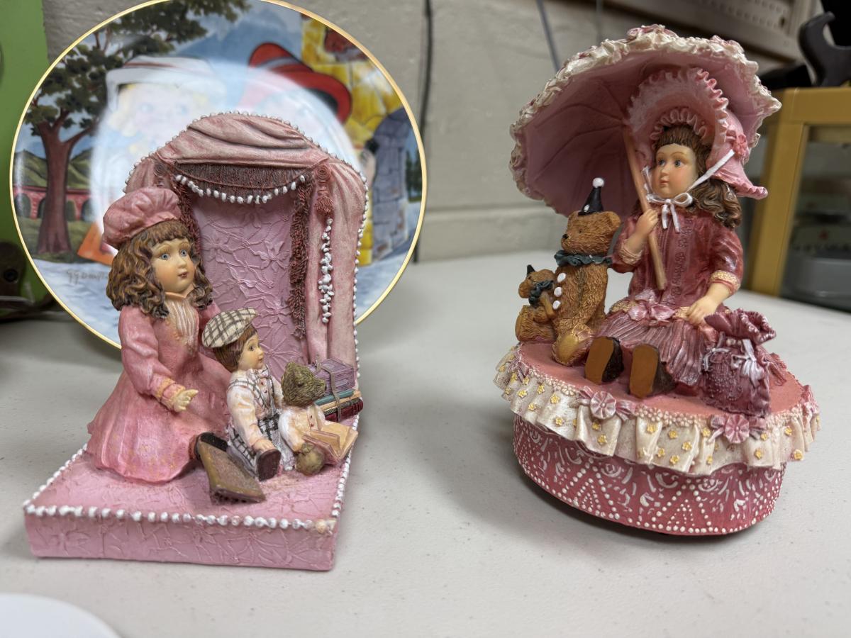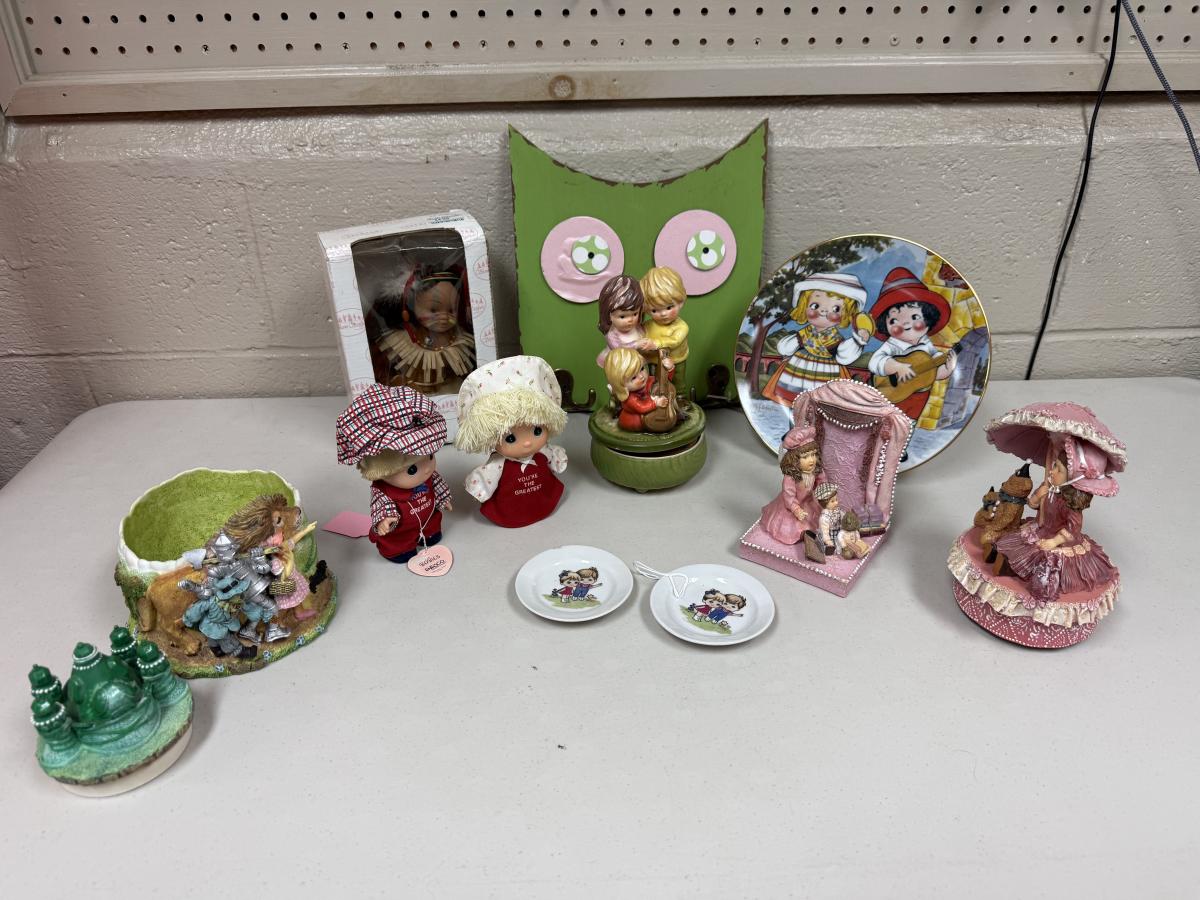 Music boxes, bookend, collectible plate by Drayton, Precious Moments, Wizard of Oz, Indian doll, butter pats/childrens dishes
