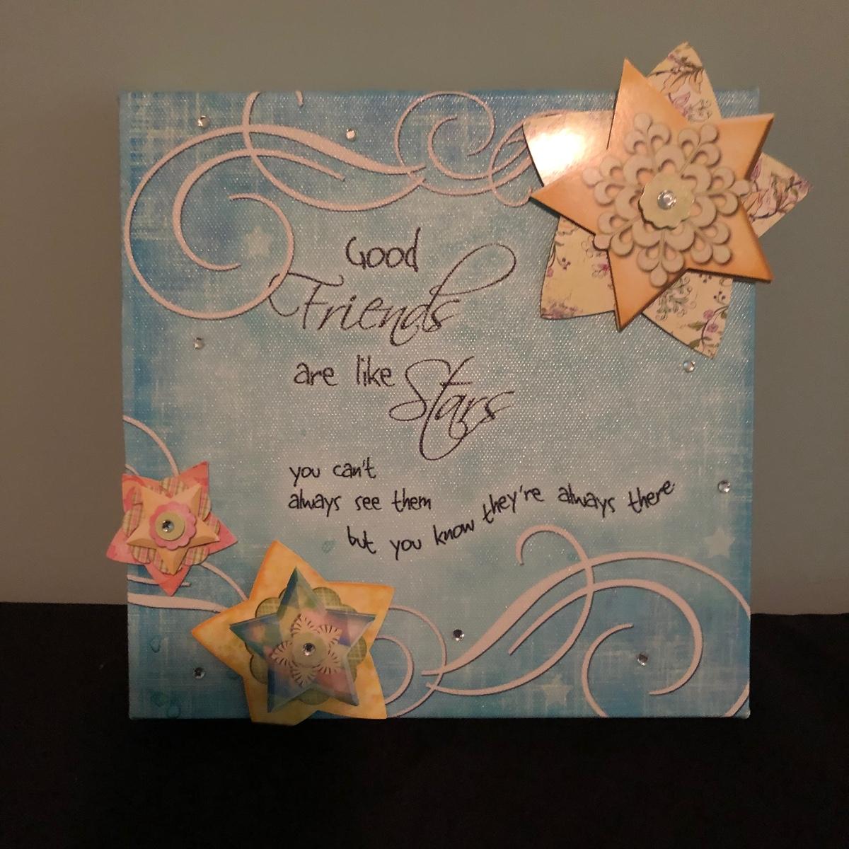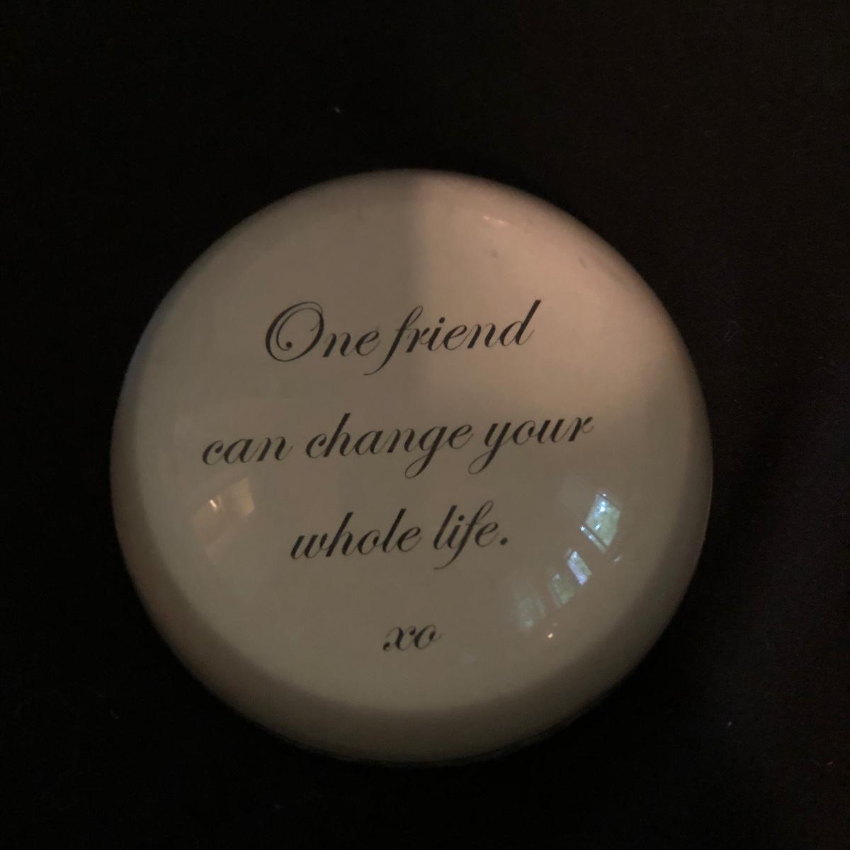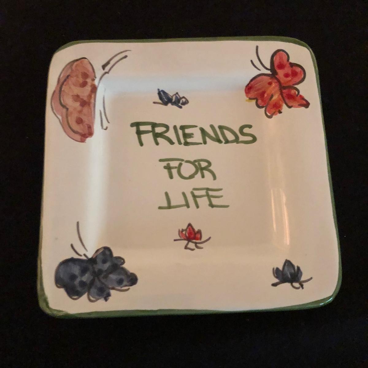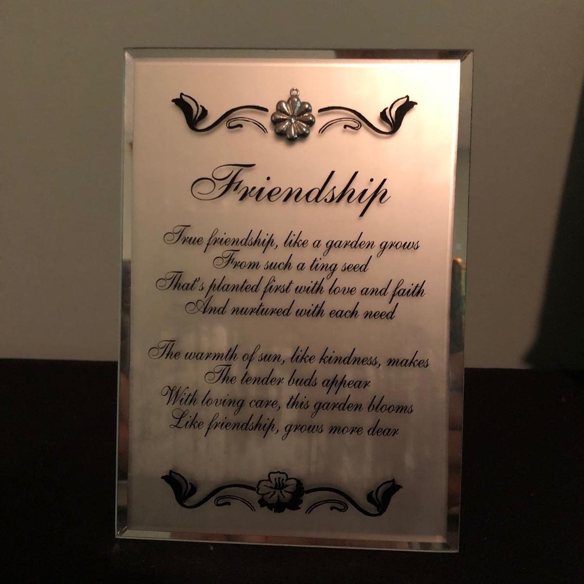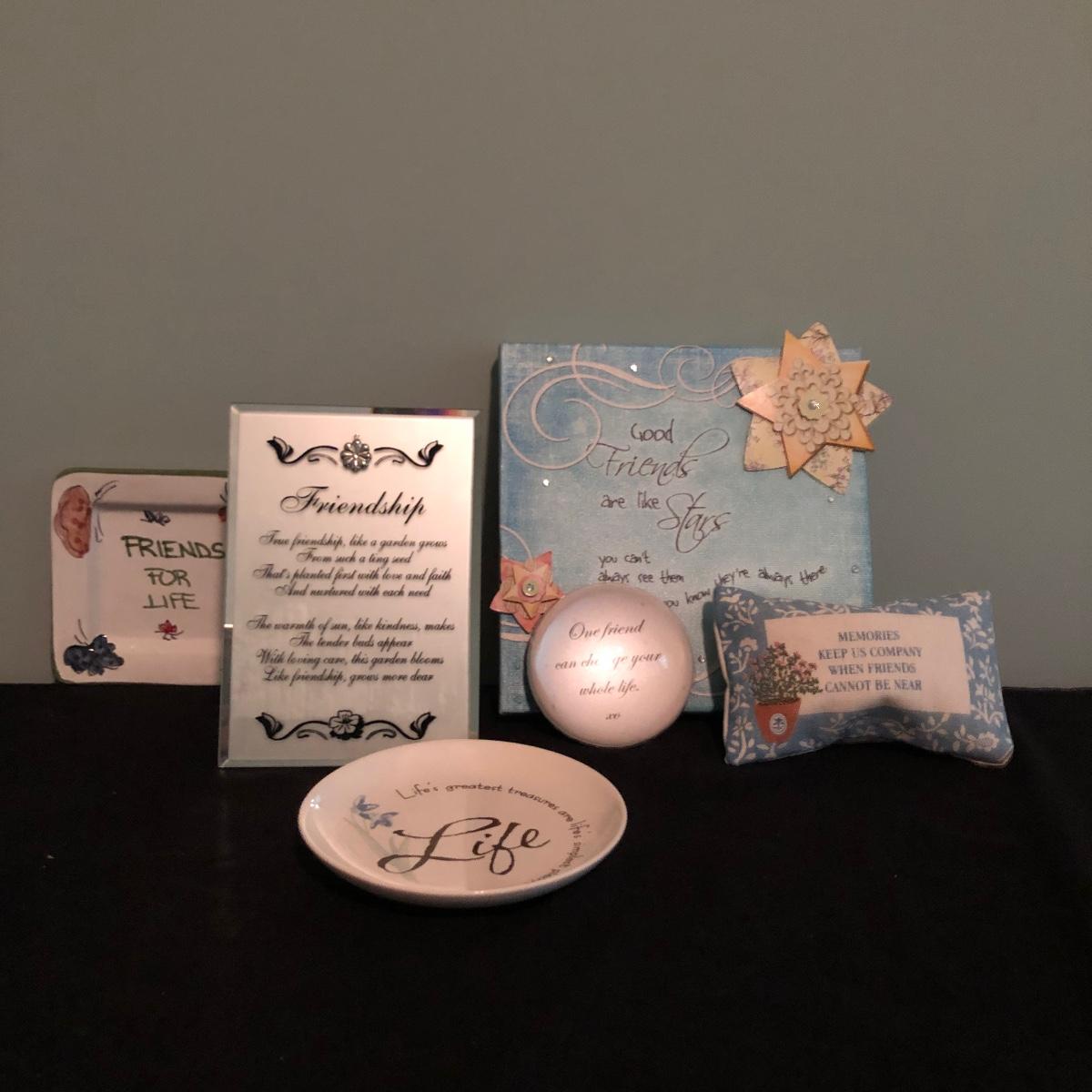 Lot includes two plates, framed sign, sign on a picture frame, miniature pillow and a clear paperweight. All of these items have quotes about friendship. Largest piece measures 8” x 8” x 1”. Shipping available.