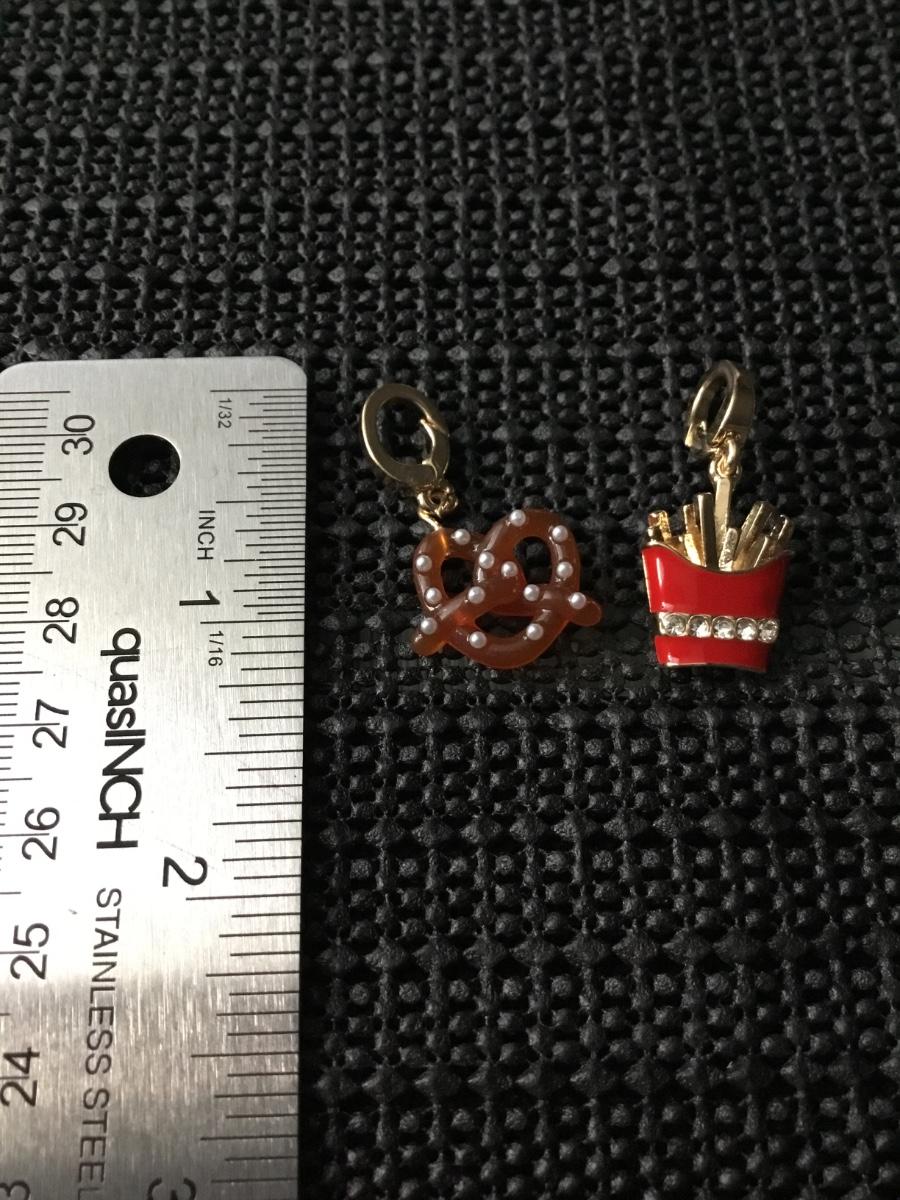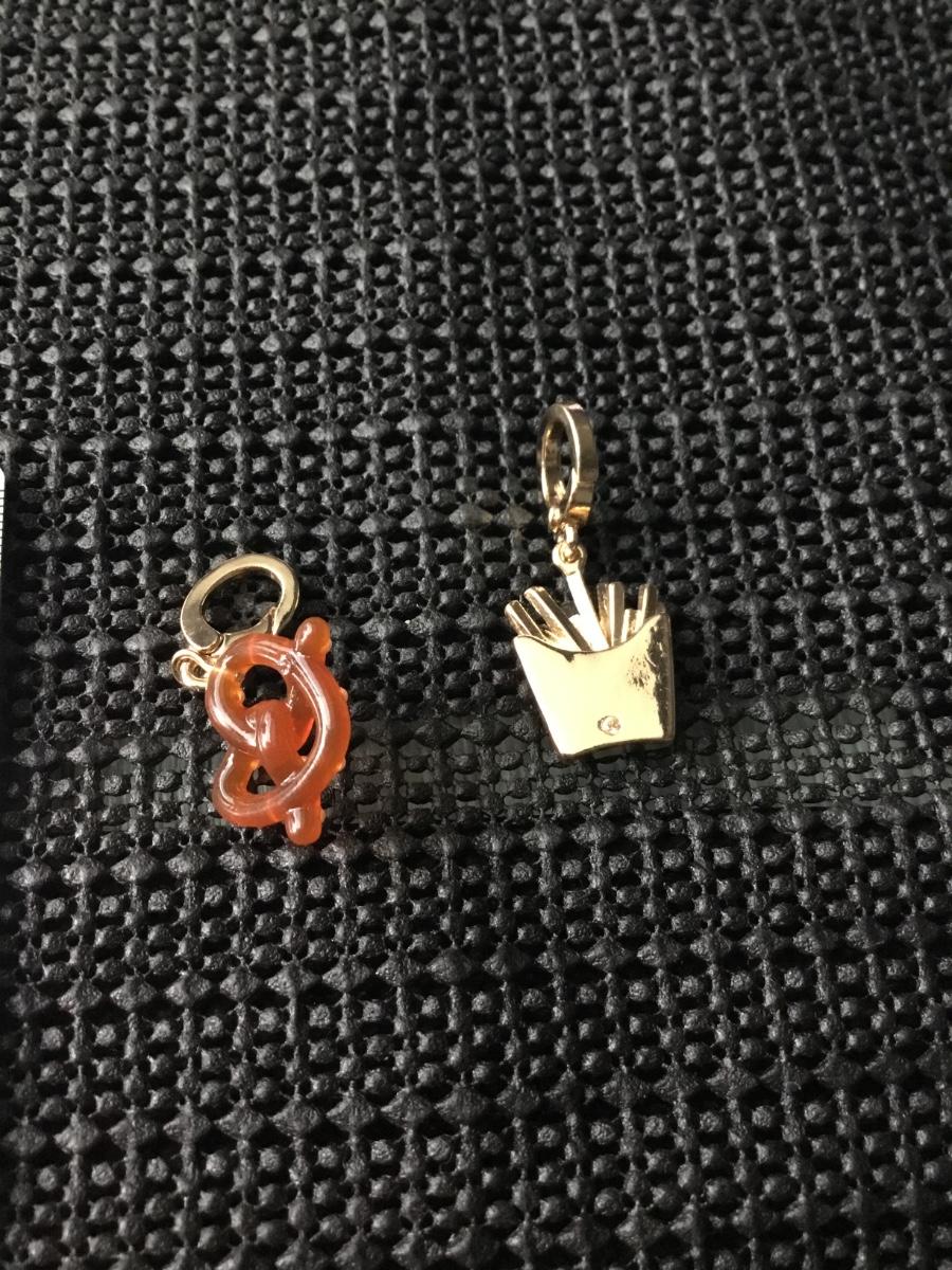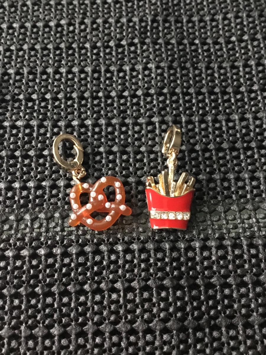 Fries and pretzels charm set in gold tone plated brass with enamel details