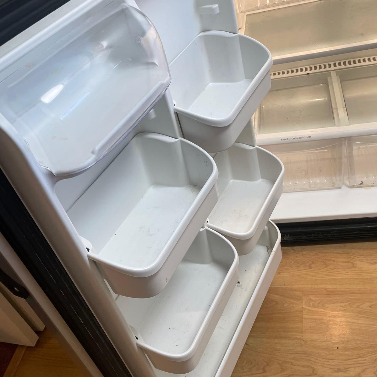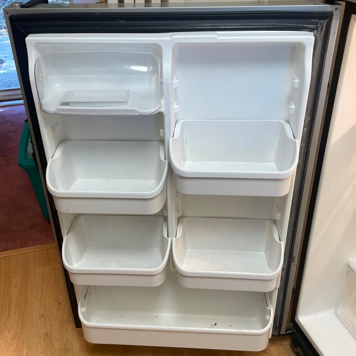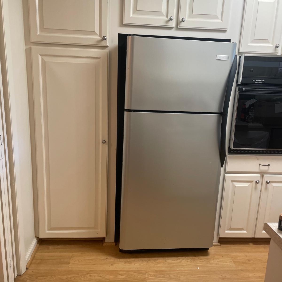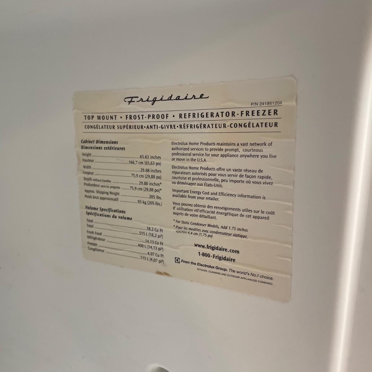 This Frigidaire refrigerator is in good condition with a top freezer. Measures 30” x 34” (including handles) x 66”. Egg holder is includedIt does need a good clean but appears to be working well (ice maker was not tested) and is still plugged in; winning bidder must bring assistance to help move and load this item due to its weight and/or size and note it is inside of built in cabinets, but fortunately is located near to the front door.