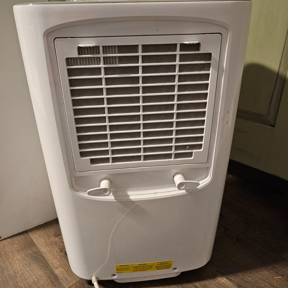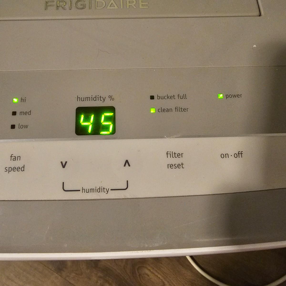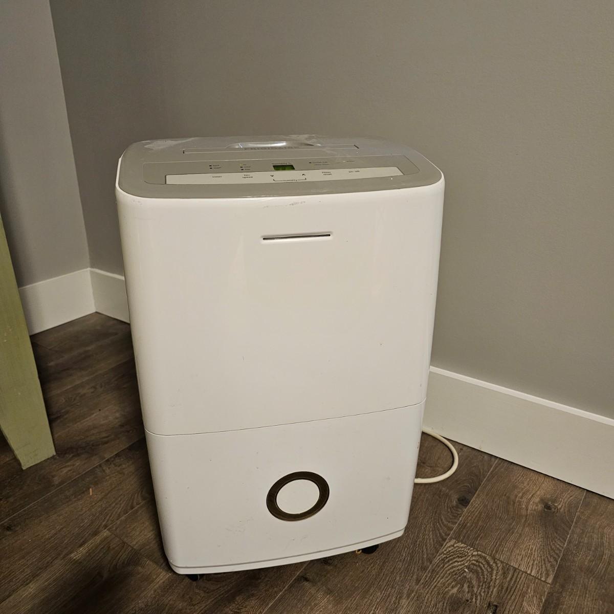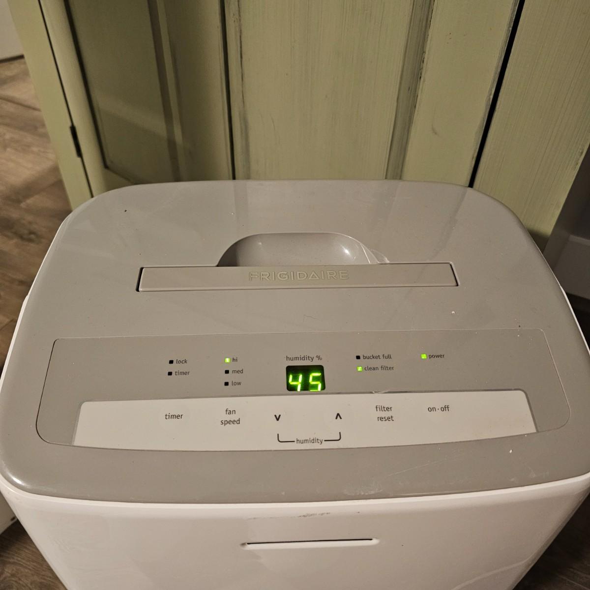 One Frigidaire dehumidifier with lift handle and wheels. Adjustable humidity, fan and timer settings. Unit measures 15" x 11" x 24"H. Humidifier powered on when plugged in. See photos for details. Local pickup only.