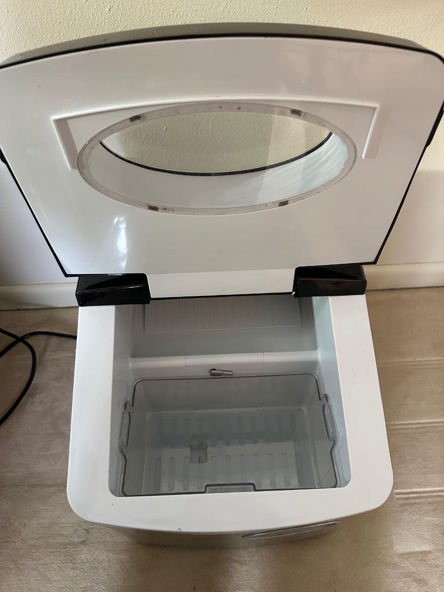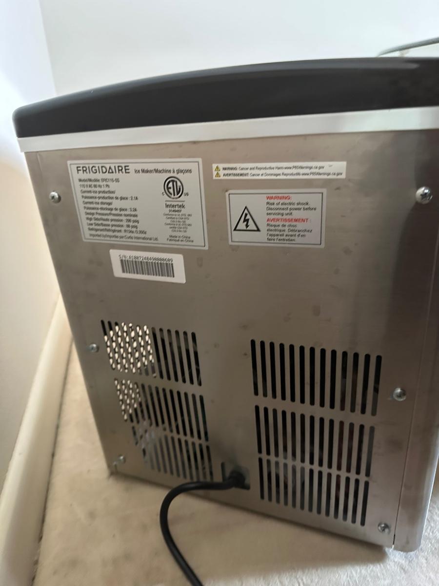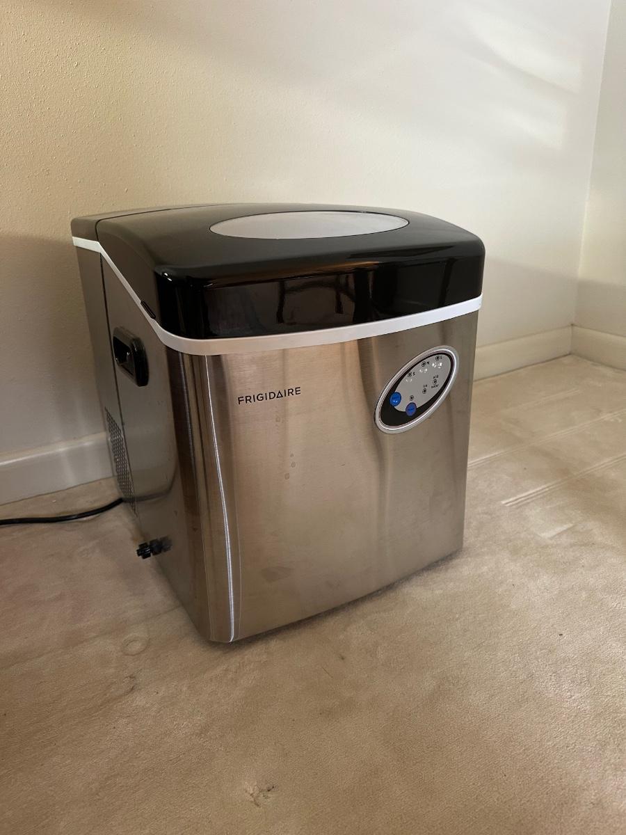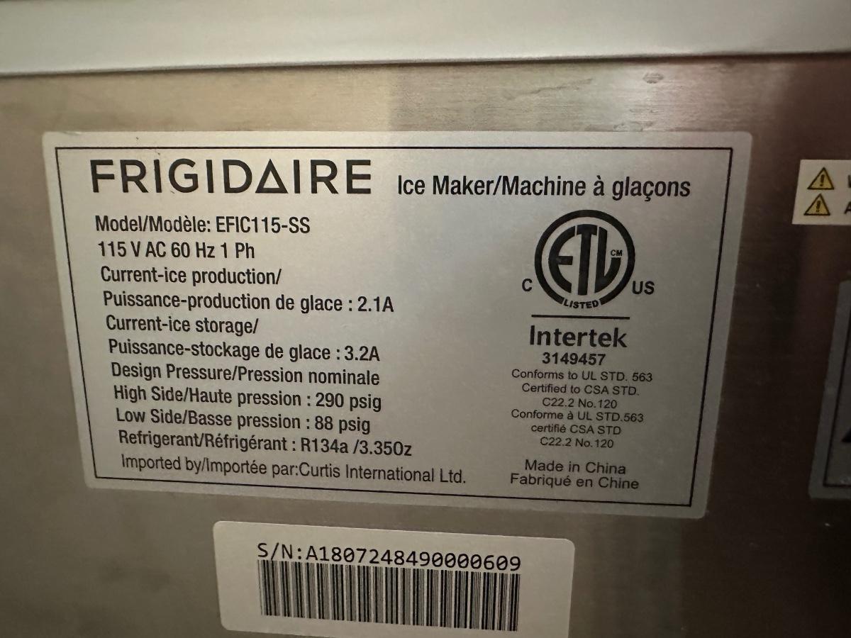 Frigidaire stainless steel countertop ice maker, model EFIC115-SS. Features small/medium/large ice size options, clear viewing window, removable ice basket, and simple push-button controls.