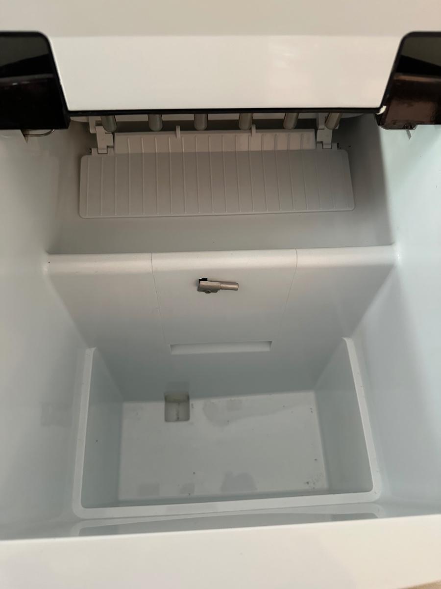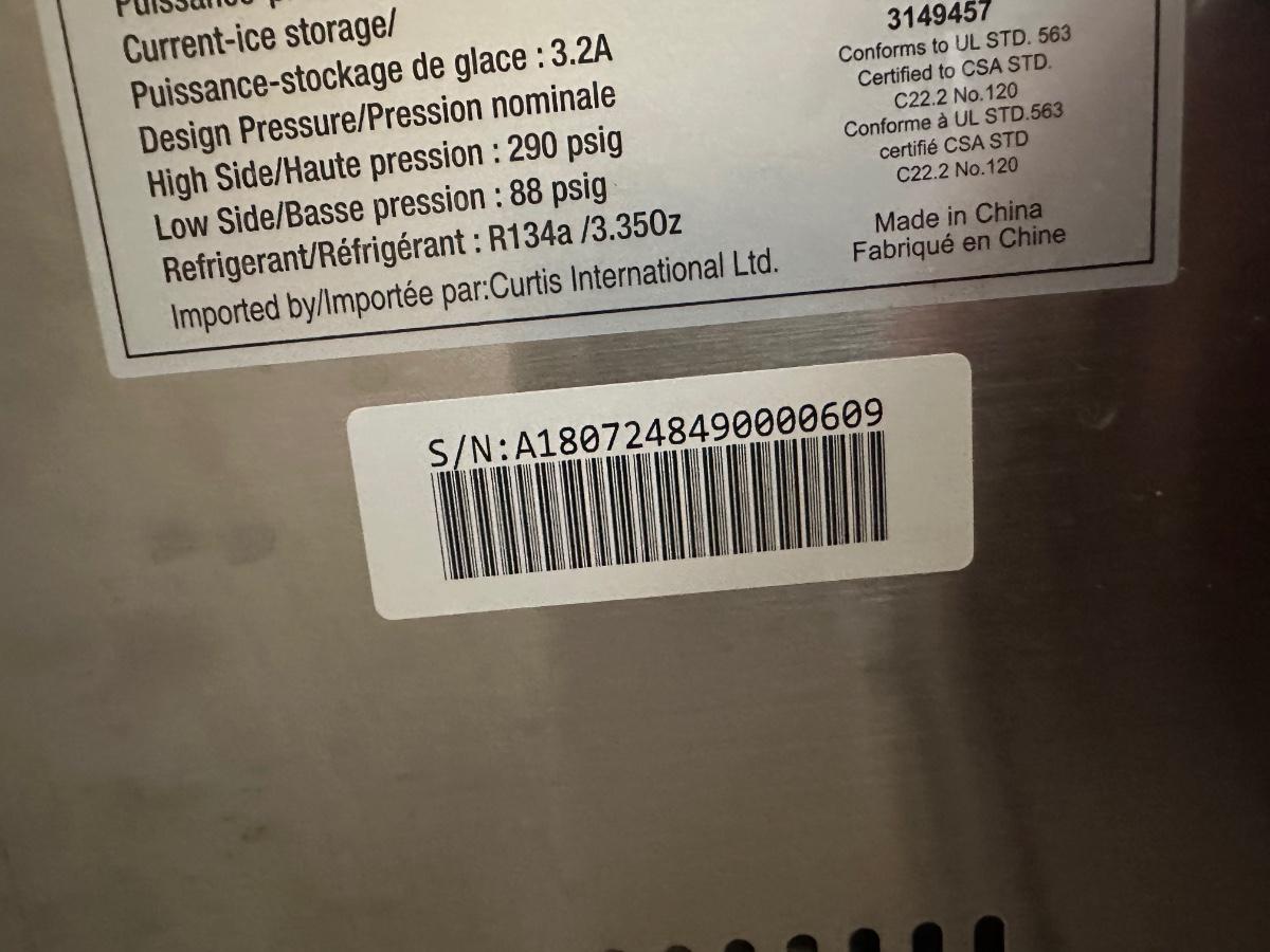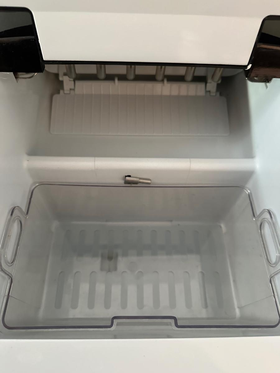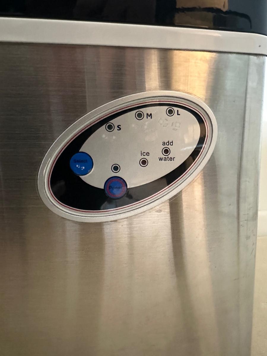 Frigidaire stainless steel countertop ice maker, model EFIC115-SS. Features small/medium/large ice size options, clear viewing window, removable ice basket, and simple push-button controls.