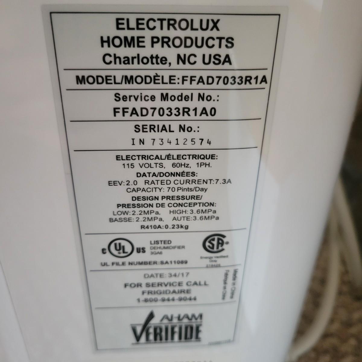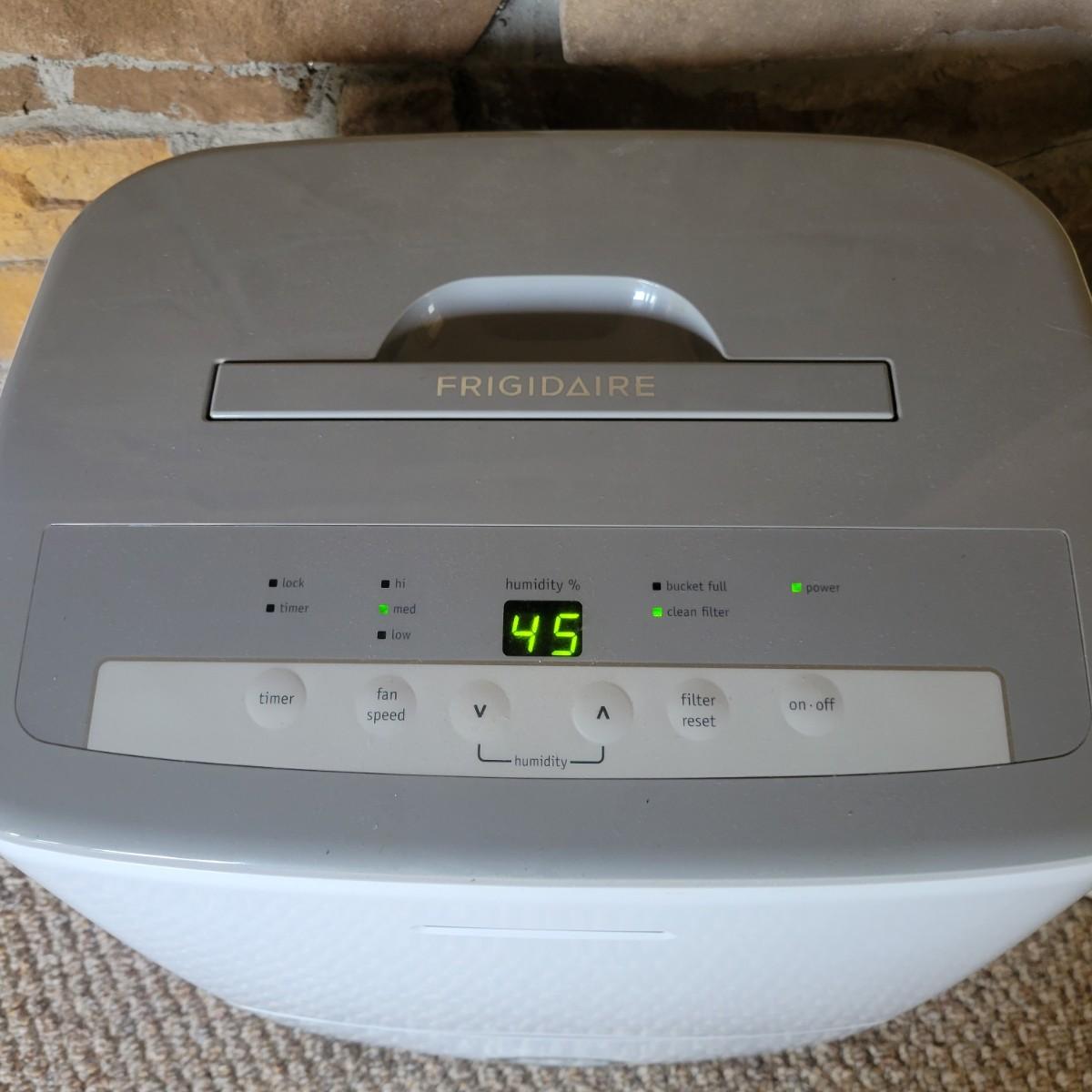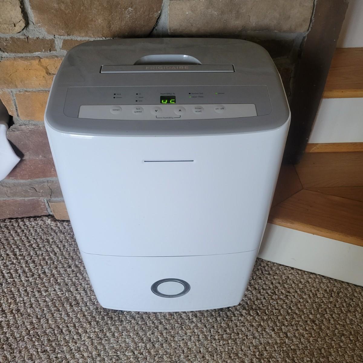 A Frigidaire dehumidifier that powered on when plugged in. This dehumidifier features a timer, three fan settings, humidity settings and a filter reset. Bucket appears to be free of mildew and the unit measures approximately 15" x 11" x 24".H. Local pickup only