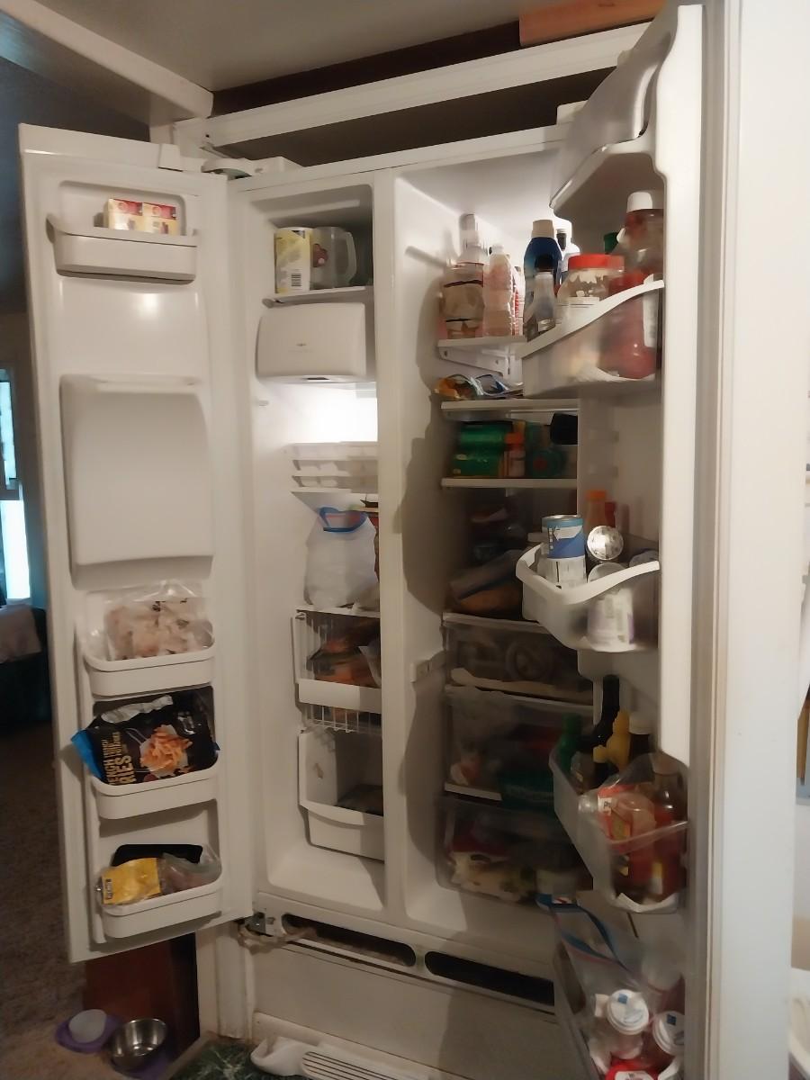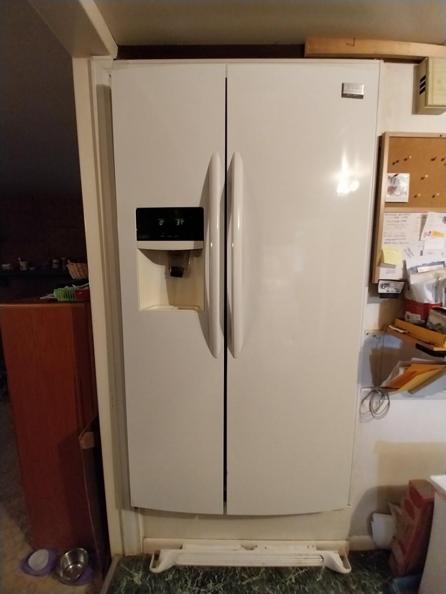 CONTENTS NOT INCLUDED 36Wx33Dx70H WHITE JUST REPLACED THE FILTER FOR WATER DISPENSER THE ICEMAKER WASNT WORKING BUT WATER WAS FROM THE DOOR (COULD BE A SIMPLE FIX? CLIENT DIDNT HAVE CHECKED)