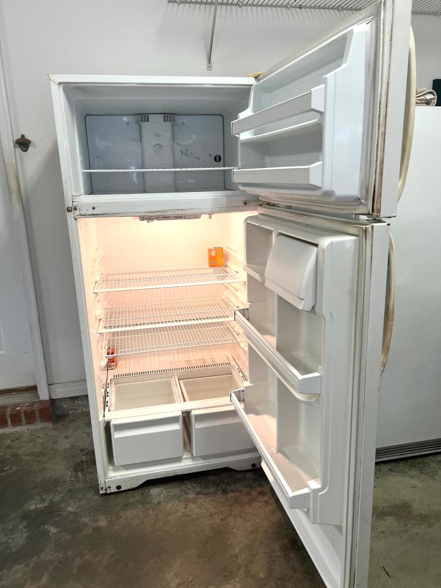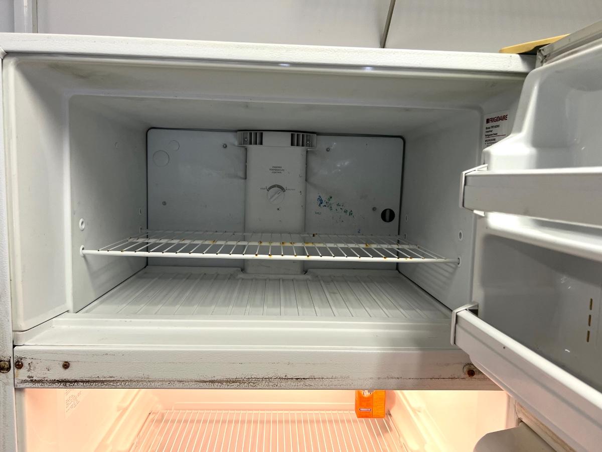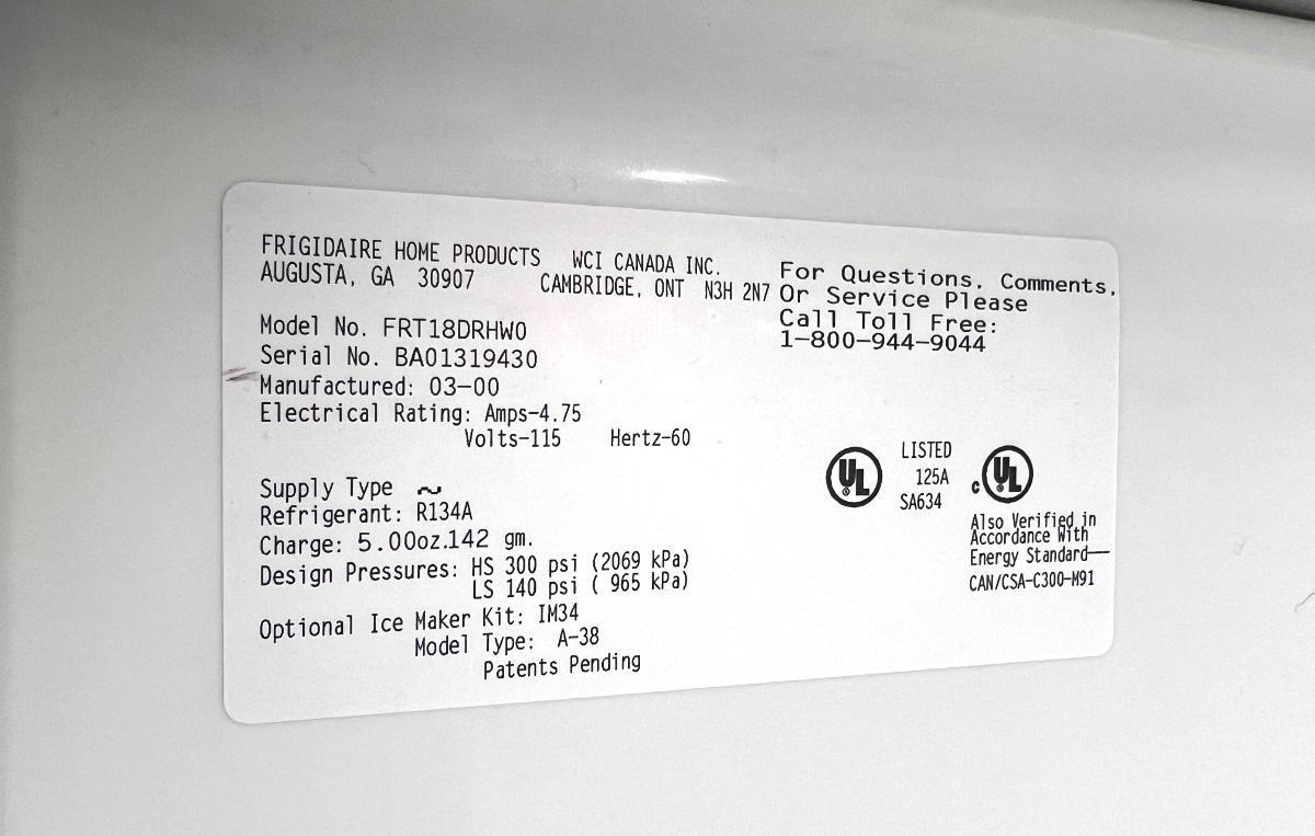 FRIGIDAIRE Garage Fridge. Model number FRT18DRHWO. Works as it should. Will be plugged in for winning bidder to verify.