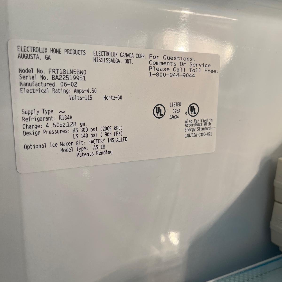 Lot includes a Frigidaire refrigerator model # FRT18LN5BWO. Refrigerator is plugged in and appears to be working. Refrigerator measures 30” x 30.5” x 66”. Winning bidder must bring assistance to help move and load this item due to its weight and/or size.