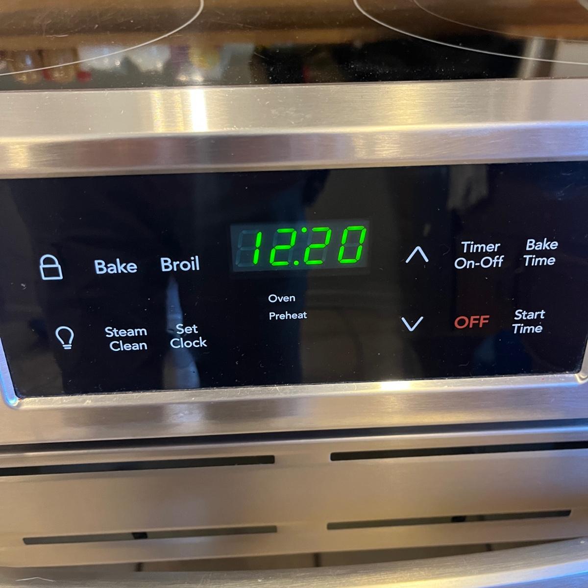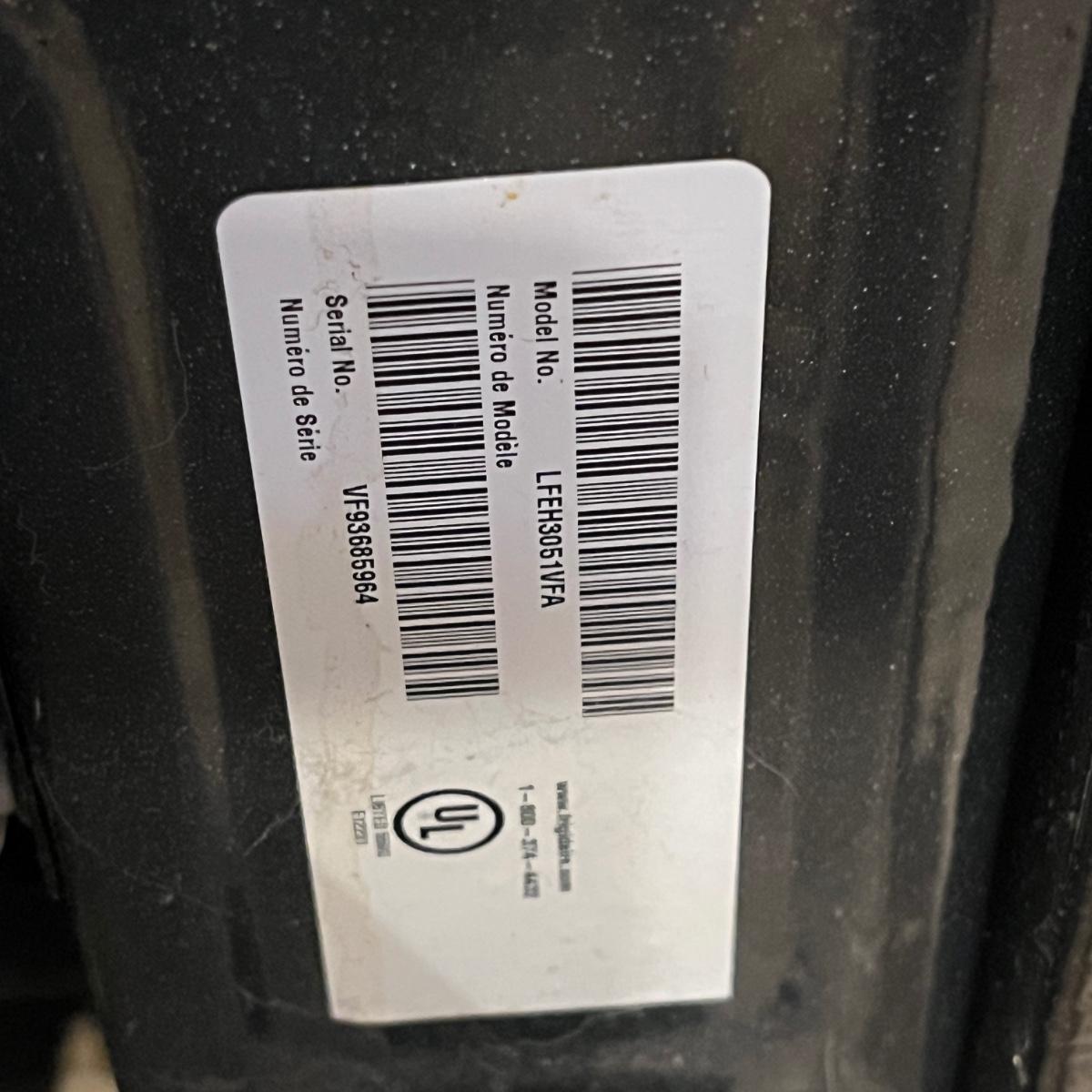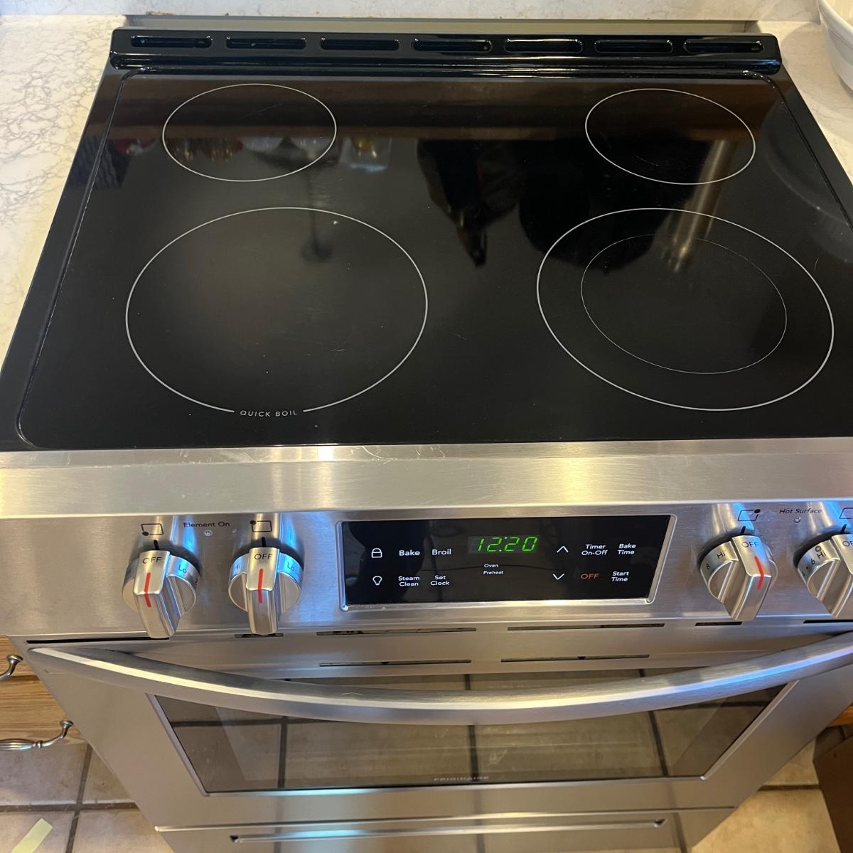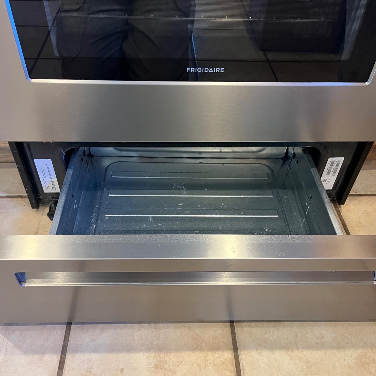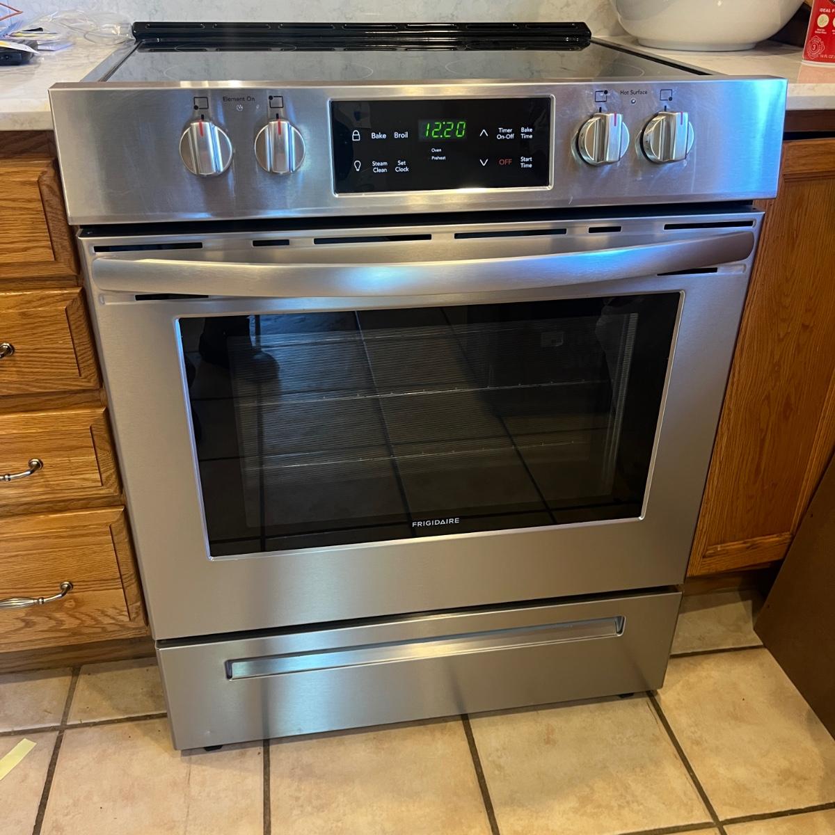 Lot includes a Frigidaire stainless steel front control electric range that measures 30” x 25” x 36”H. Range powered on when plugged in.