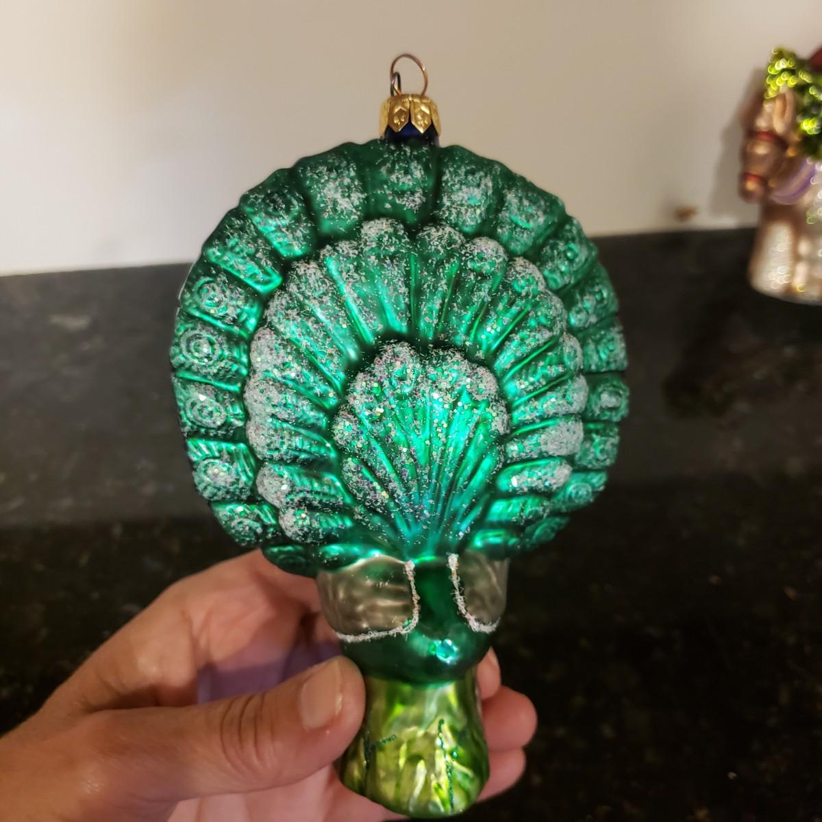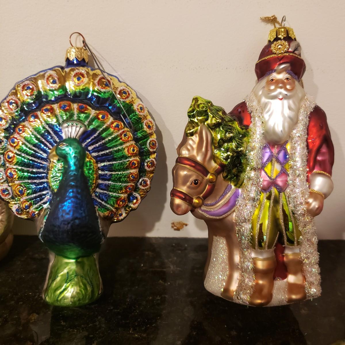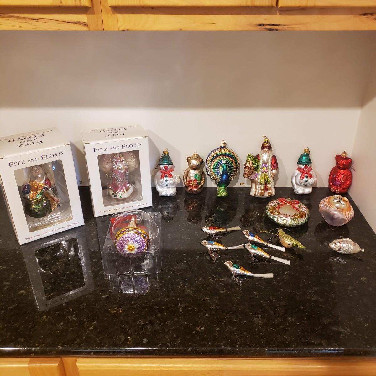 This 18 piece lot features Fitz and Floyd ornaments, as well as some others. The details on these ornaments is exquisite. The peacock ornament measures 3" x 6"H.