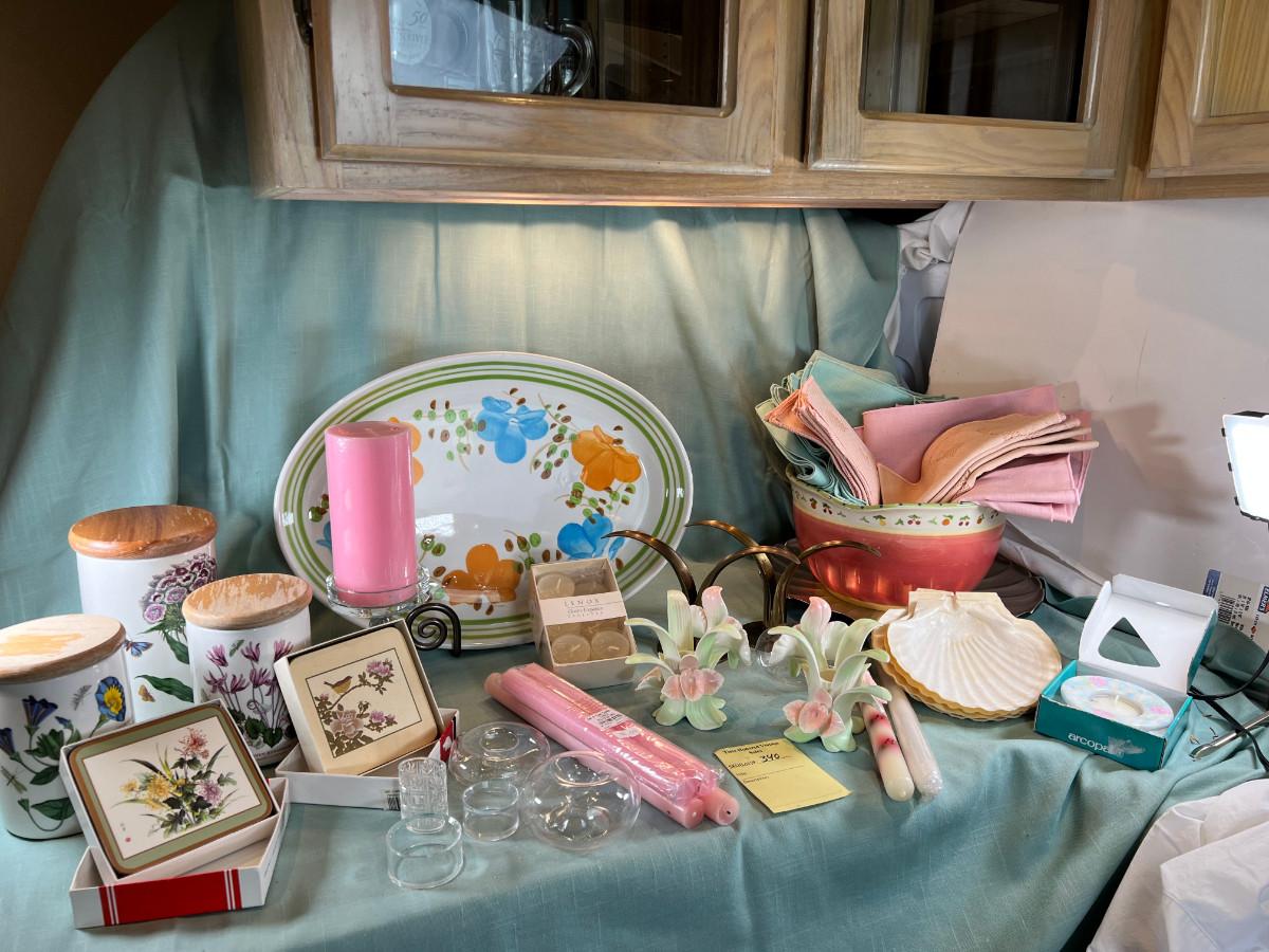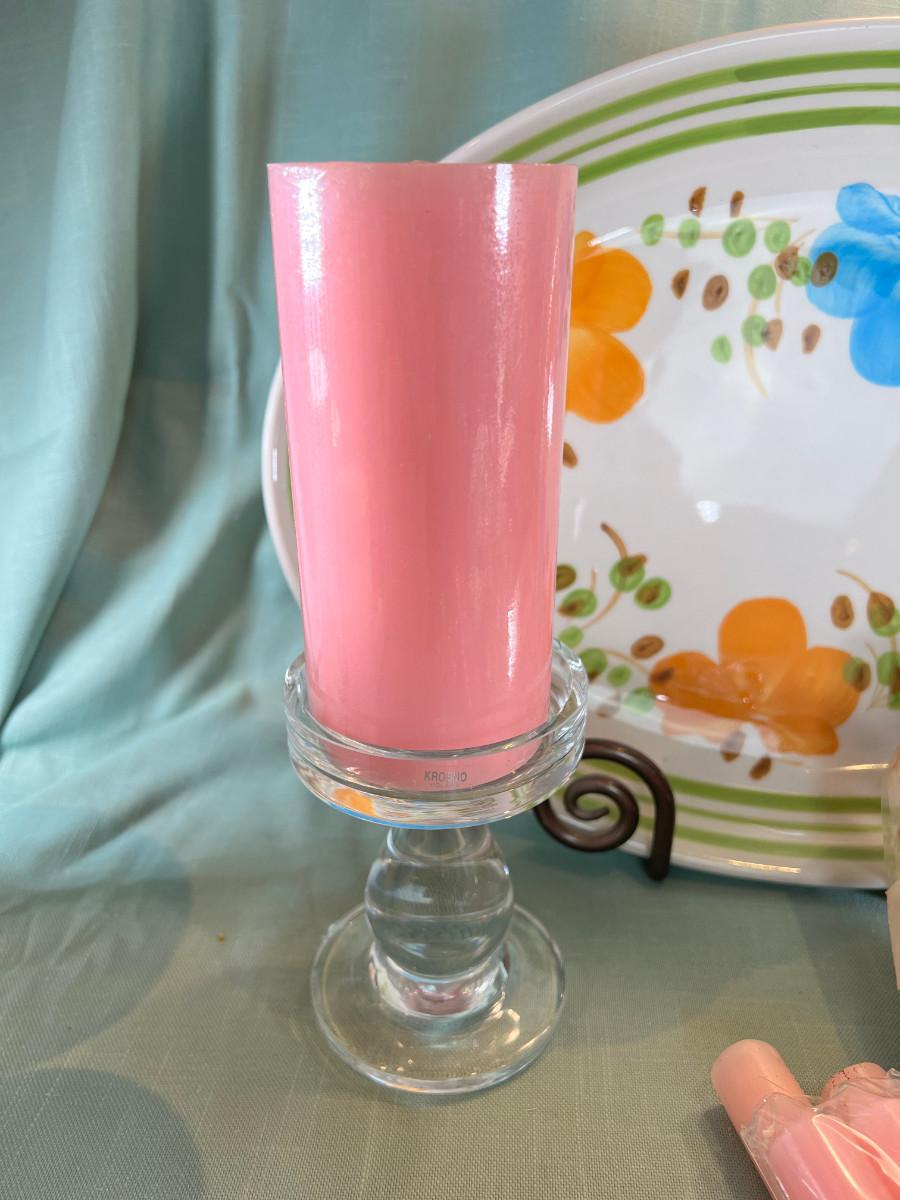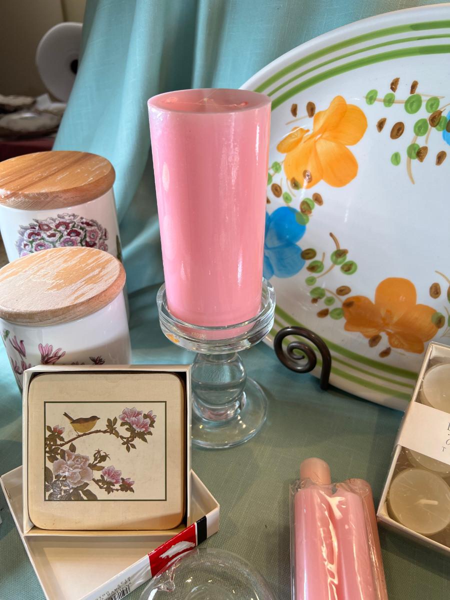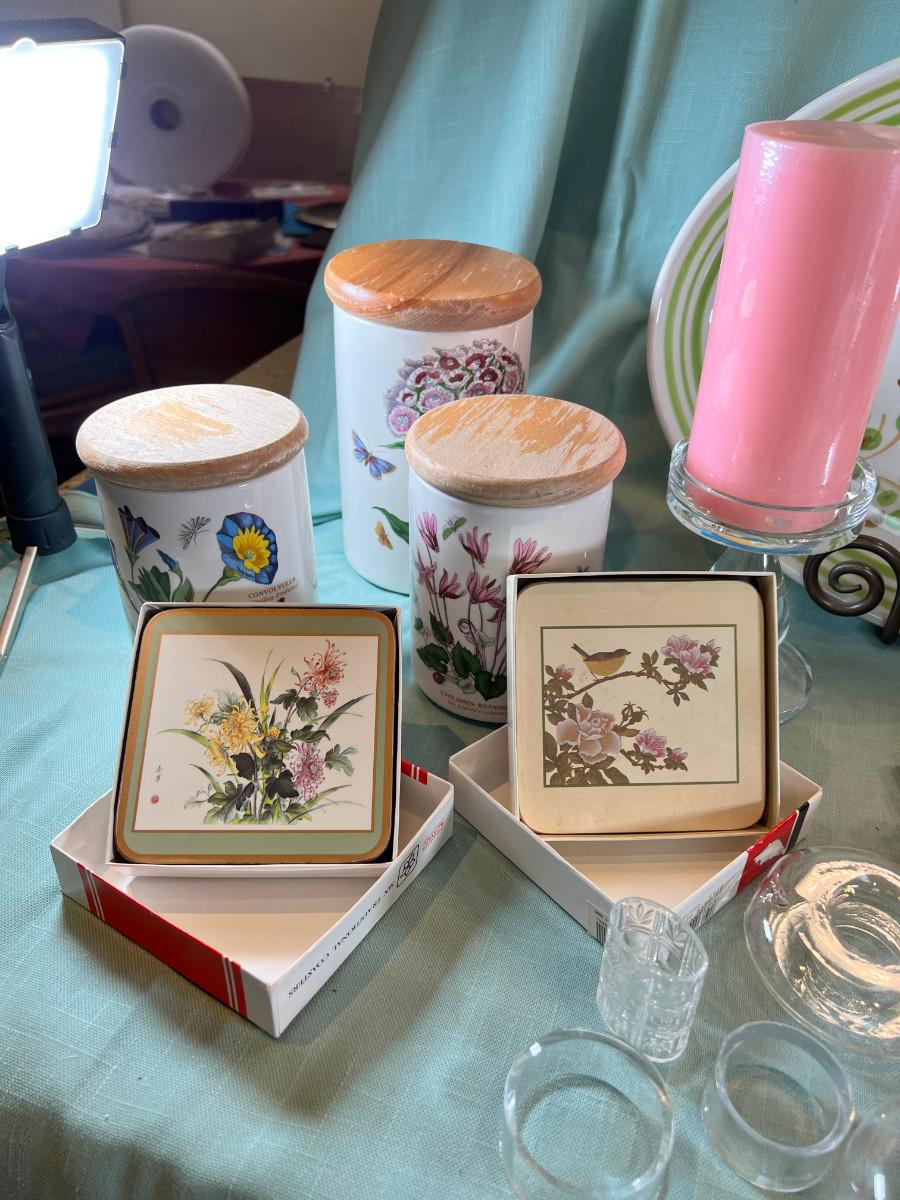 Amazing metal "Iris" candle holders, English Pimpernel new coasters in box, 3 floral canisters with wear to lids, Kronos single glass candle holder with large pink candle., Large Italian ironstone floral platter, Pfaltzgraff large bowl.