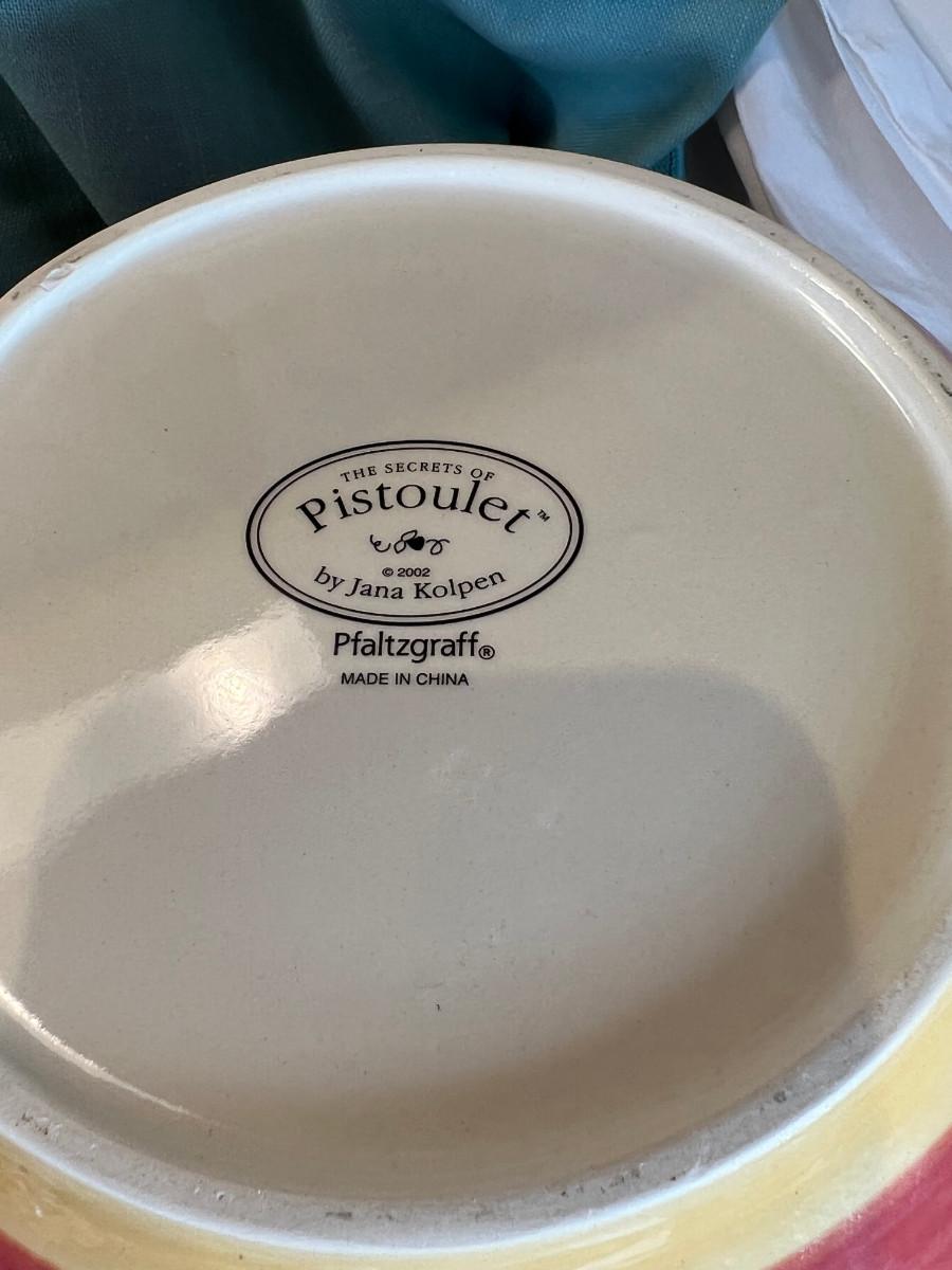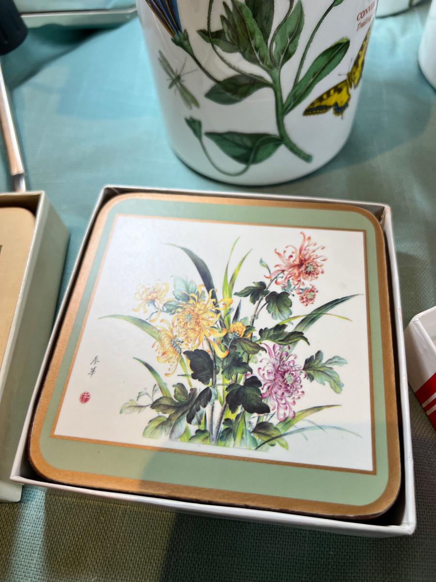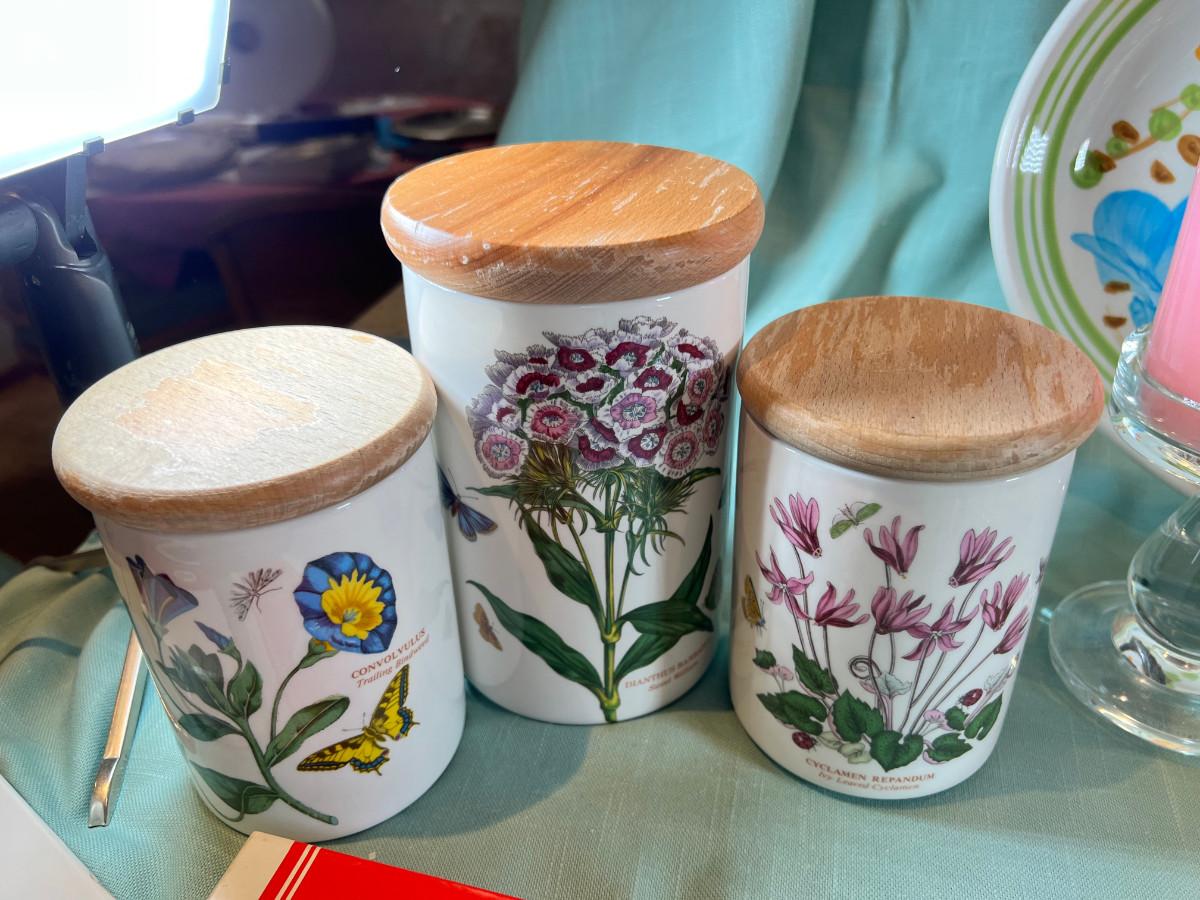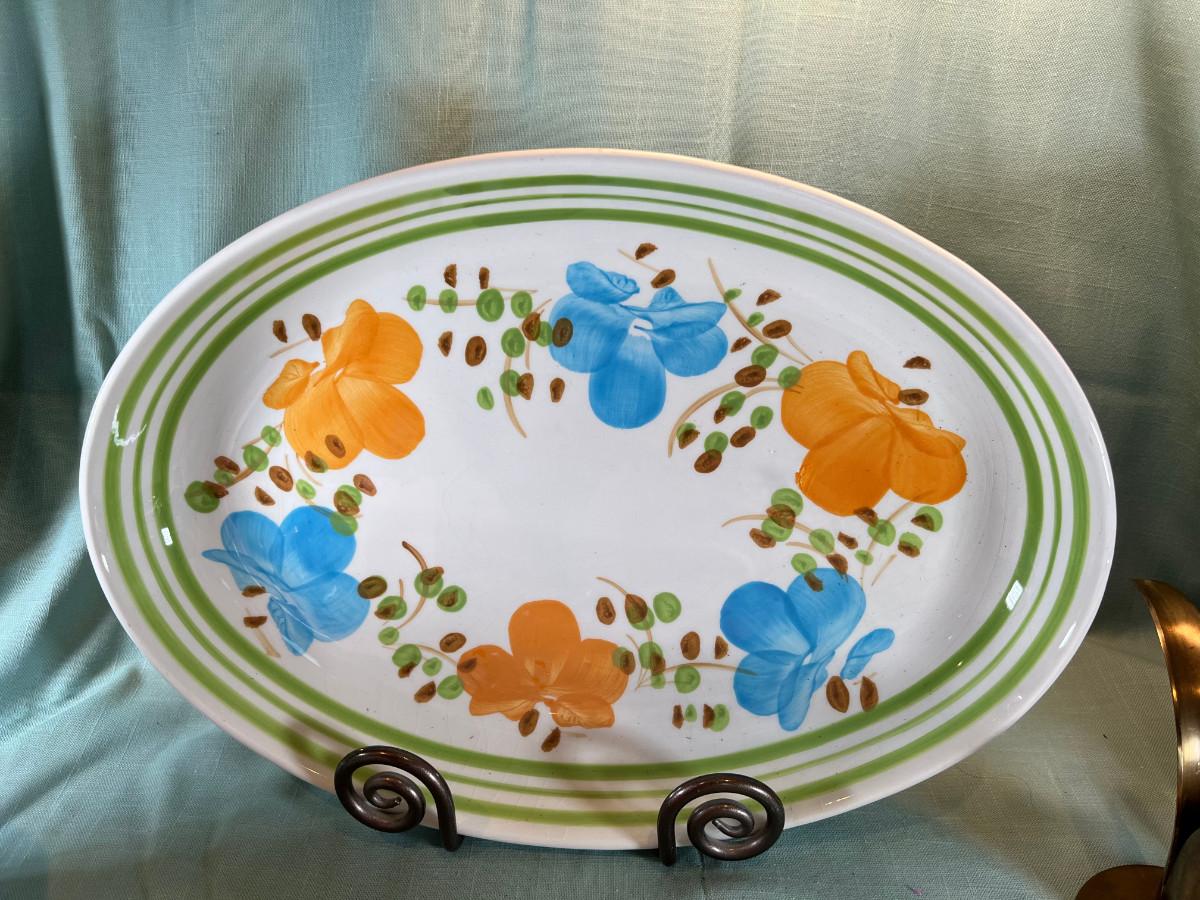 Amazing metal "Iris" candle holders, English Pimpernel new coasters in box, 3 floral canisters with wear to lids, Kronos single glass candle holder with large pink candle., Large Italian ironstone floral platter, Pfaltzgraff large bowl.