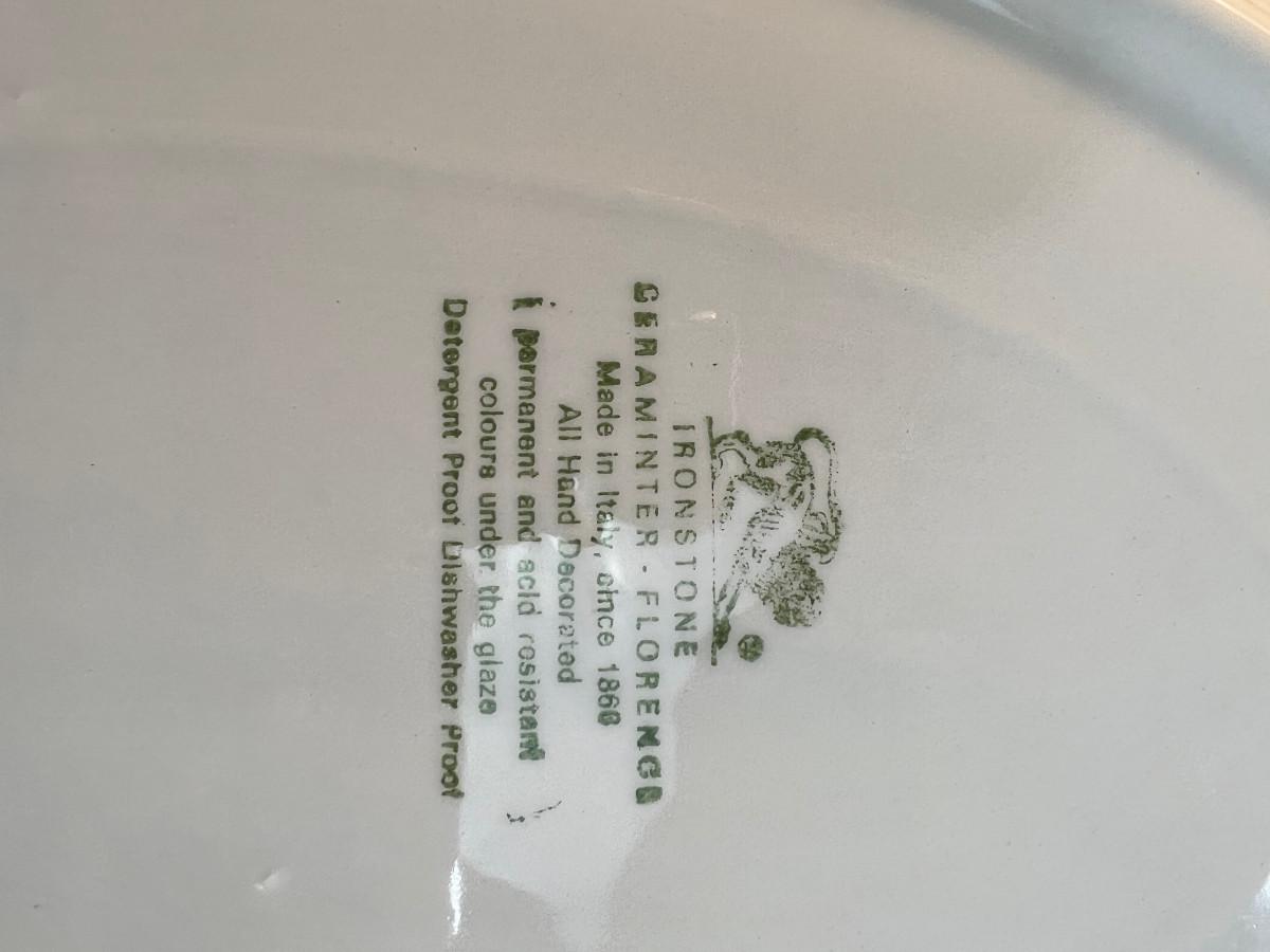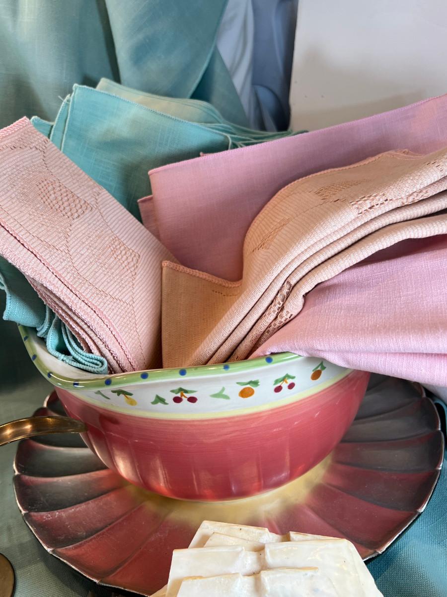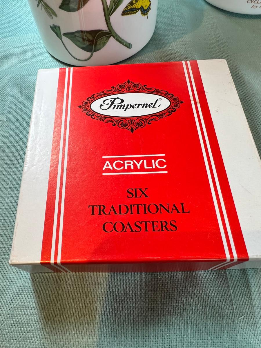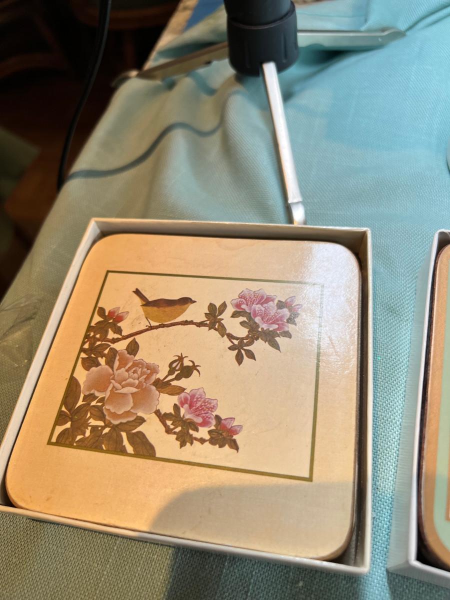 Amazing metal "Iris" candle holders, English Pimpernel new coasters in box, 3 floral canisters with wear to lids, Kronos single glass candle holder with large pink candle., Large Italian ironstone floral platter, Pfaltzgraff large bowl.
