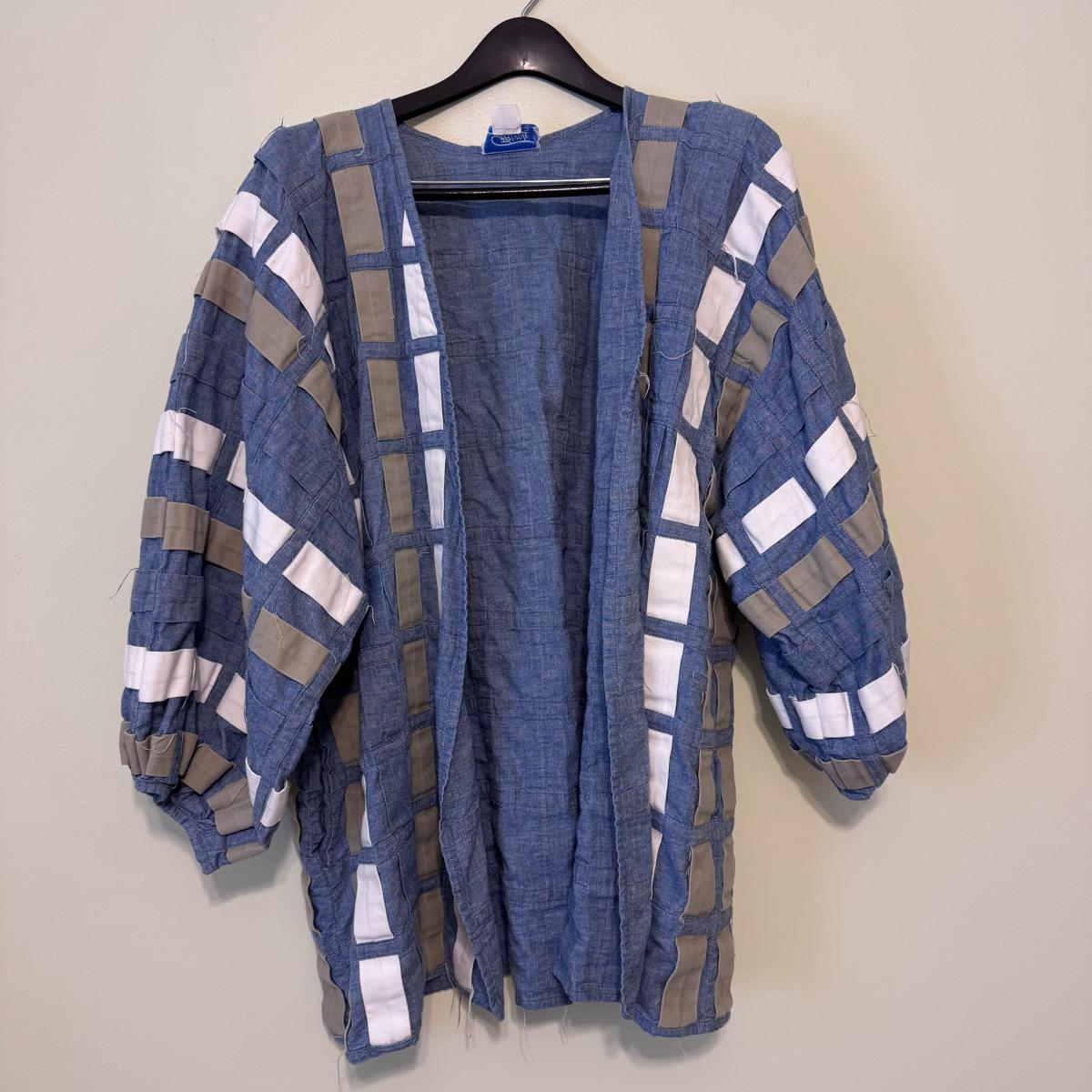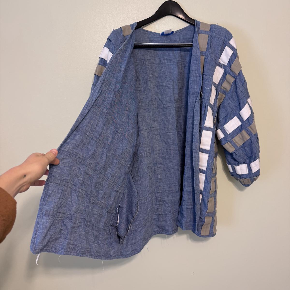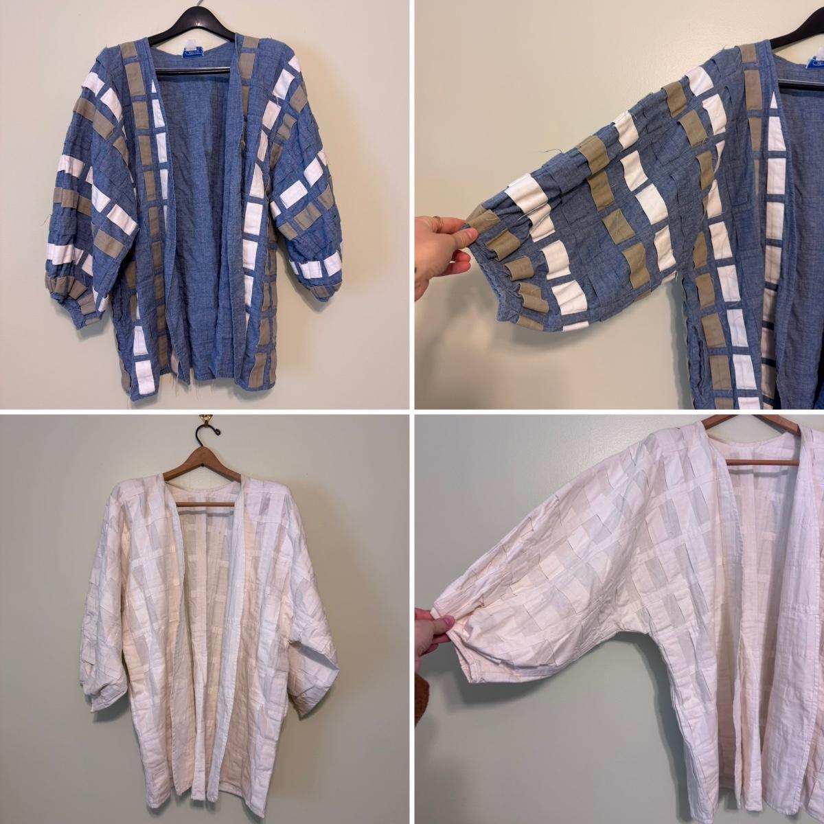 This lot includes two Frivole by Nicolle Robert woven cardigans - both sized at XL. The white woven cardigan is missing its tags. The blue one has some frayed threads. Shipping available.