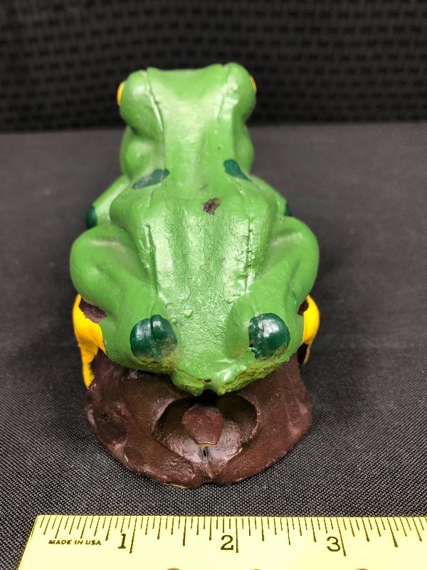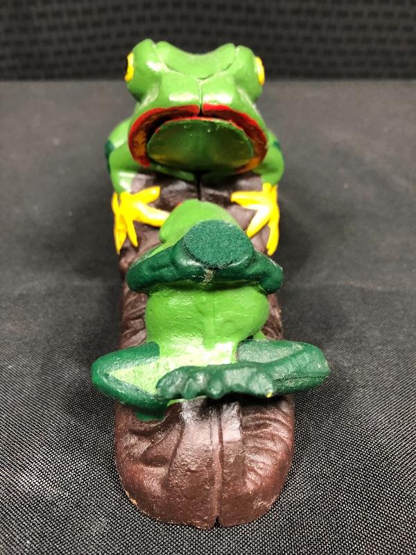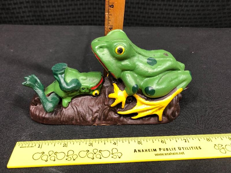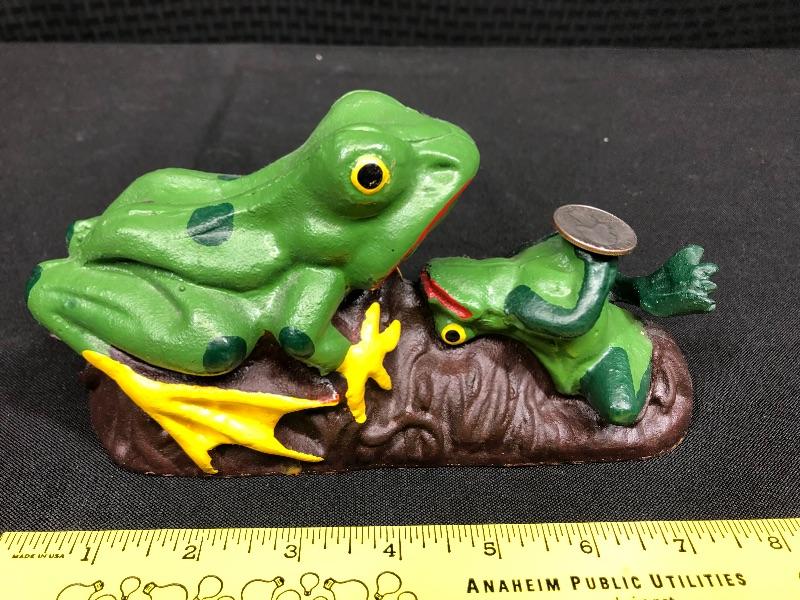 Heavy cast iron mechanical coin bank. Features green painted frogs, one flips coin into the others mouth. About 8" size. Nicely painted. #020-1220-00536
