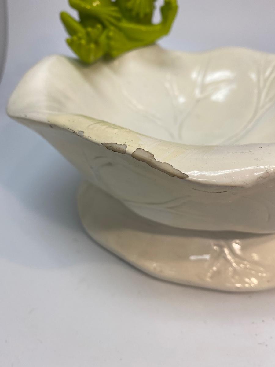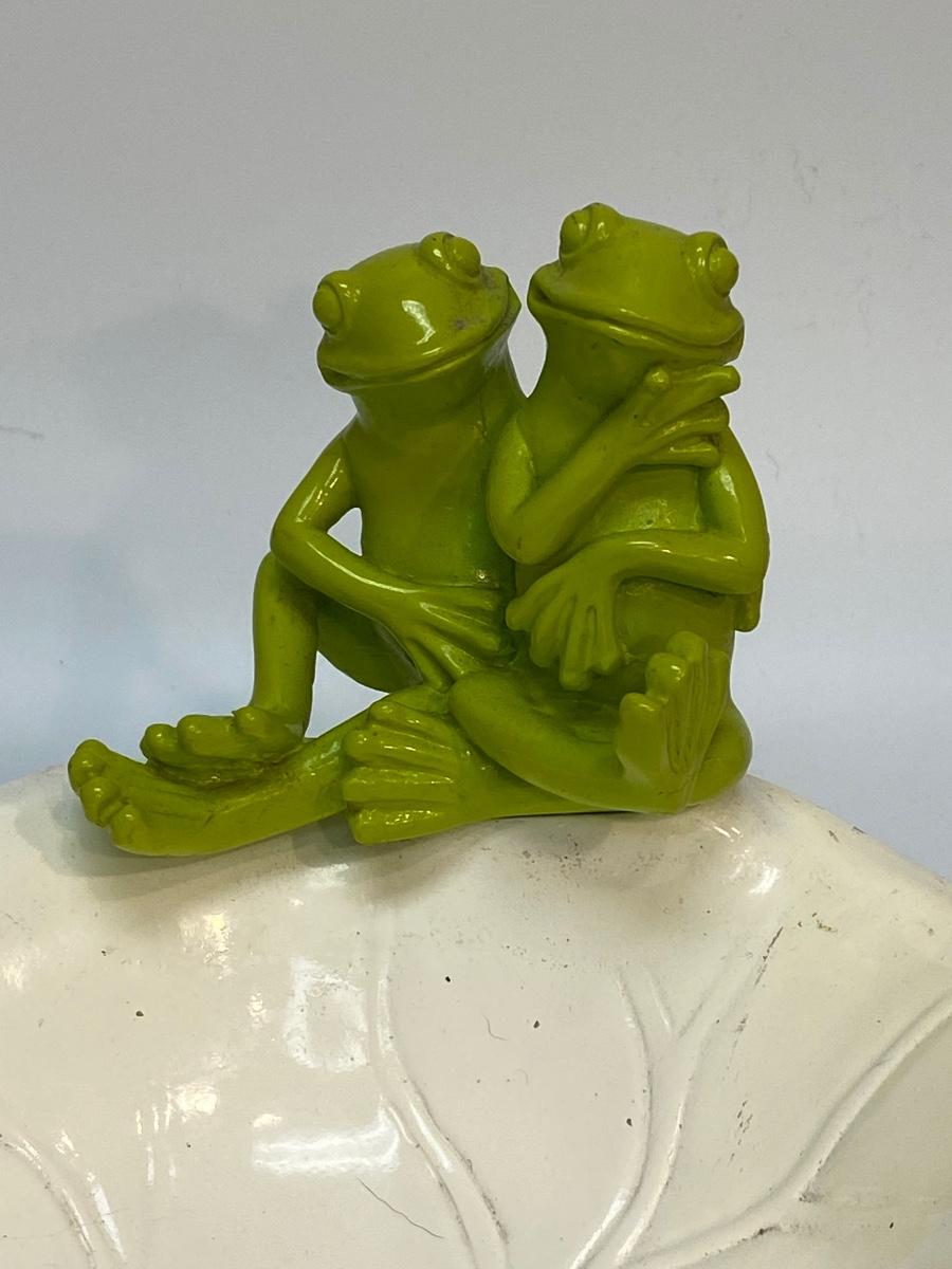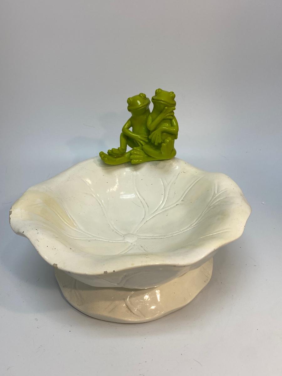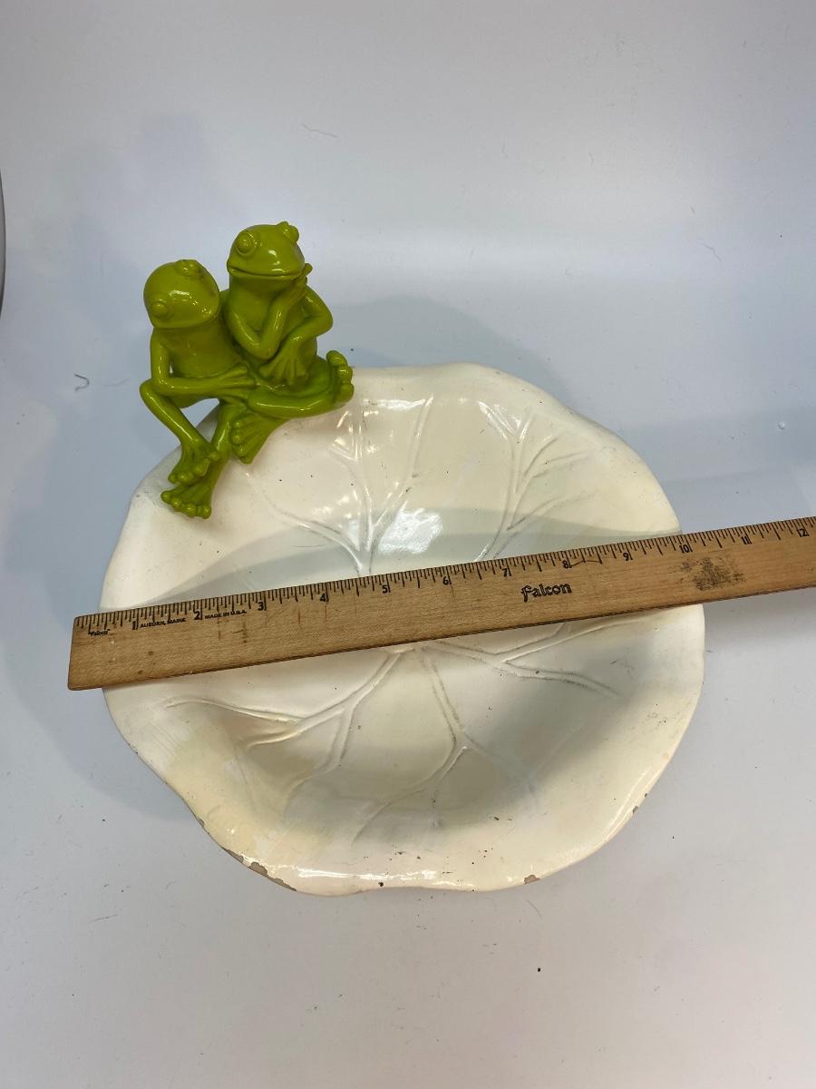 White lily pad shaped bird bath/seed bowl with a frog couple sitting on the edge. In outdoor weathered condition. There are chips in the paint but not in the bowl around the edge. Do not believe it is ceramic almost sounds like a composite material. Great for patio or garden. About 10" diameter.