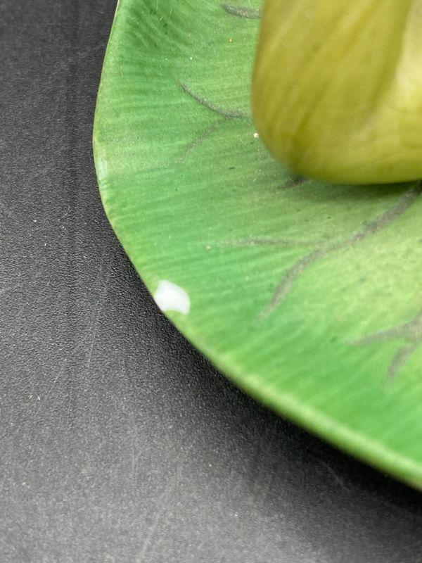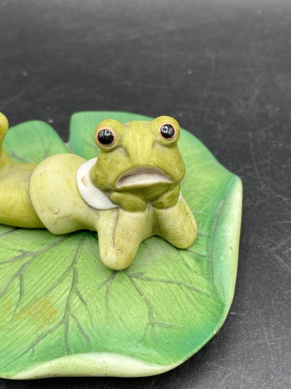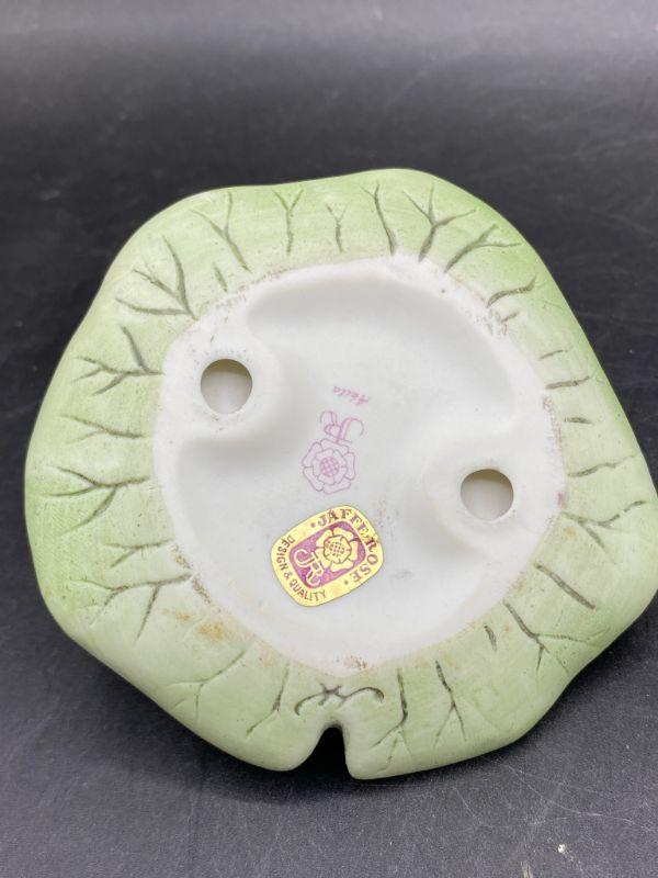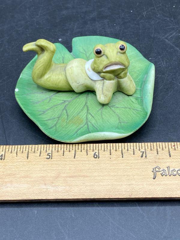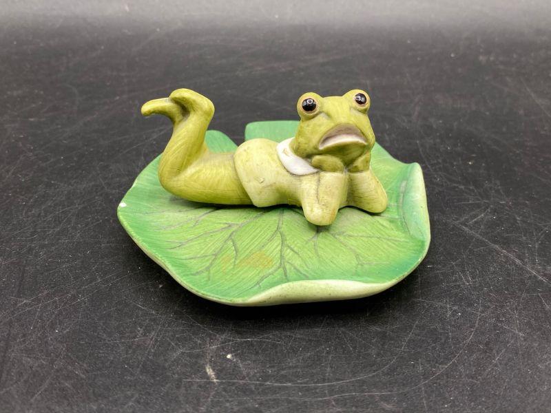 Frog laying on a lily pad figurine. Made by Jaffe Rose. Has a small chip along the edge of lily pad but displays nicely.