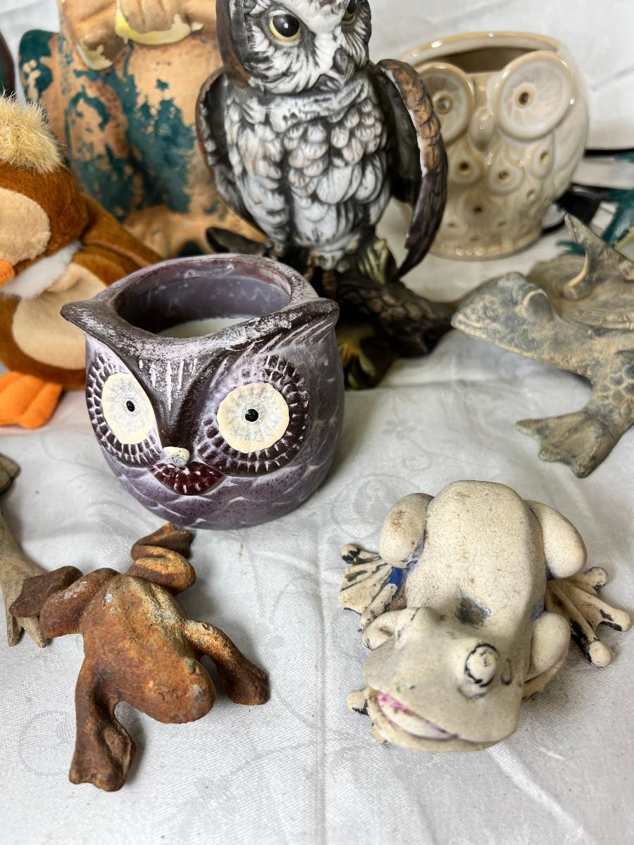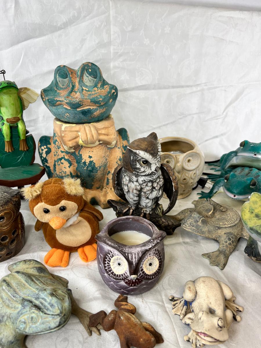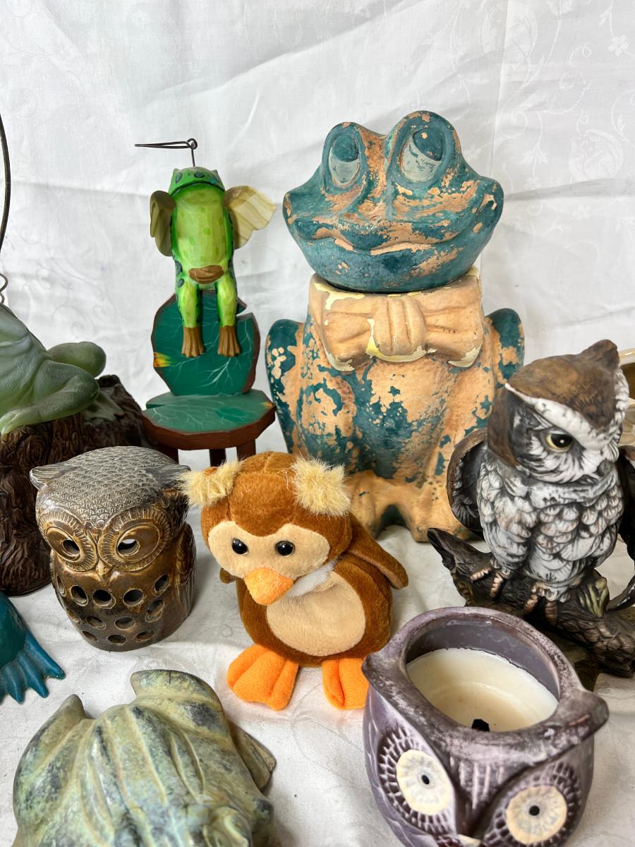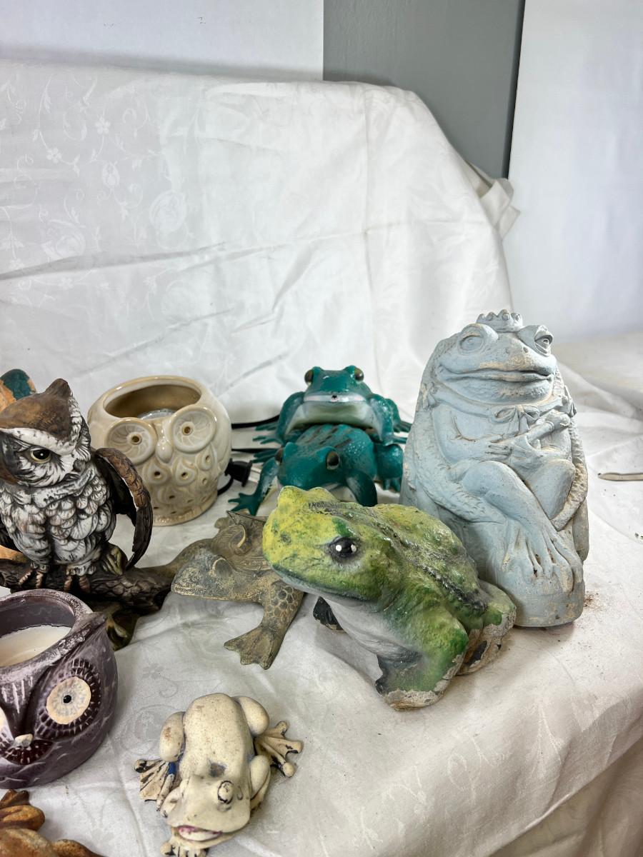 Frog figurines, plastic, ceramics, Owls, night lights wire basket, frog dial.