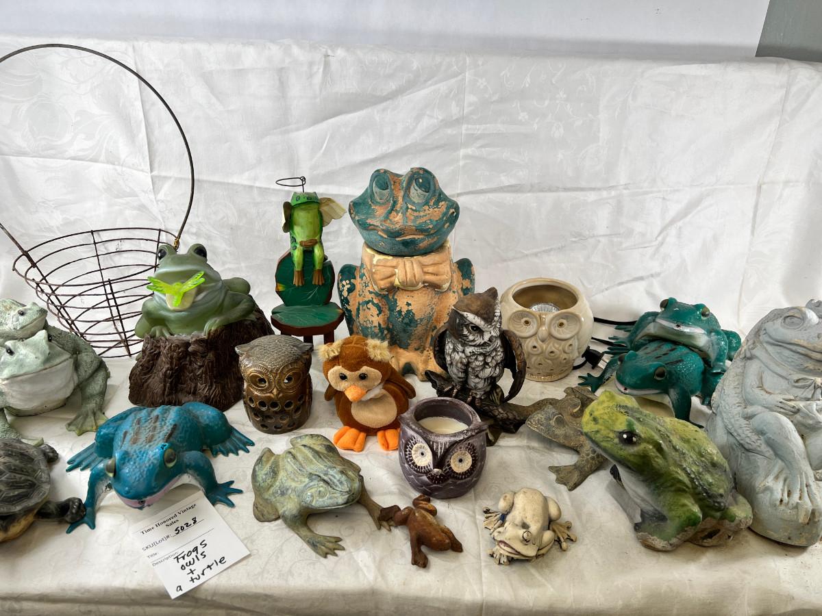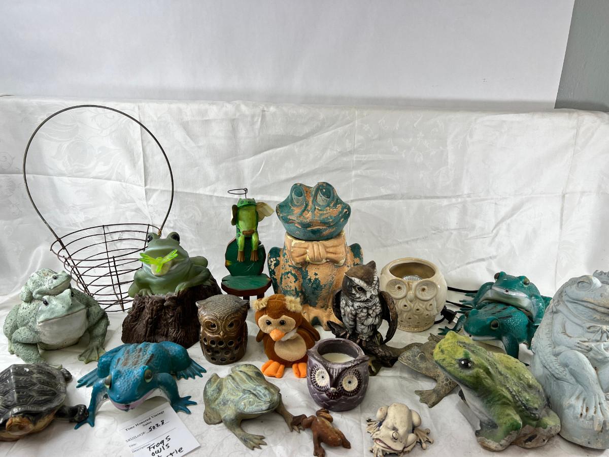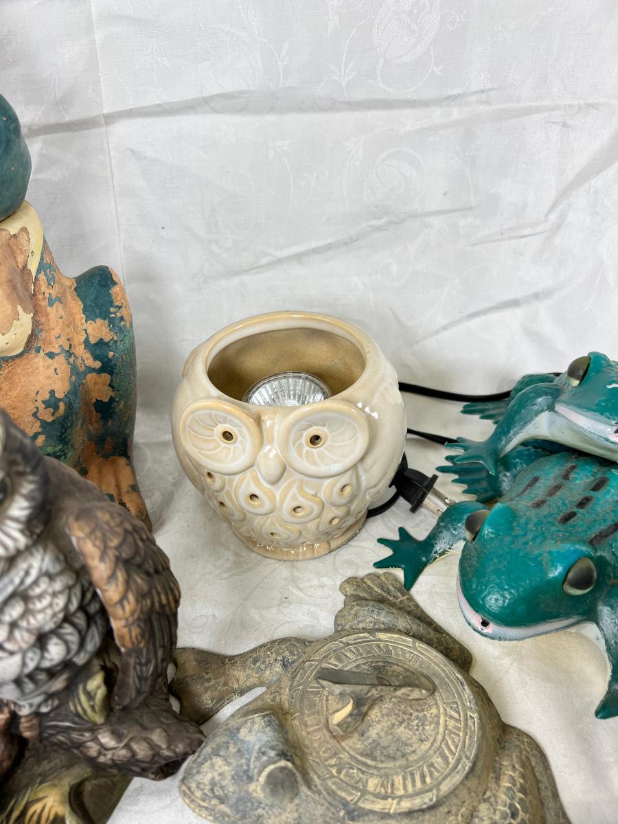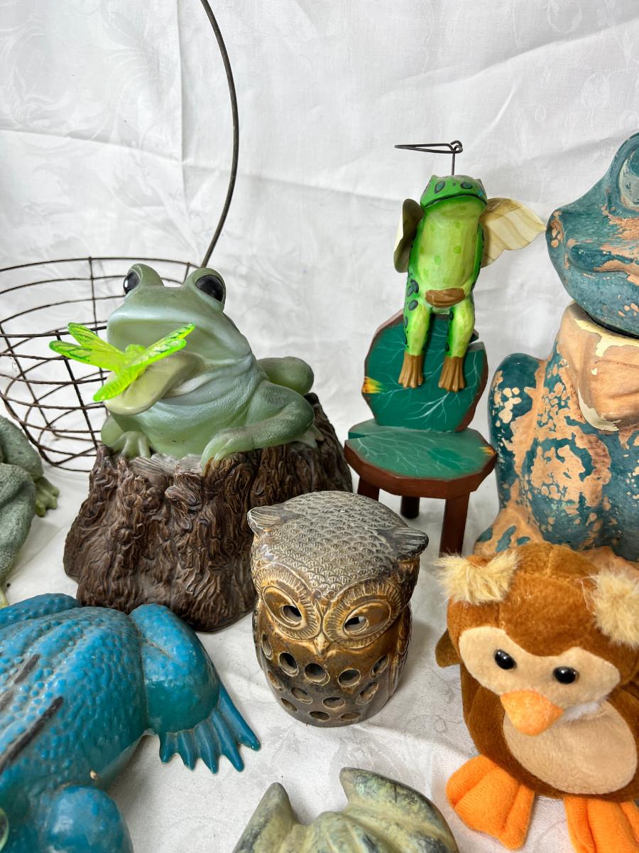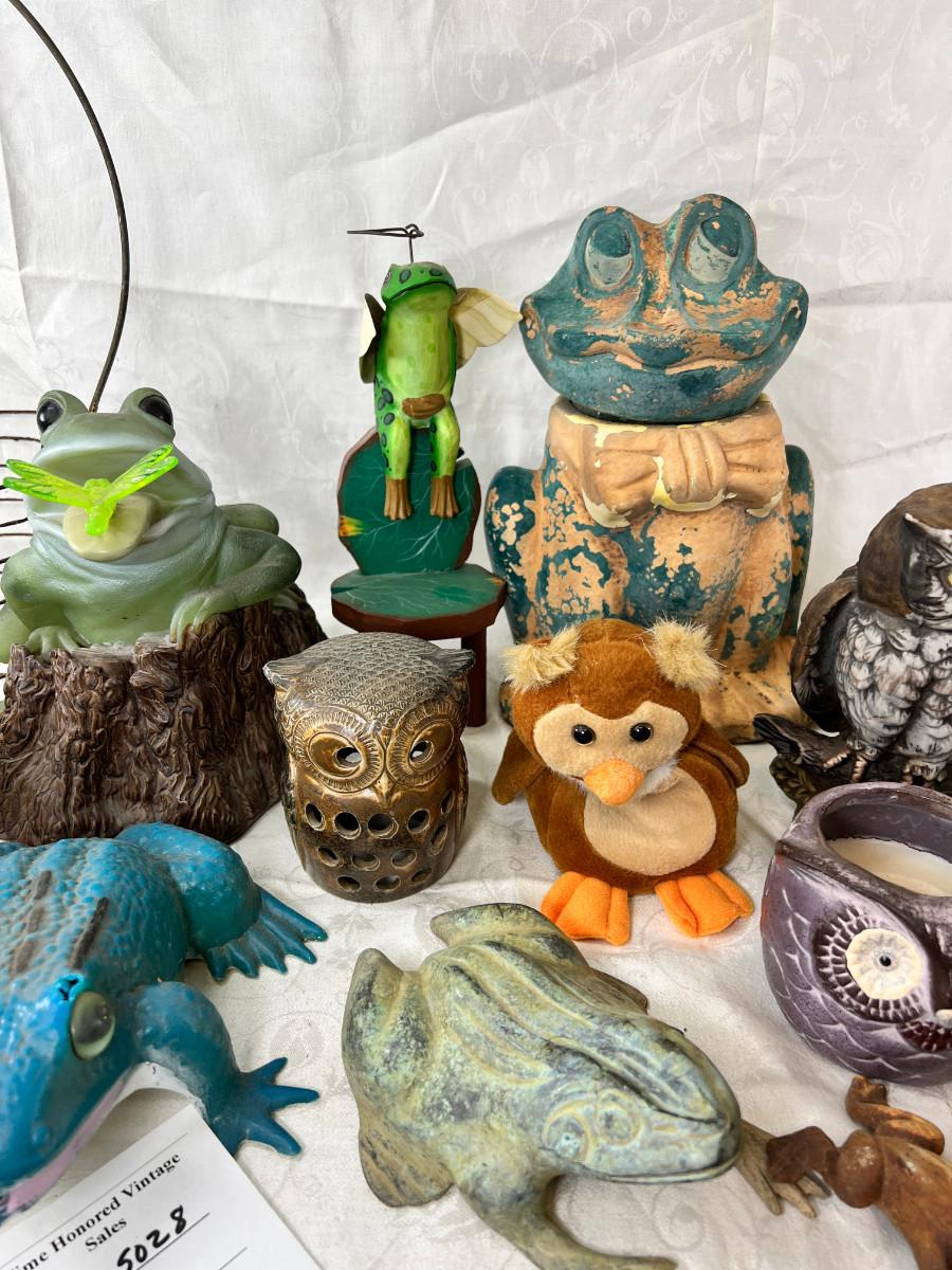 Frog figurines, plastic, ceramics, Owls, night lights wire basket, frog dial.