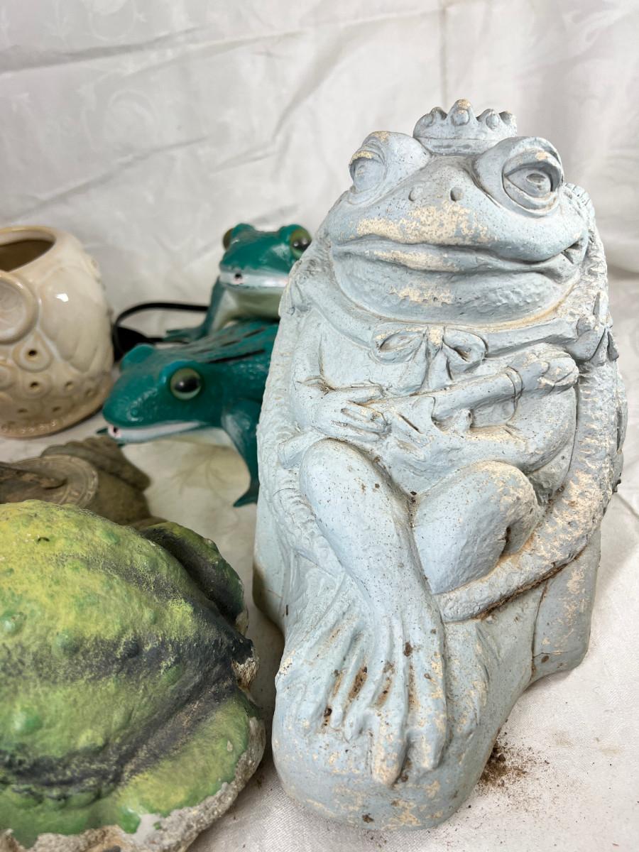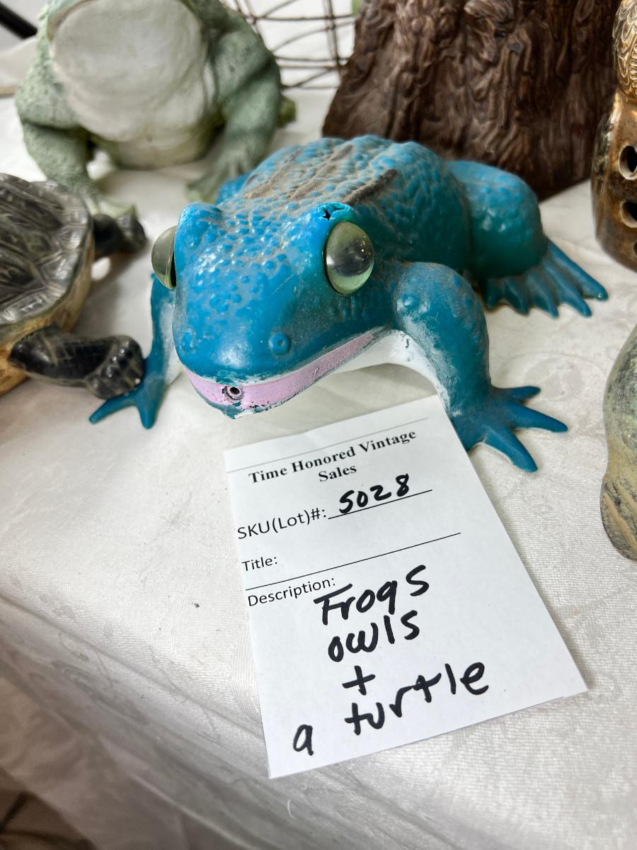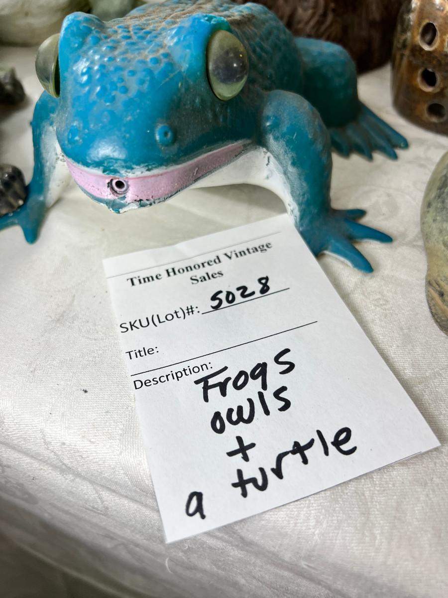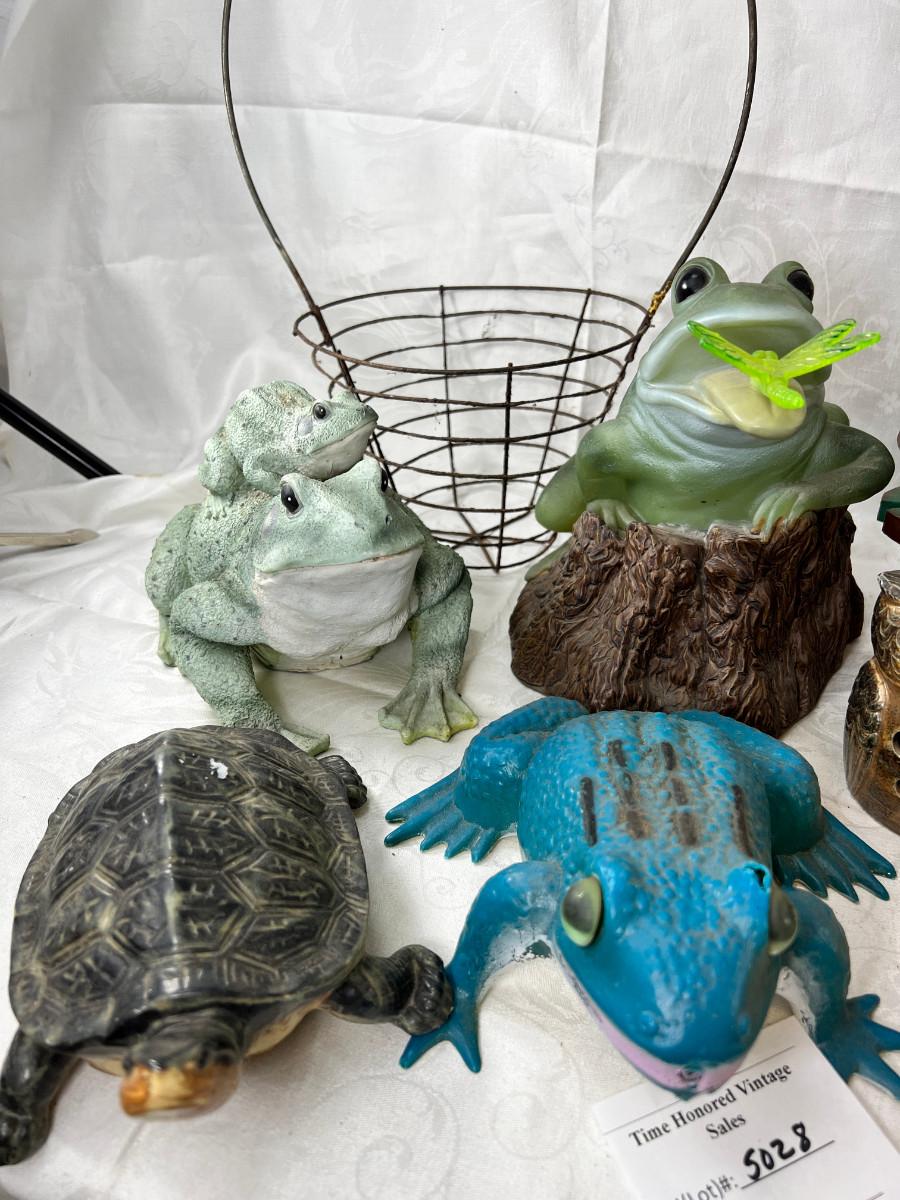 Frog figurines, plastic, ceramics, Owls, night lights wire basket, frog dial.