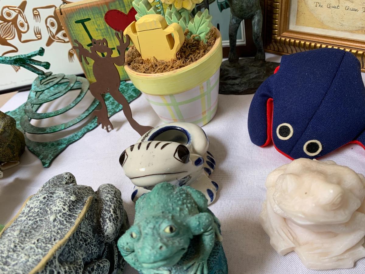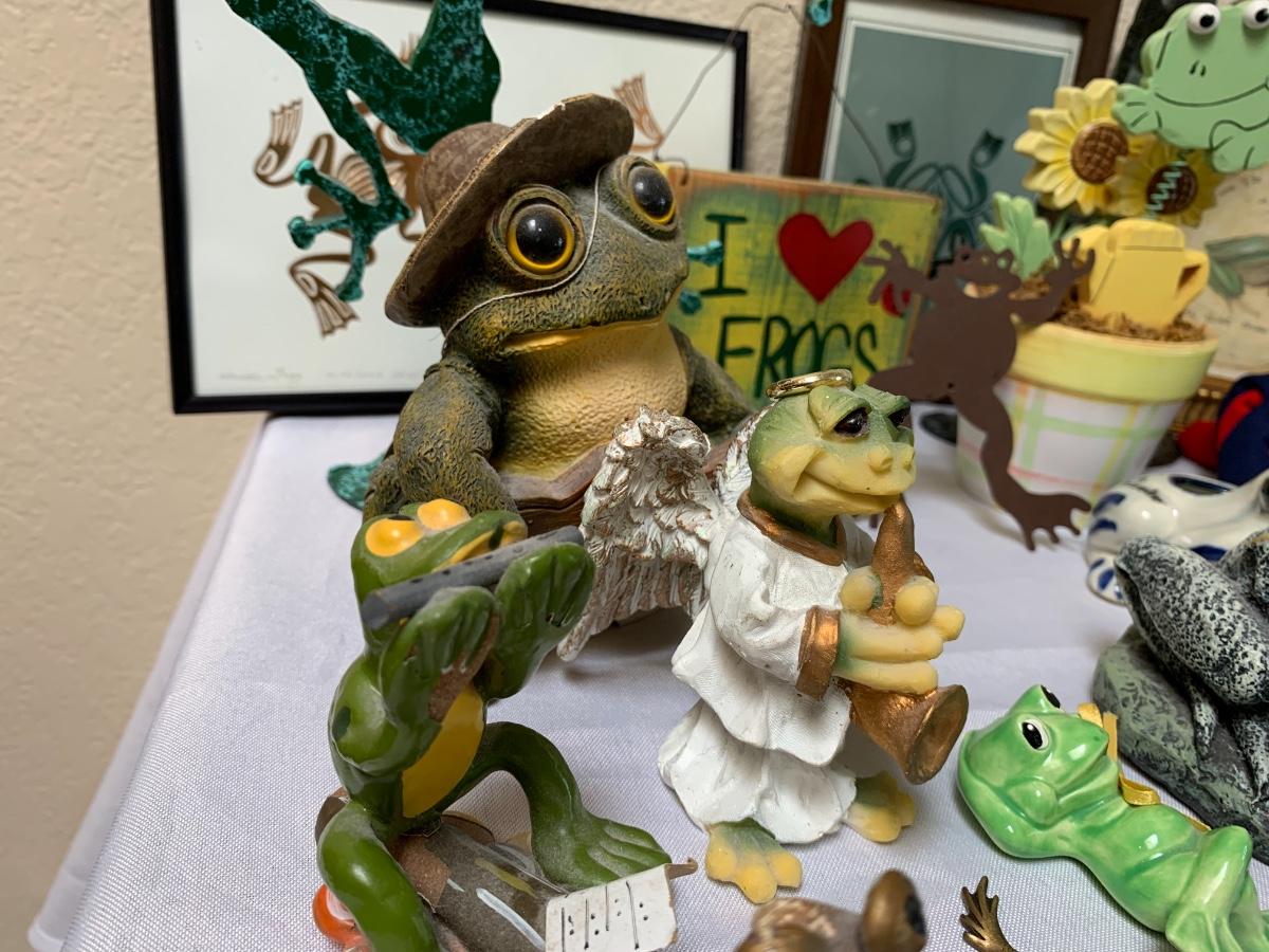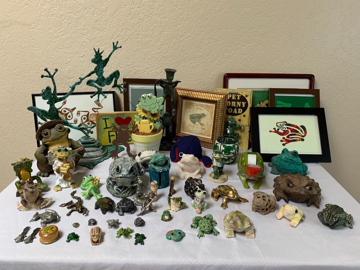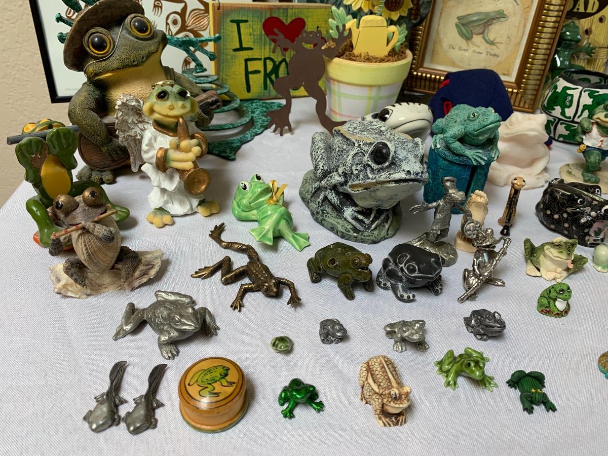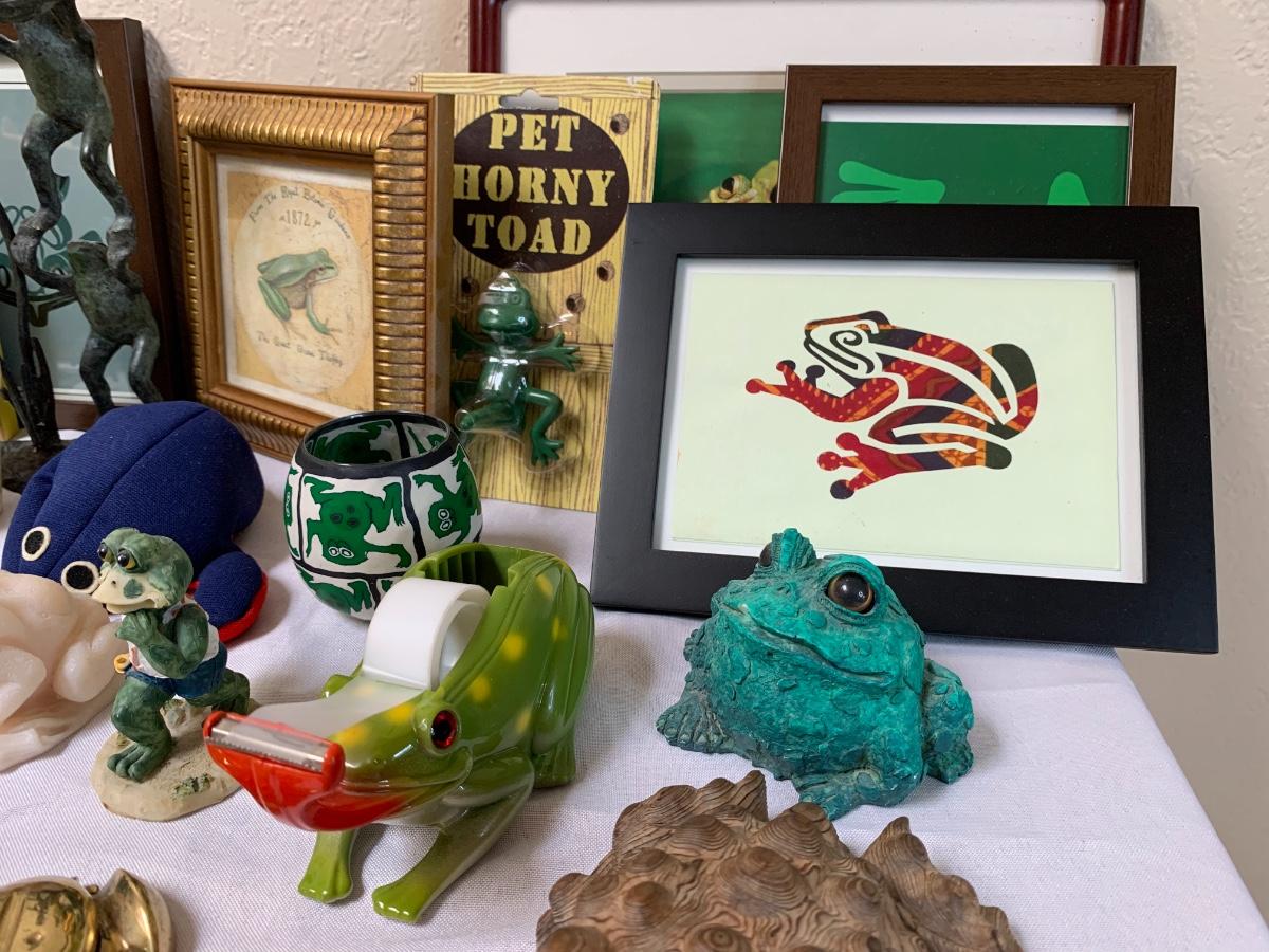 Assortment of frog figurines, frog artwork and more. Perfect for any frog lover! Tallest frog item is 13 inches, smallest is .5 inches