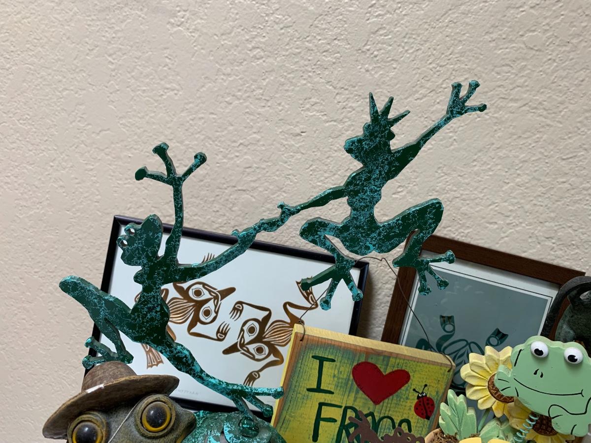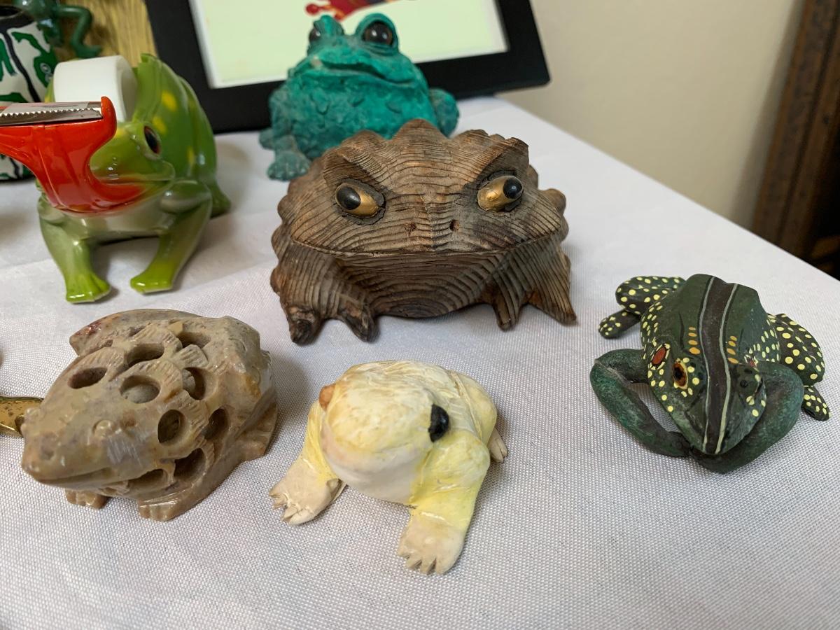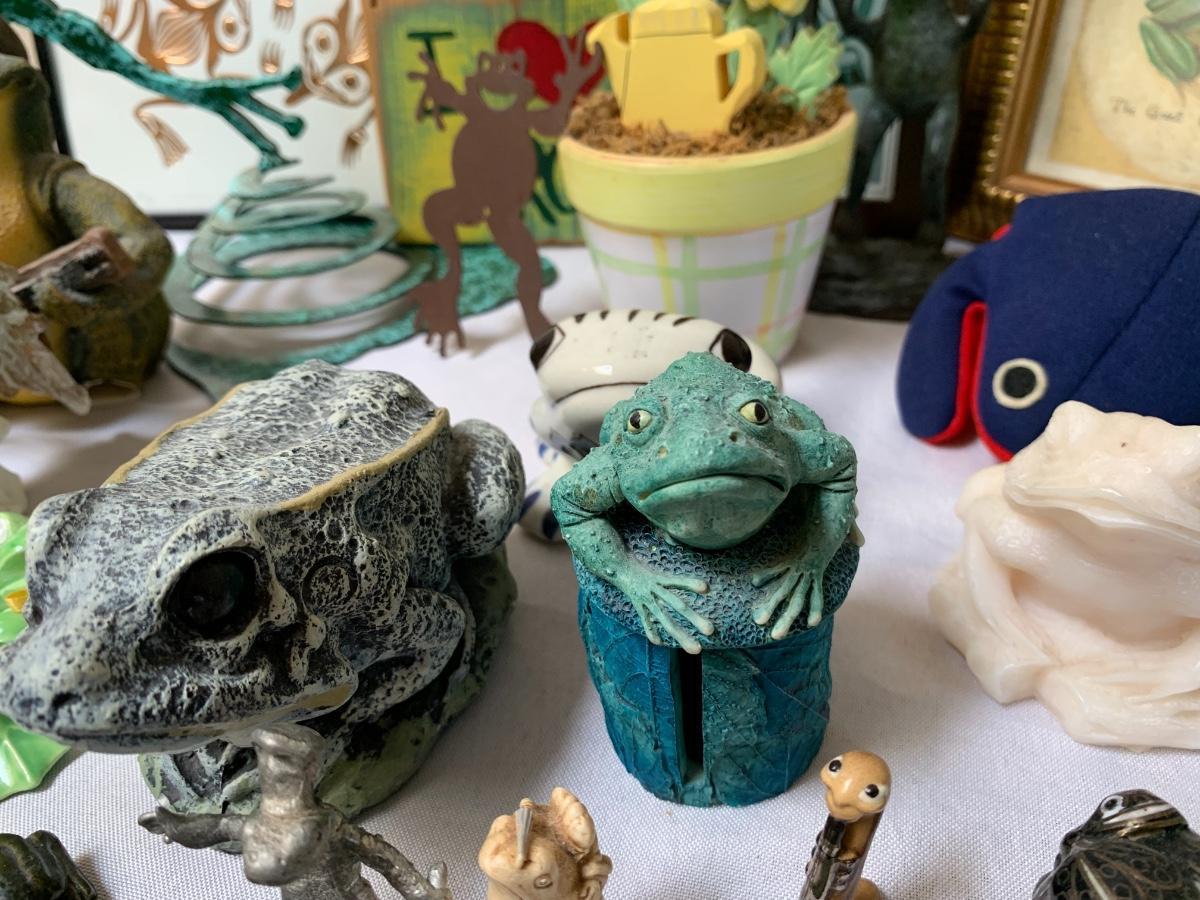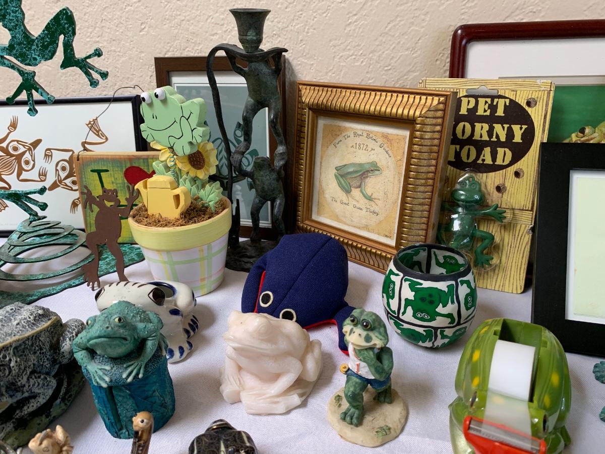 Assortment of frog figurines, frog artwork and more. Perfect for any frog lover! Tallest frog item is 13 inches, smallest is .5 inches
