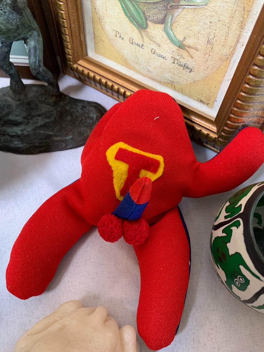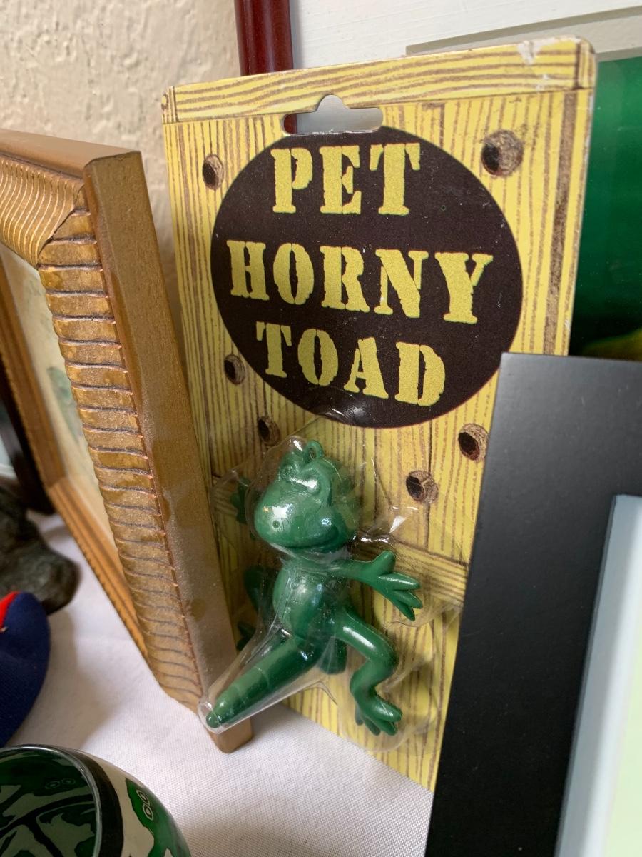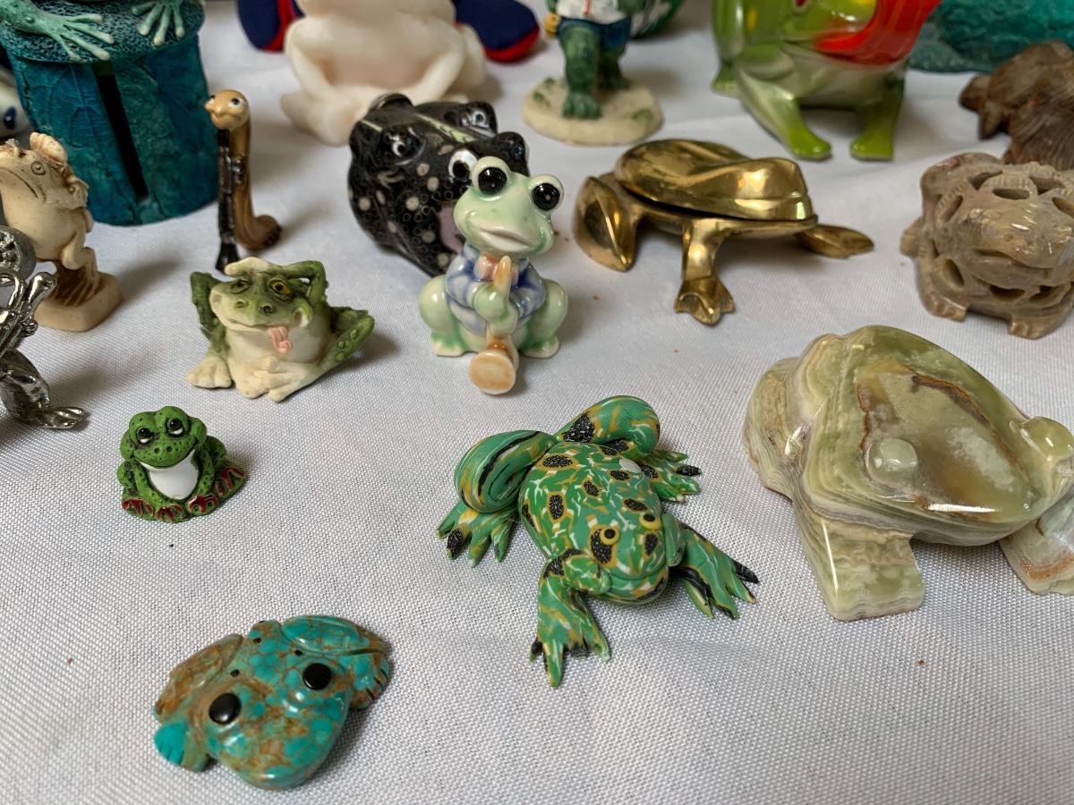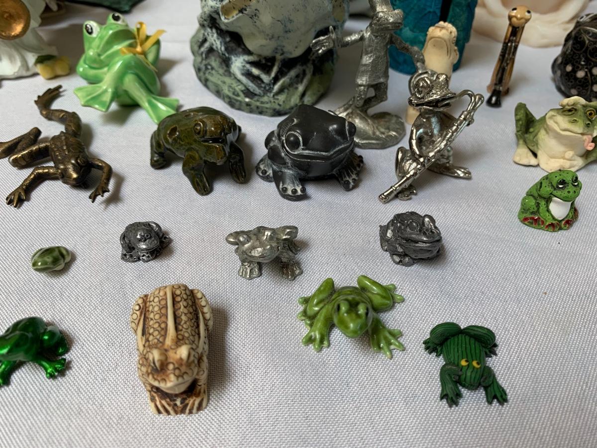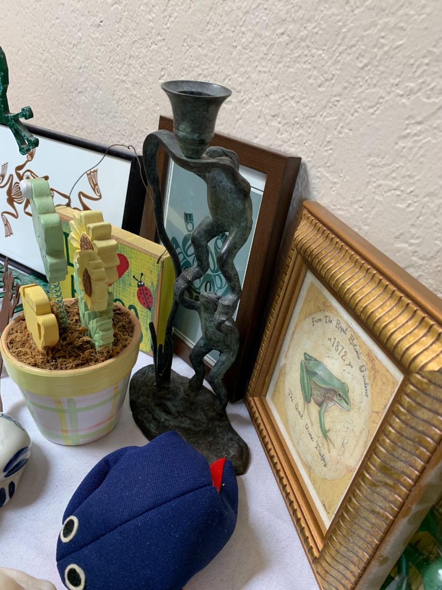 Assortment of frog figurines, frog artwork and more. Perfect for any frog lover! Tallest frog item is 13 inches, smallest is .5 inches