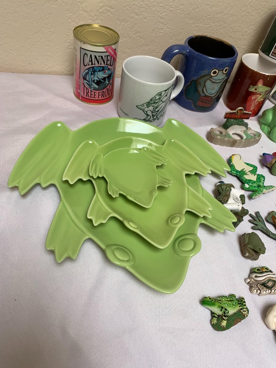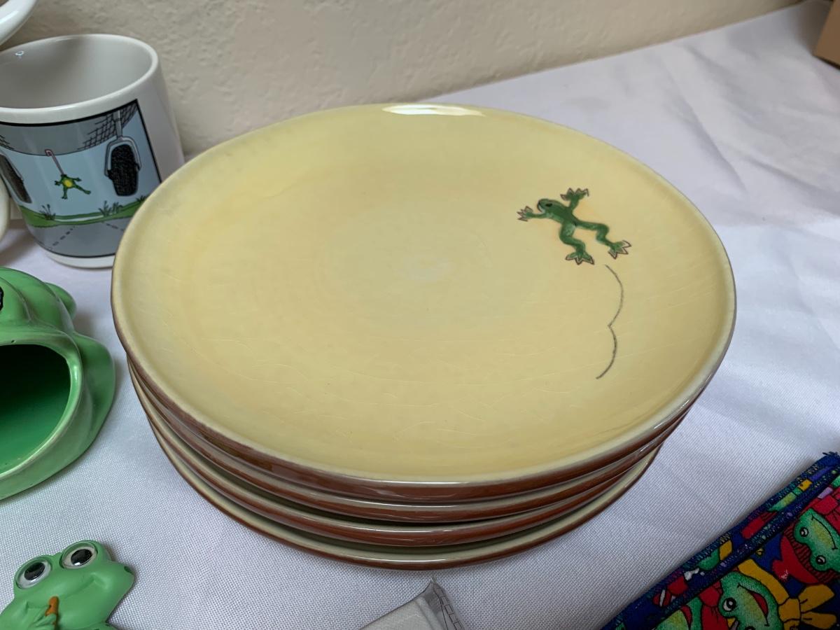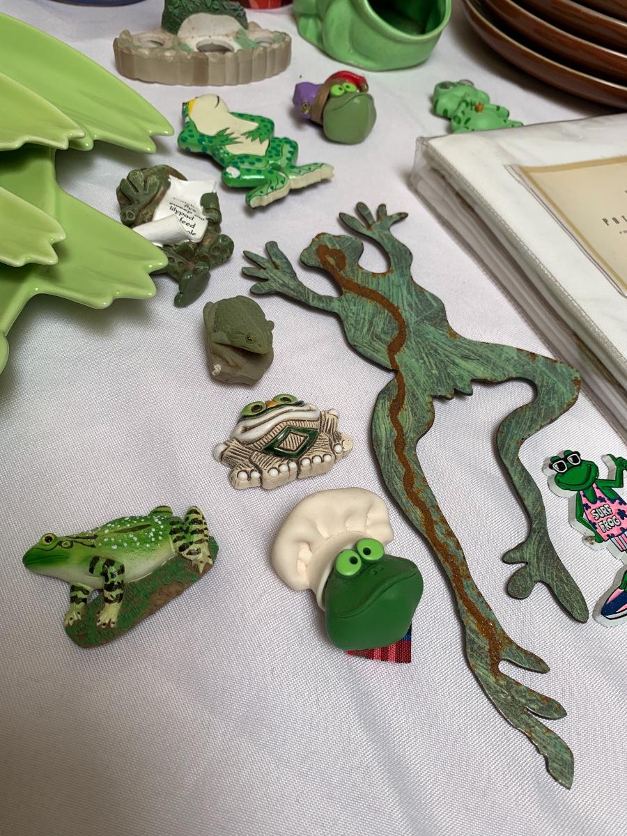 Assorted frog kitchen decor including plates (pottery barn), napkins (pottery barn), one frog sponge holder, mugs and magnets. Perfect for the frog lover in your life! Largest green frog plate is 11 inches