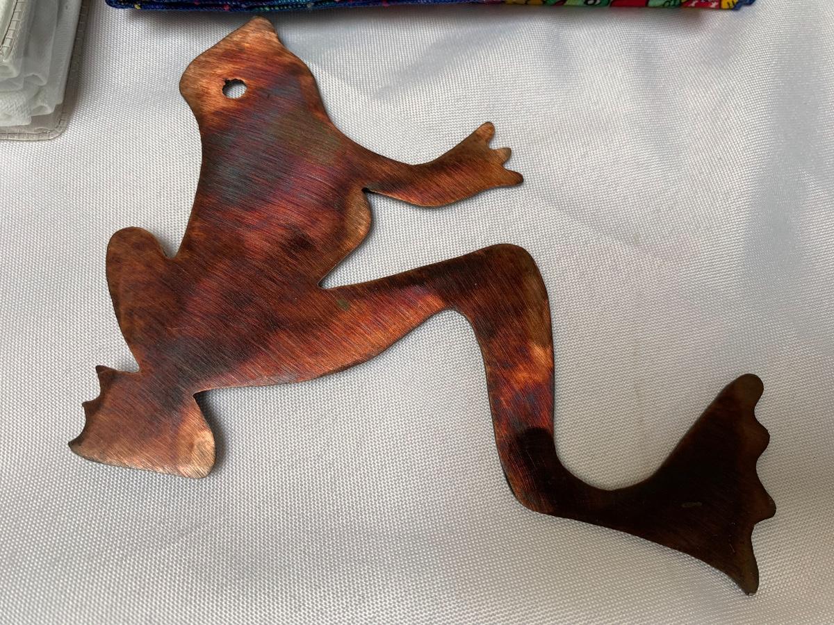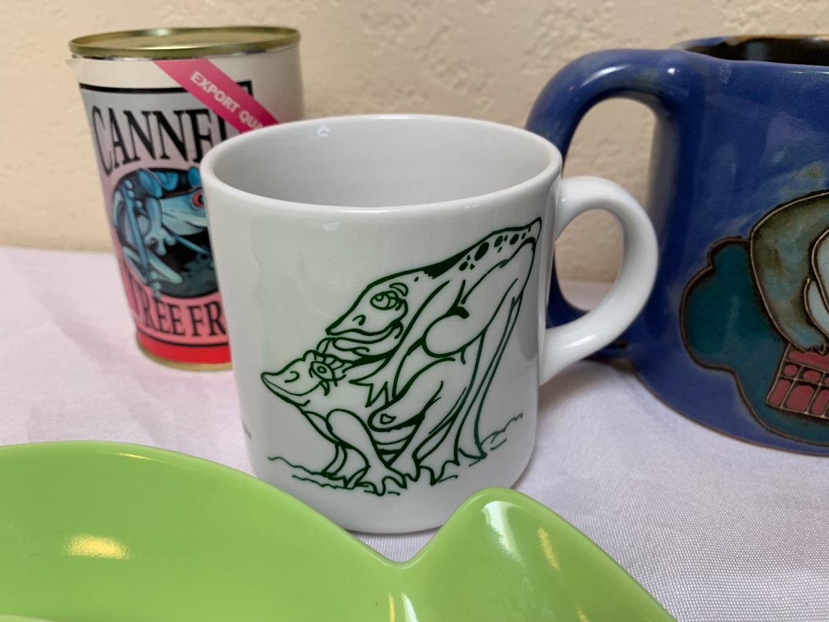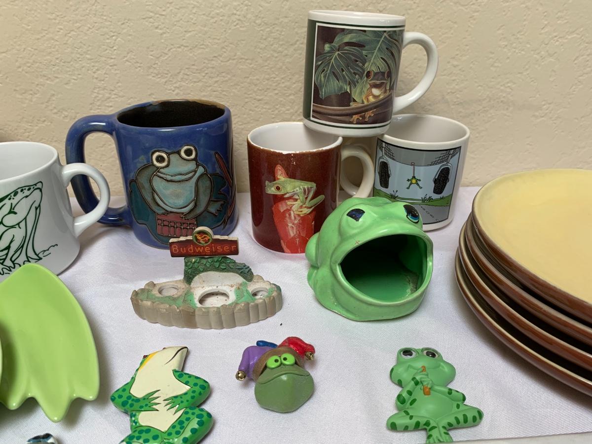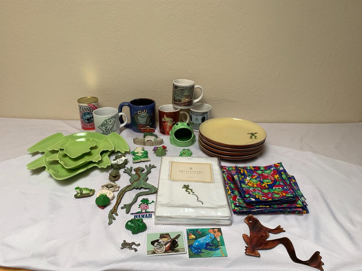 Assorted frog kitchen decor including plates (pottery barn), napkins (pottery barn), one frog sponge holder, mugs and magnets. Perfect for the frog lover in your life! Largest green frog plate is 11 inches