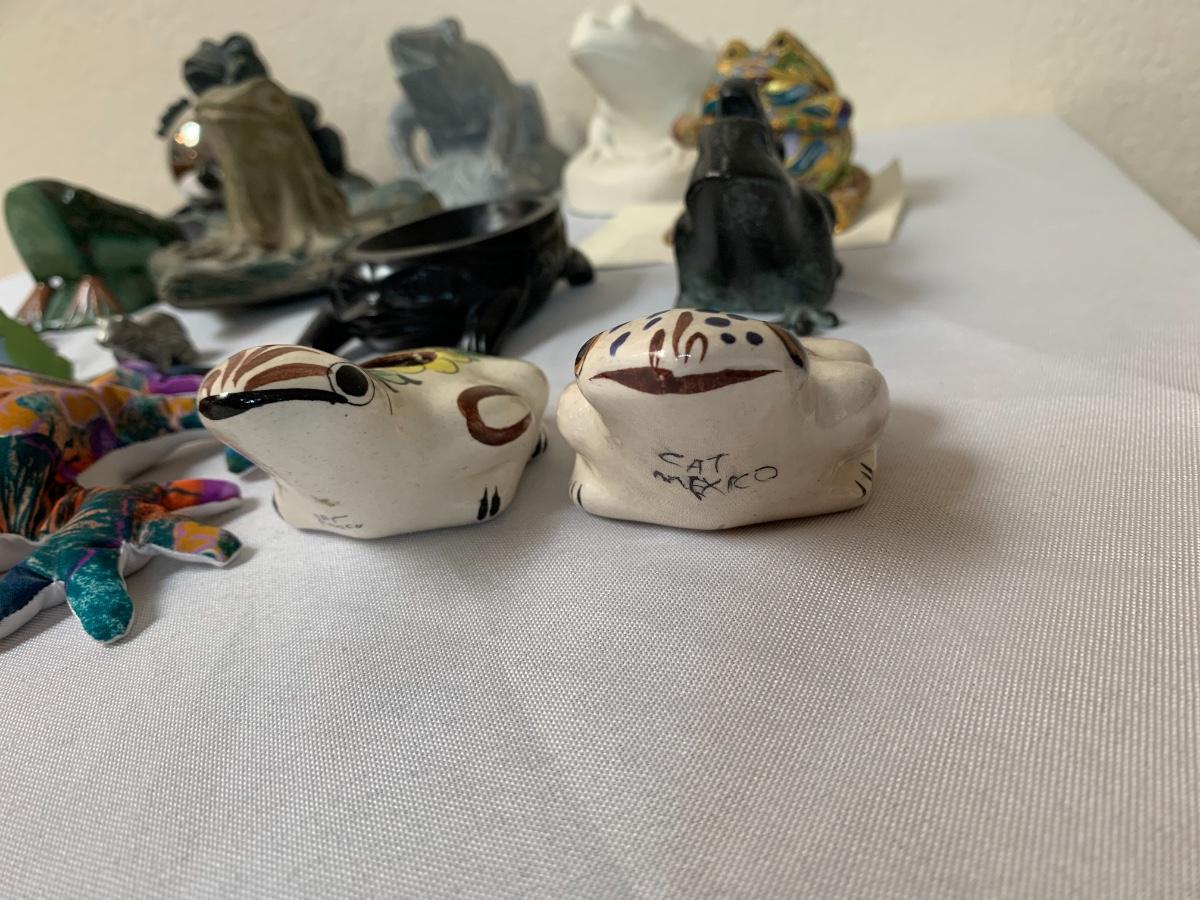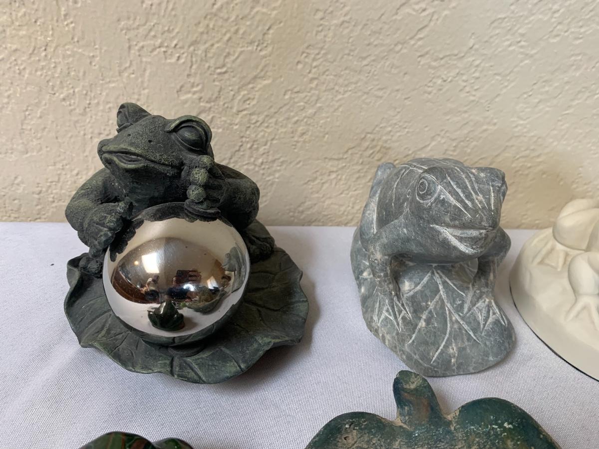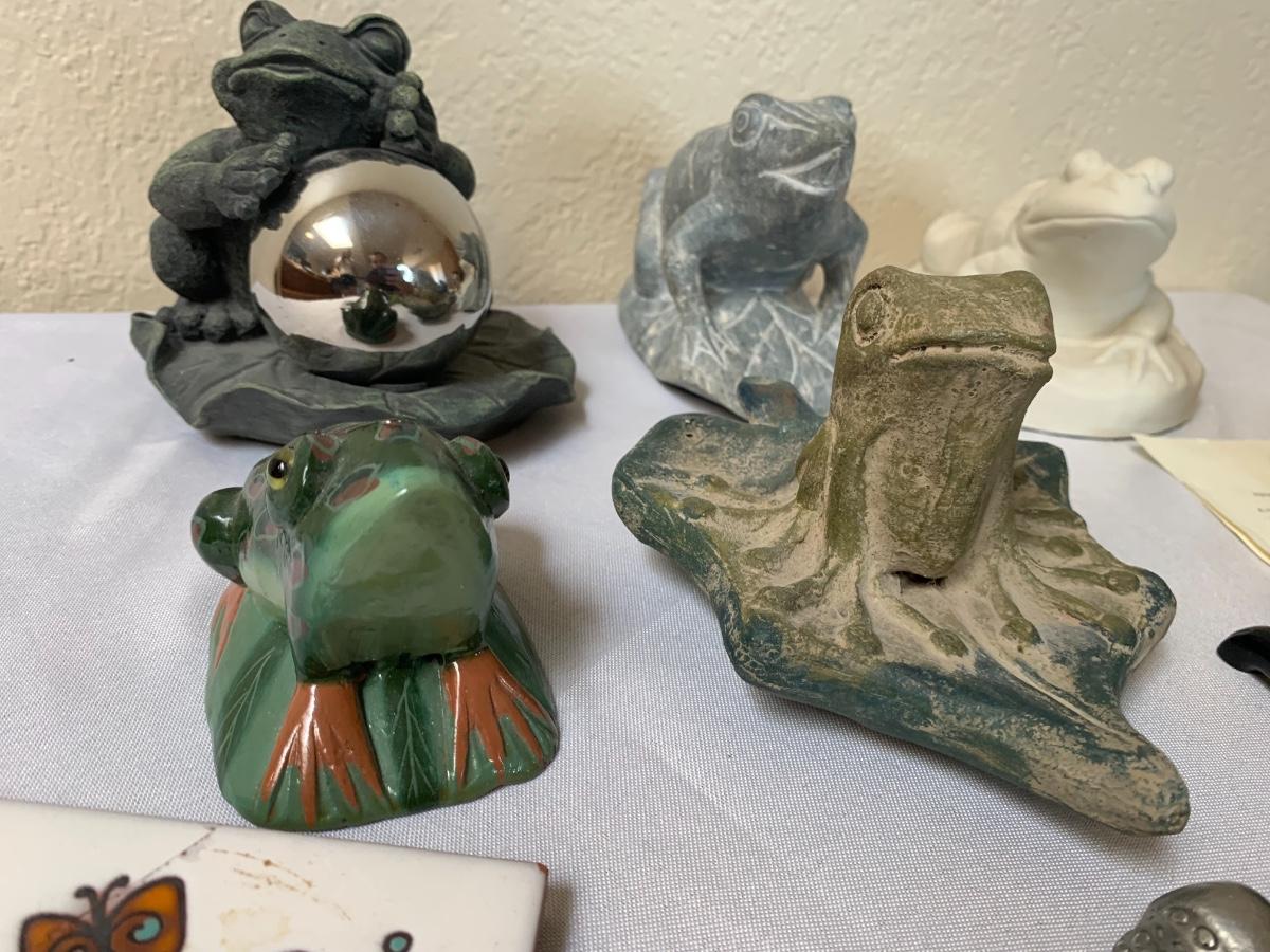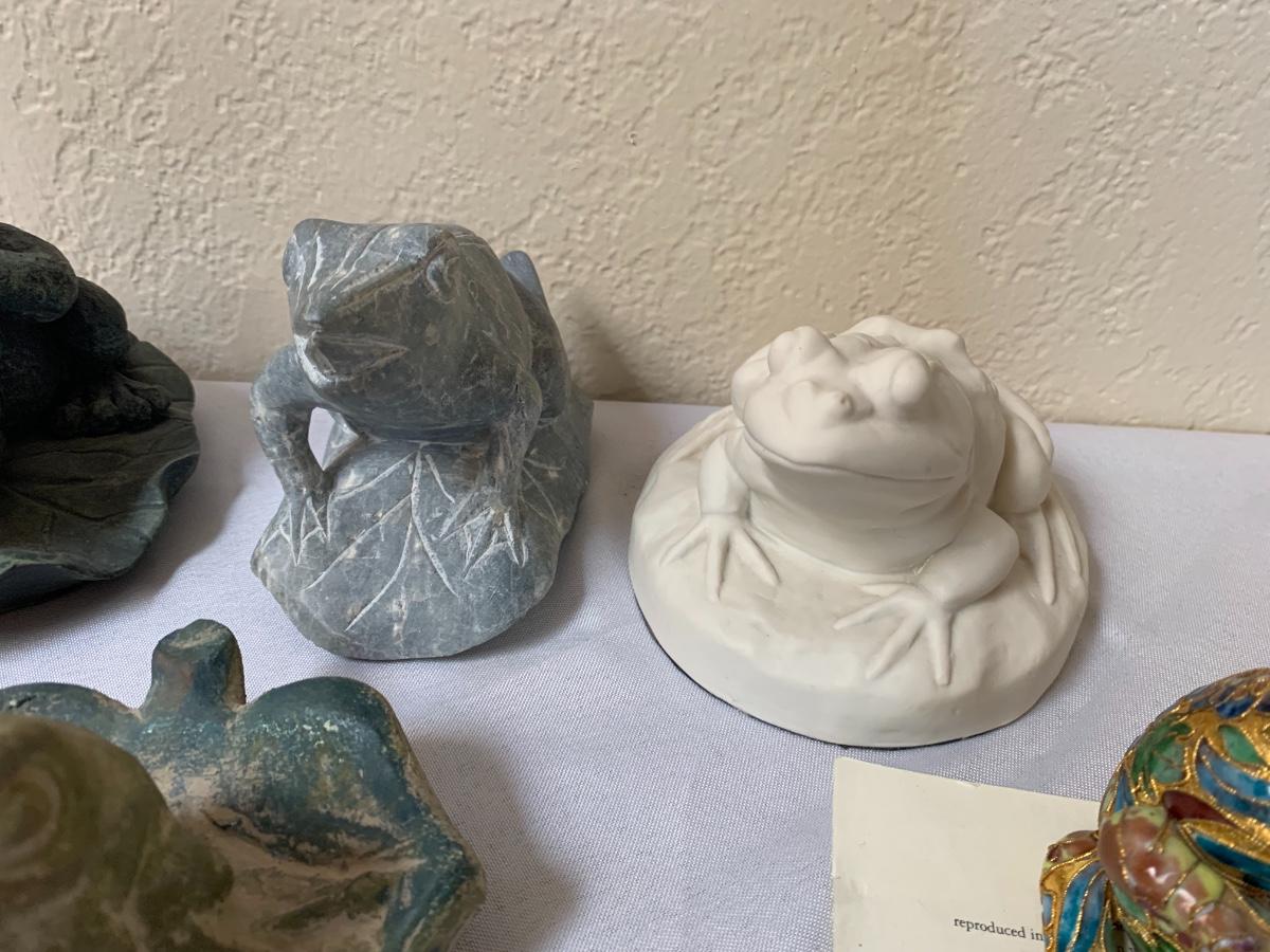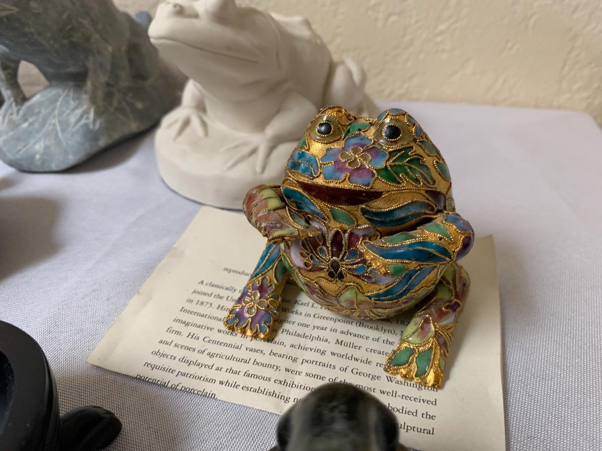 Assorted glass, stone, ceramic, tile (has a repaired crack), metal, cloisonné, resin and fabric frogs. All in great condition with the exception of the tile frog as mentioned.