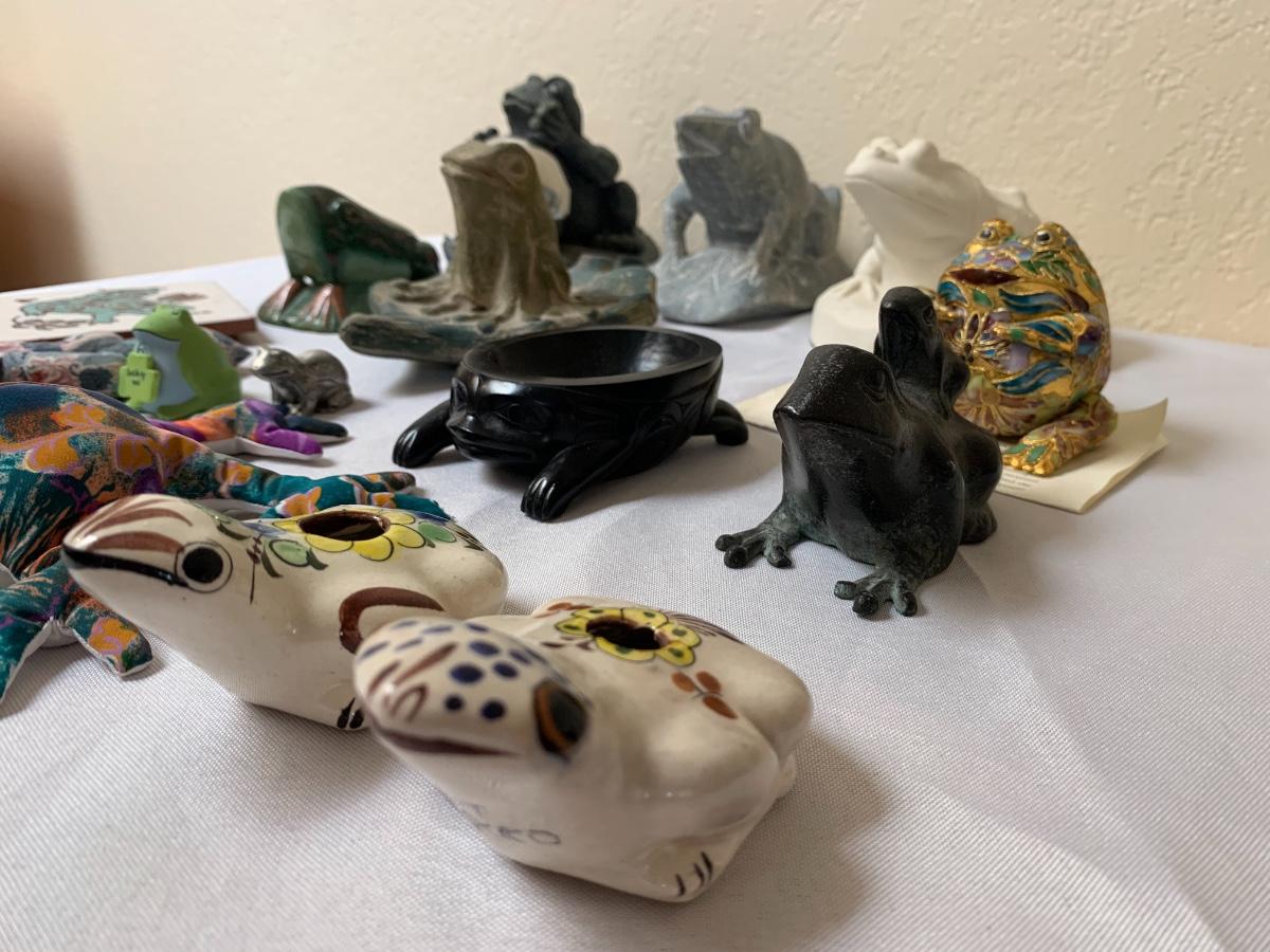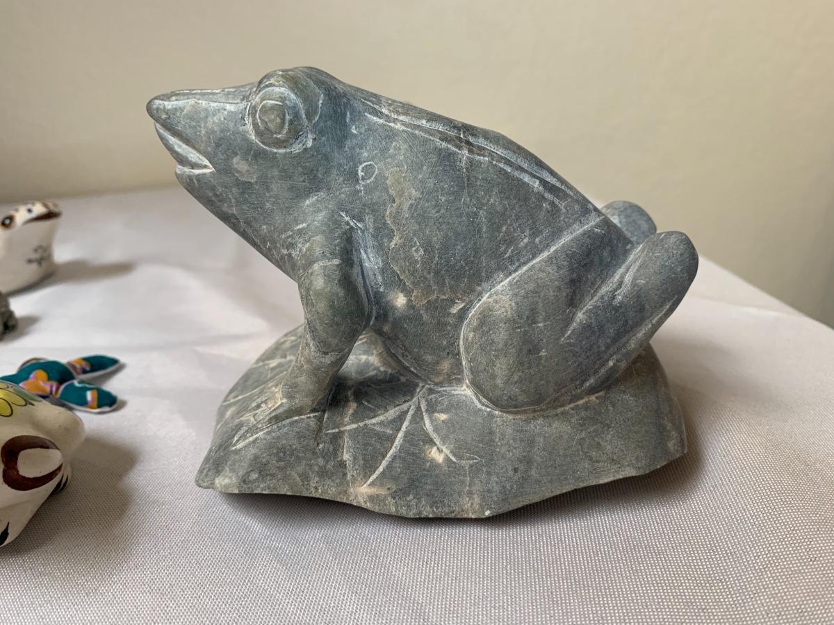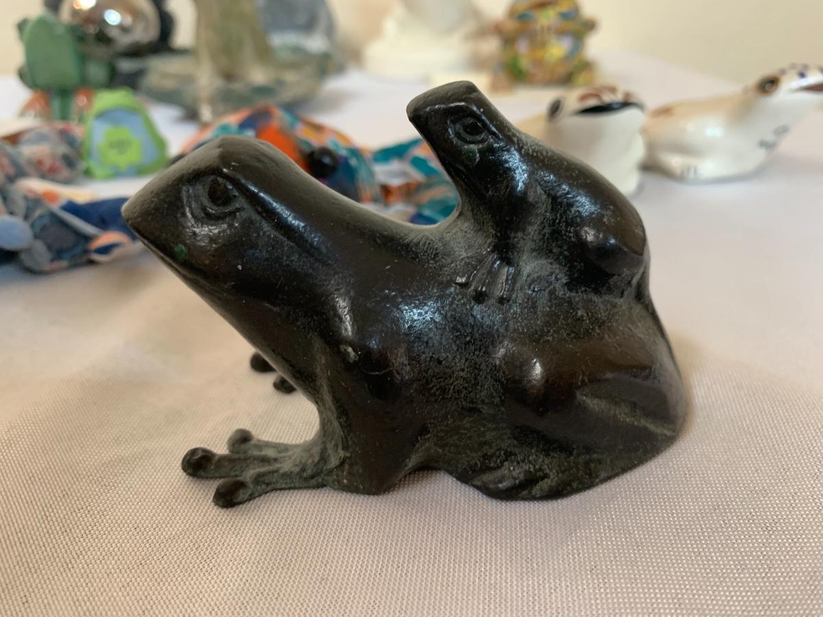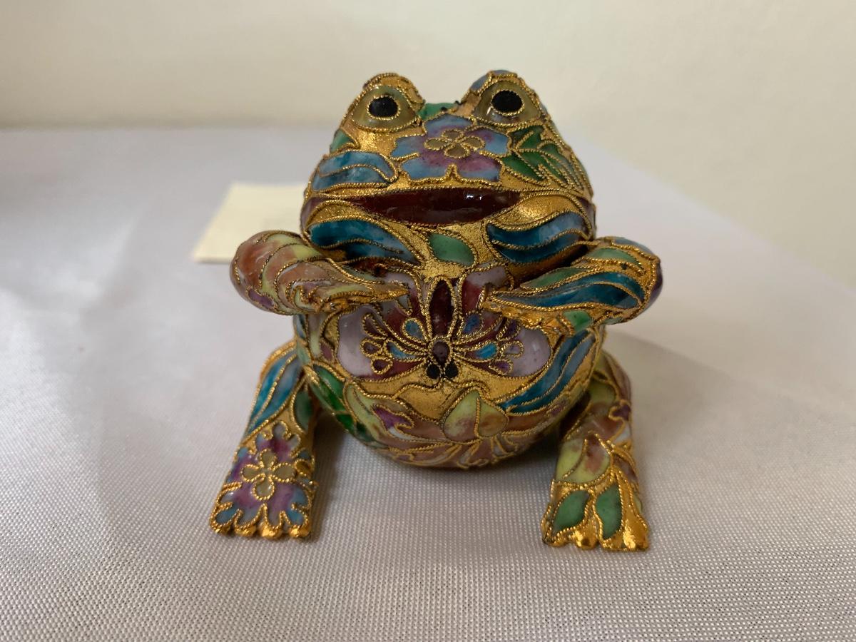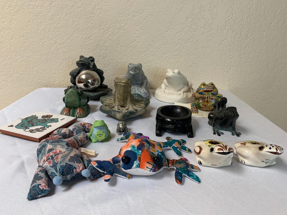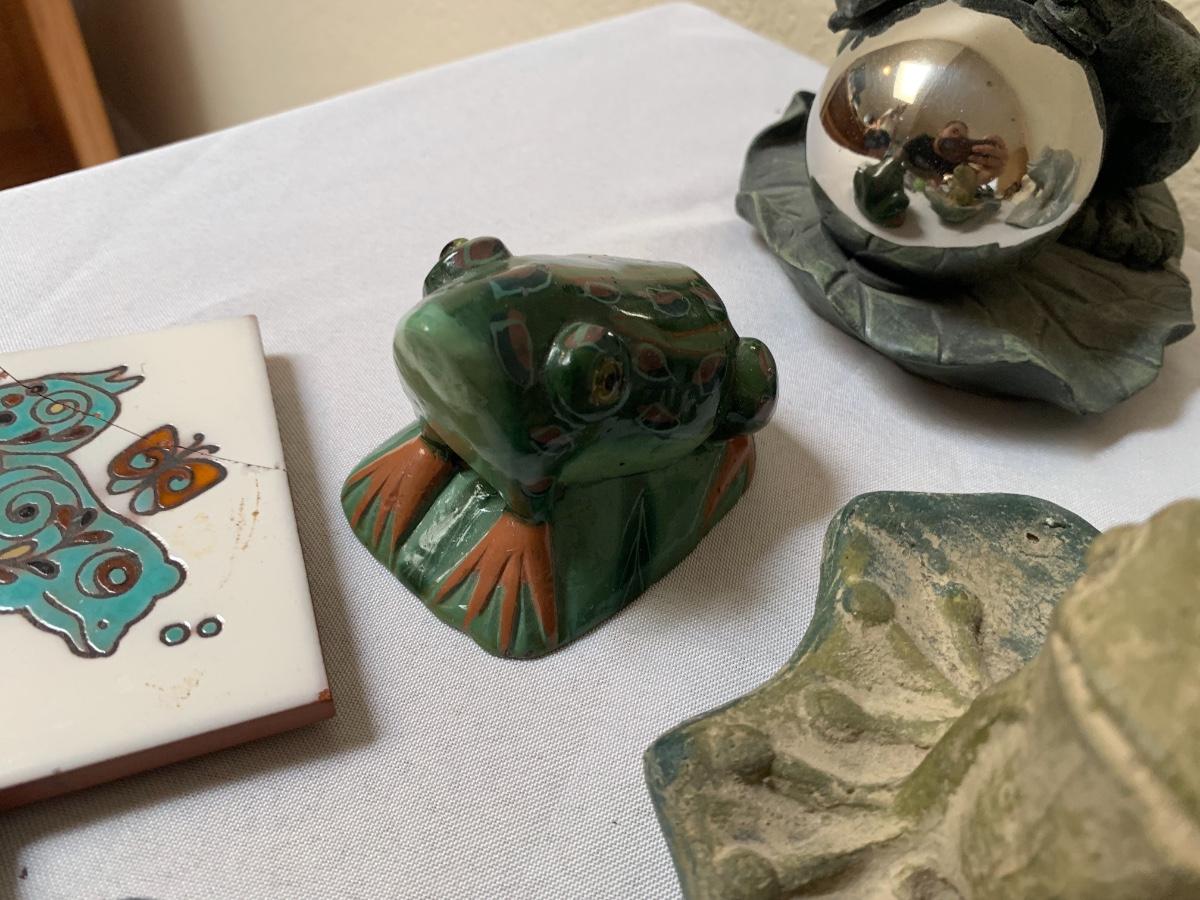 Assorted glass, stone, ceramic, tile (has a repaired crack), metal, cloisonné, resin and fabric frogs. All in great condition with the exception of the tile frog as mentioned.