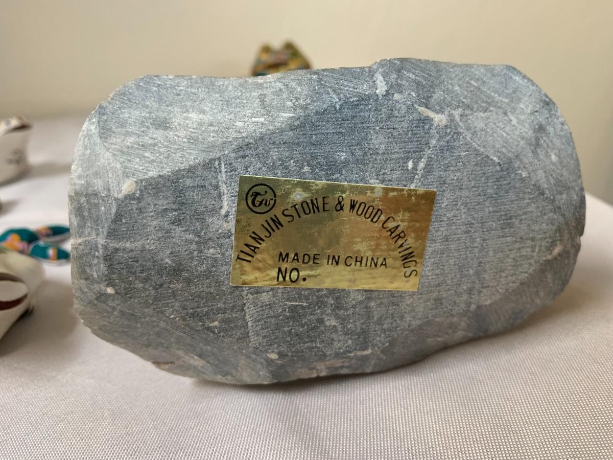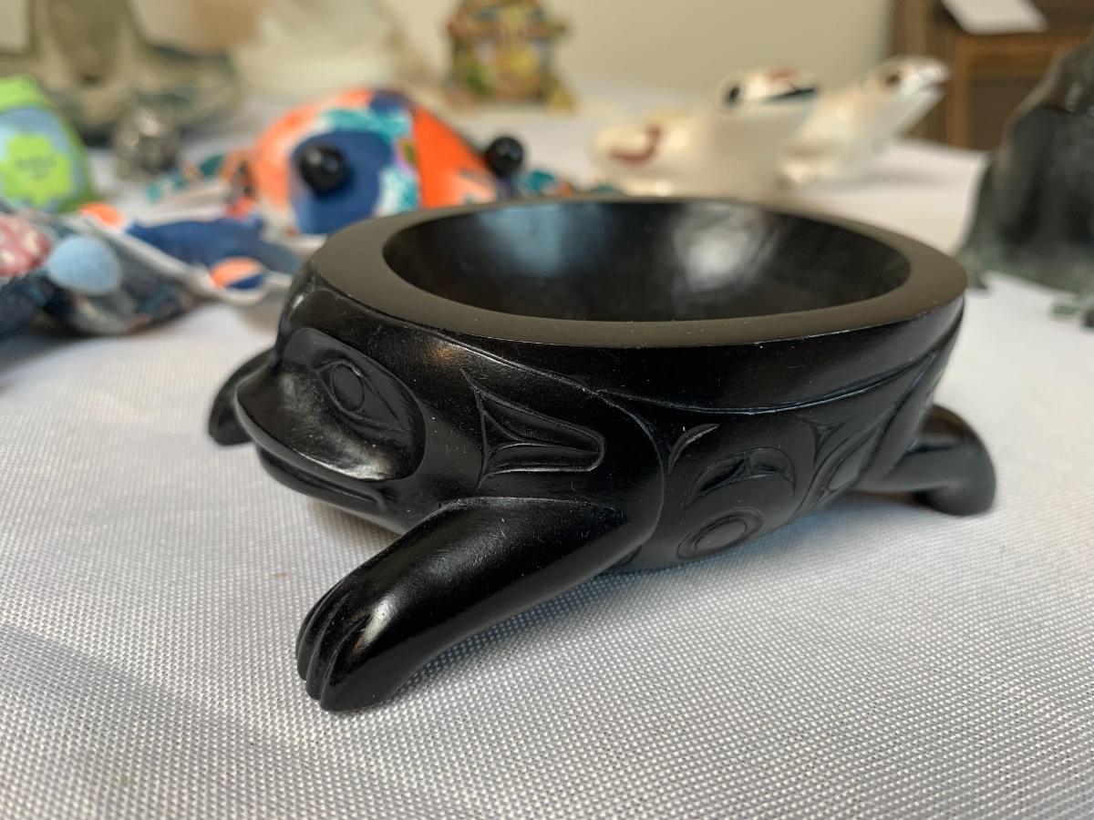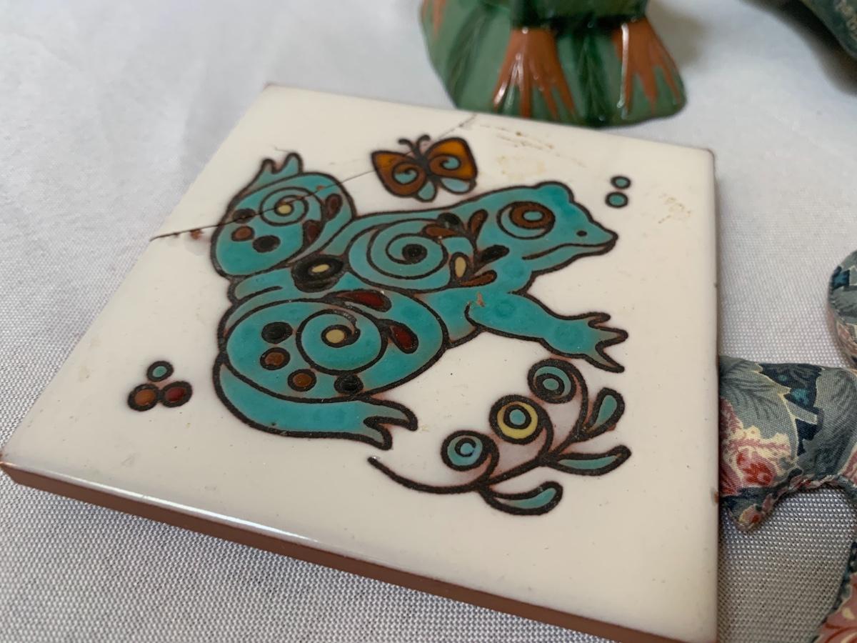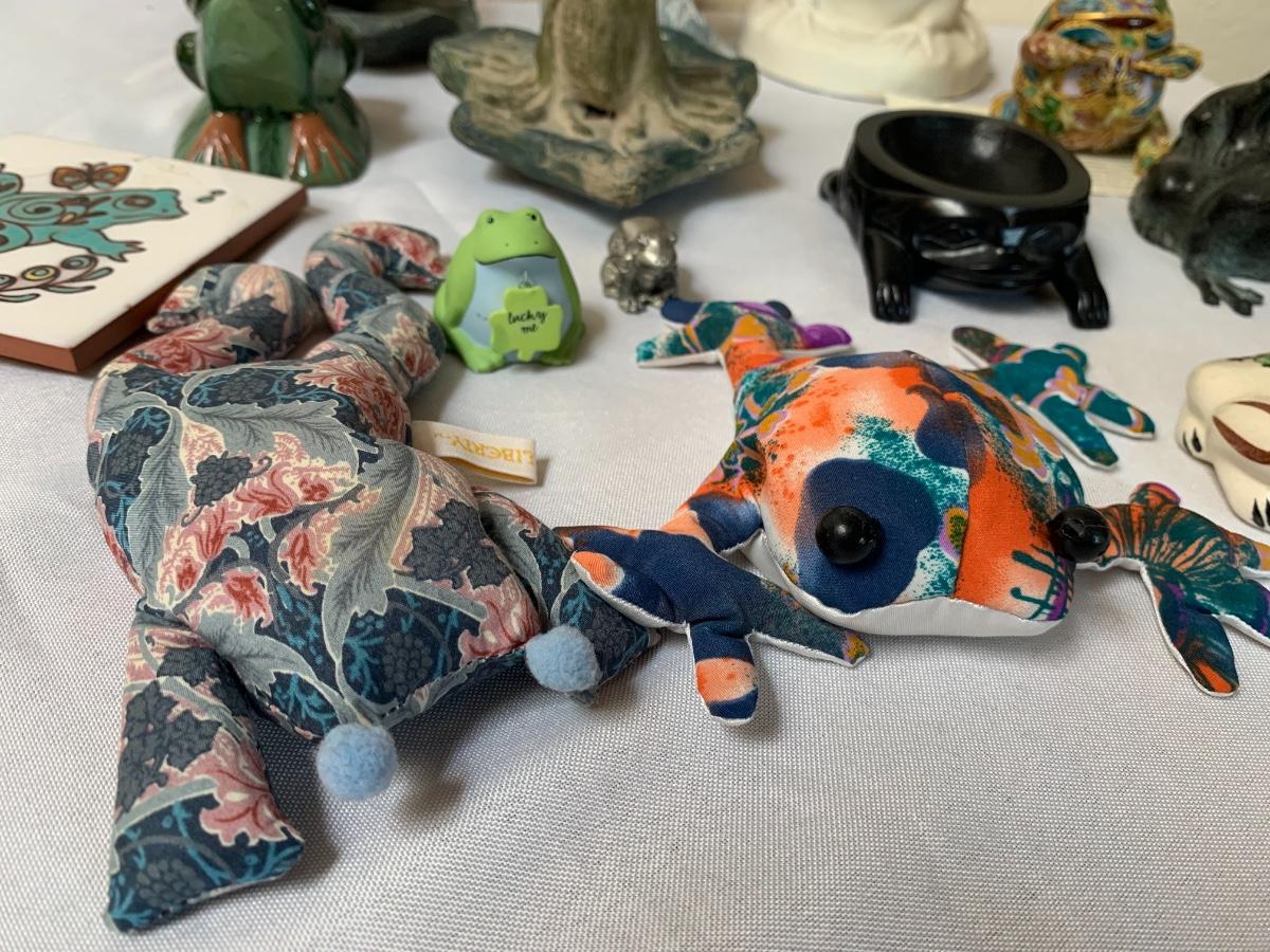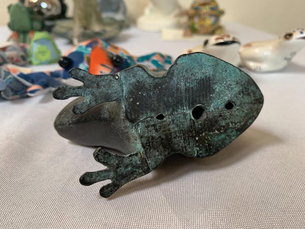 Assorted glass, stone, ceramic, tile (has a repaired crack), metal, cloisonné, resin and fabric frogs. All in great condition with the exception of the tile frog as mentioned.