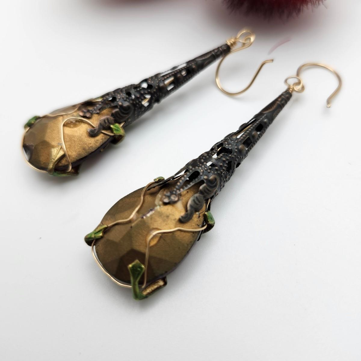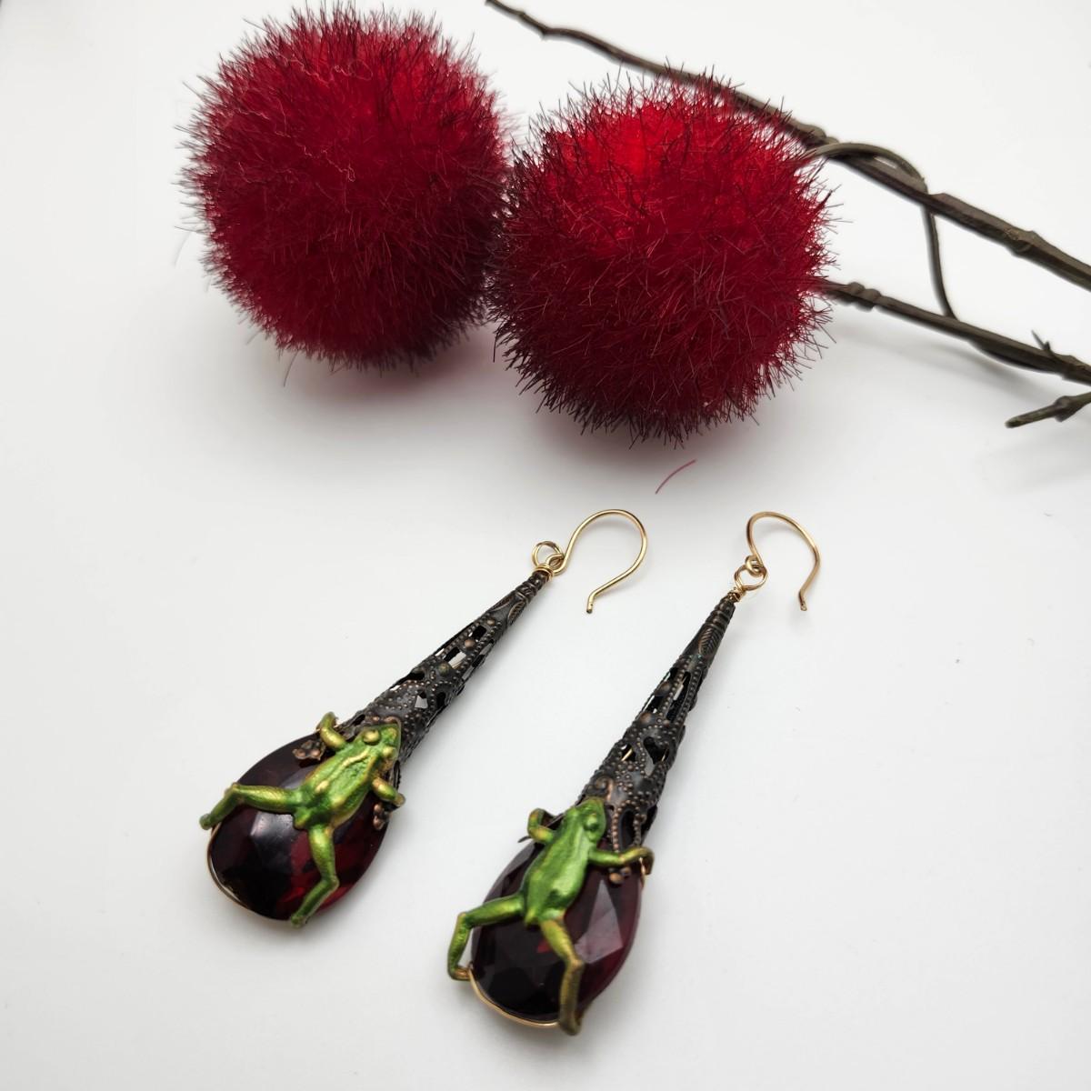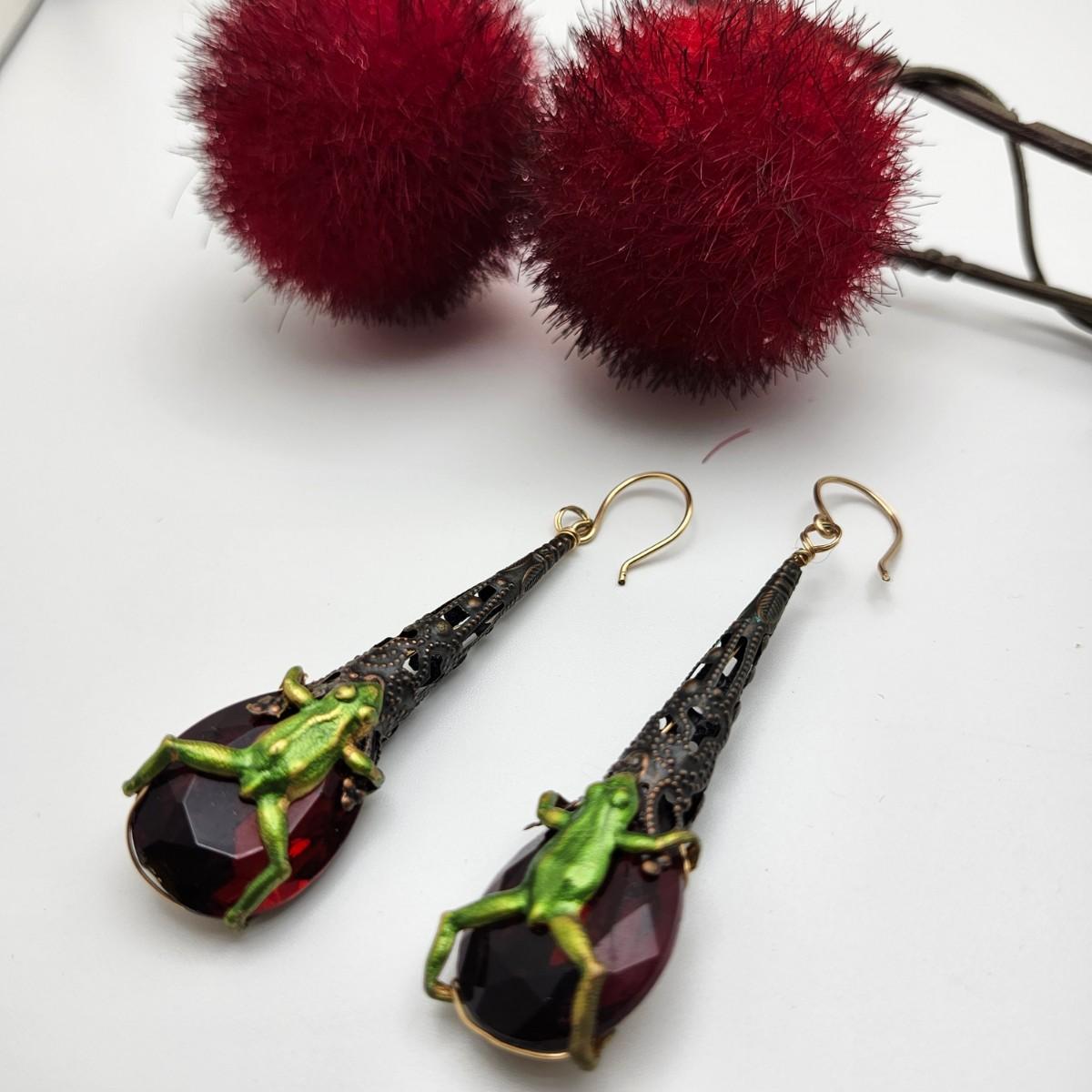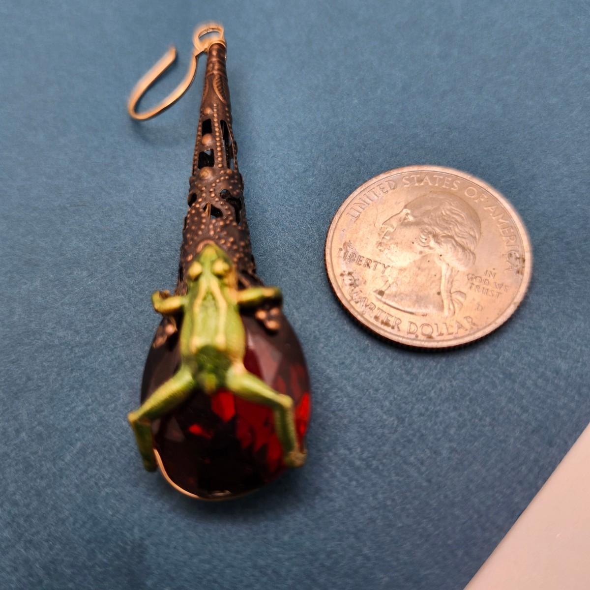 Beautifully detailed frogs cling to a tourmaline stone below the ornate metal work.