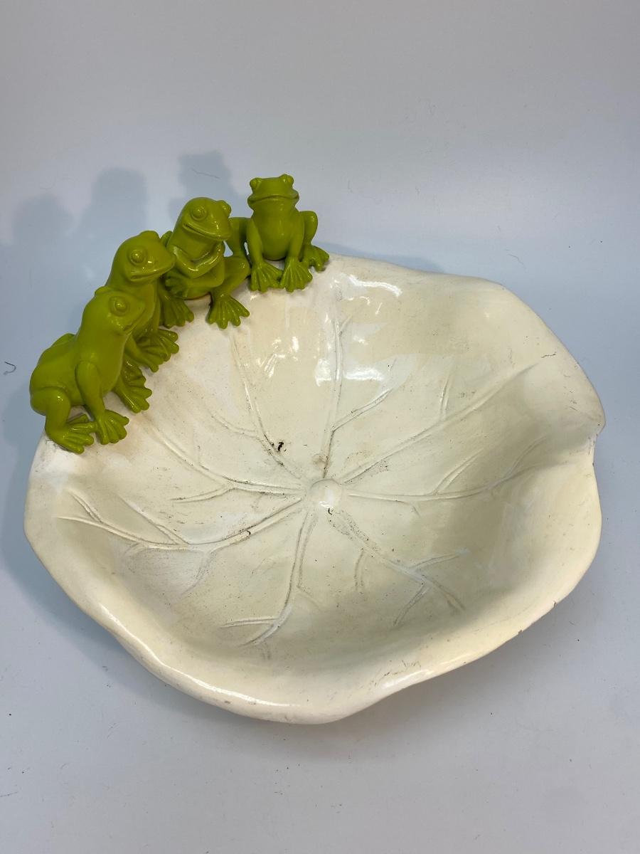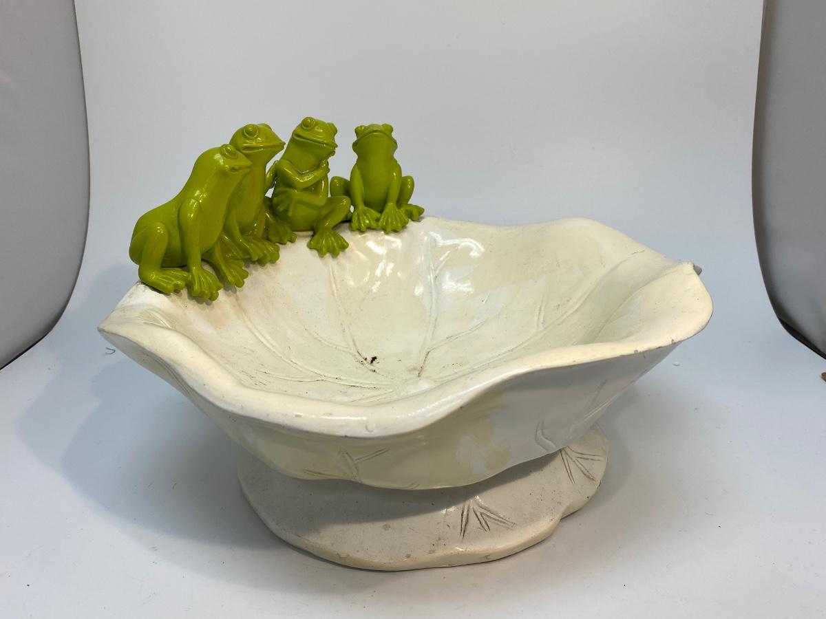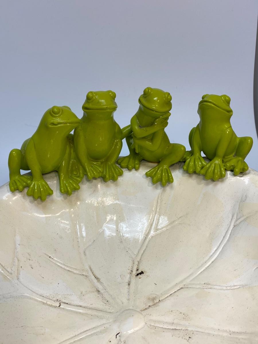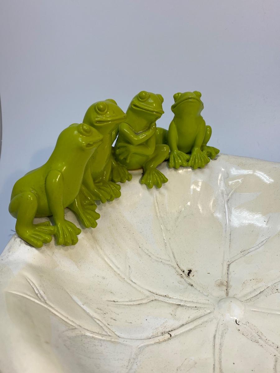 Four frogs sitting along the edge of white lily pad shaped bird bath. In good outdoor weathered condition. There is some chipping in paint but not bowl along the edge. Seems to be a composite material not ceramic. Great for patio or garden. About 12" diameter.