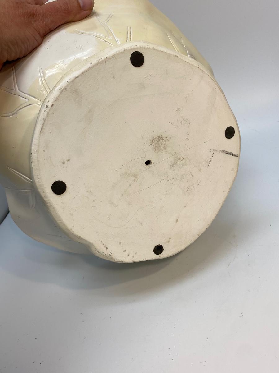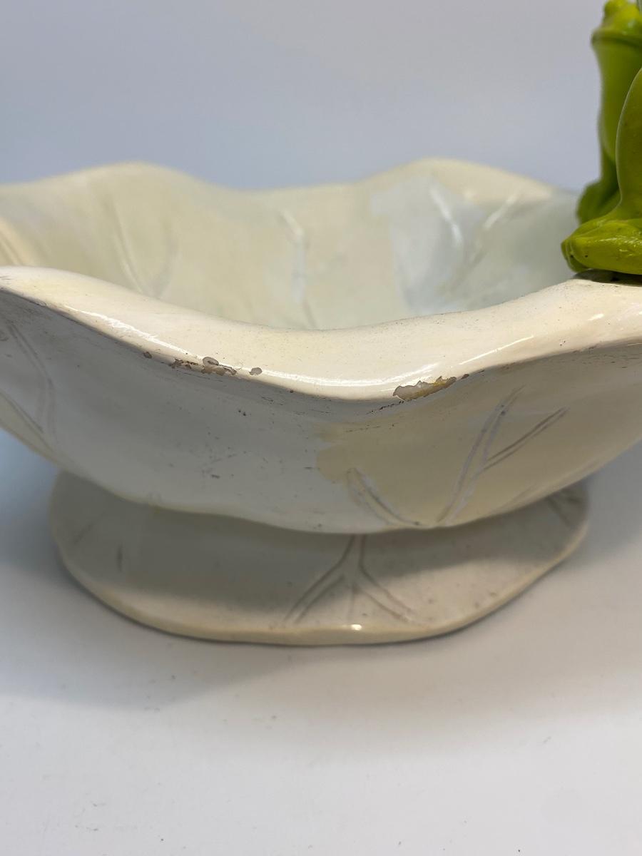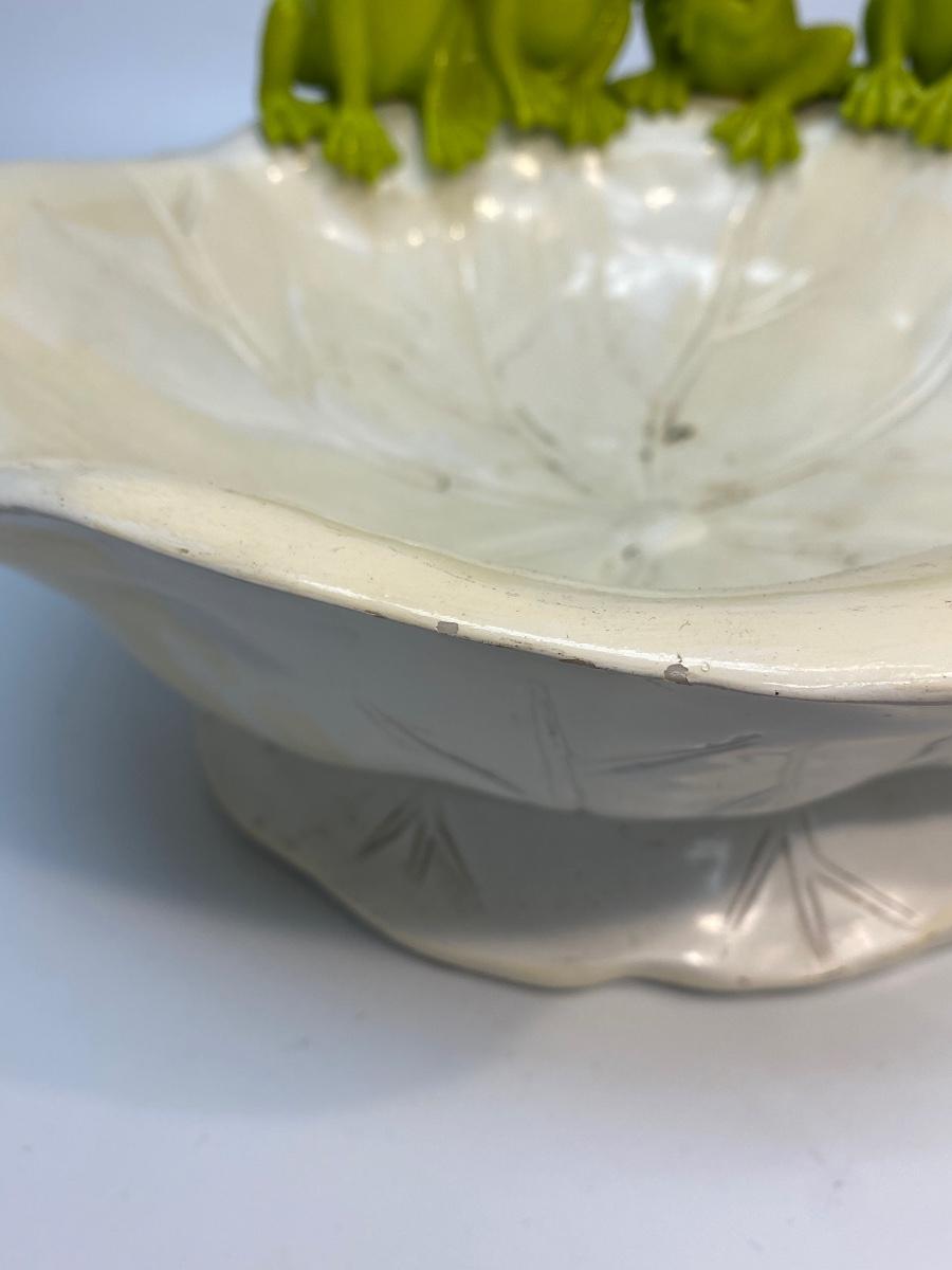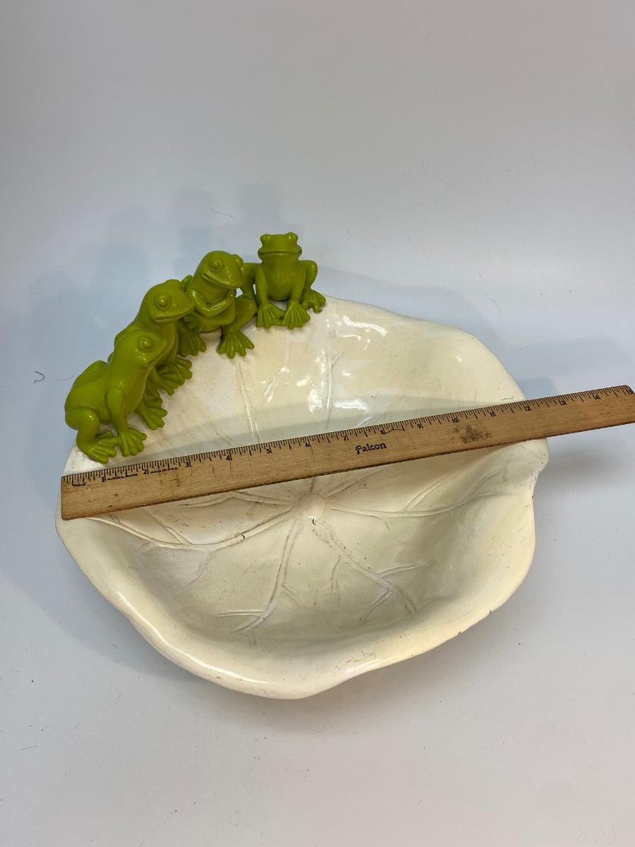 Four frogs sitting along the edge of white lily pad shaped bird bath. In good outdoor weathered condition. There is some chipping in paint but not bowl along the edge. Seems to be a composite material not ceramic. Great for patio or garden. About 12" diameter.