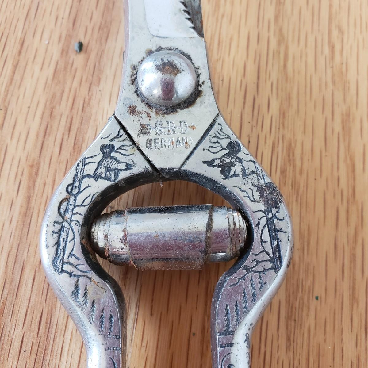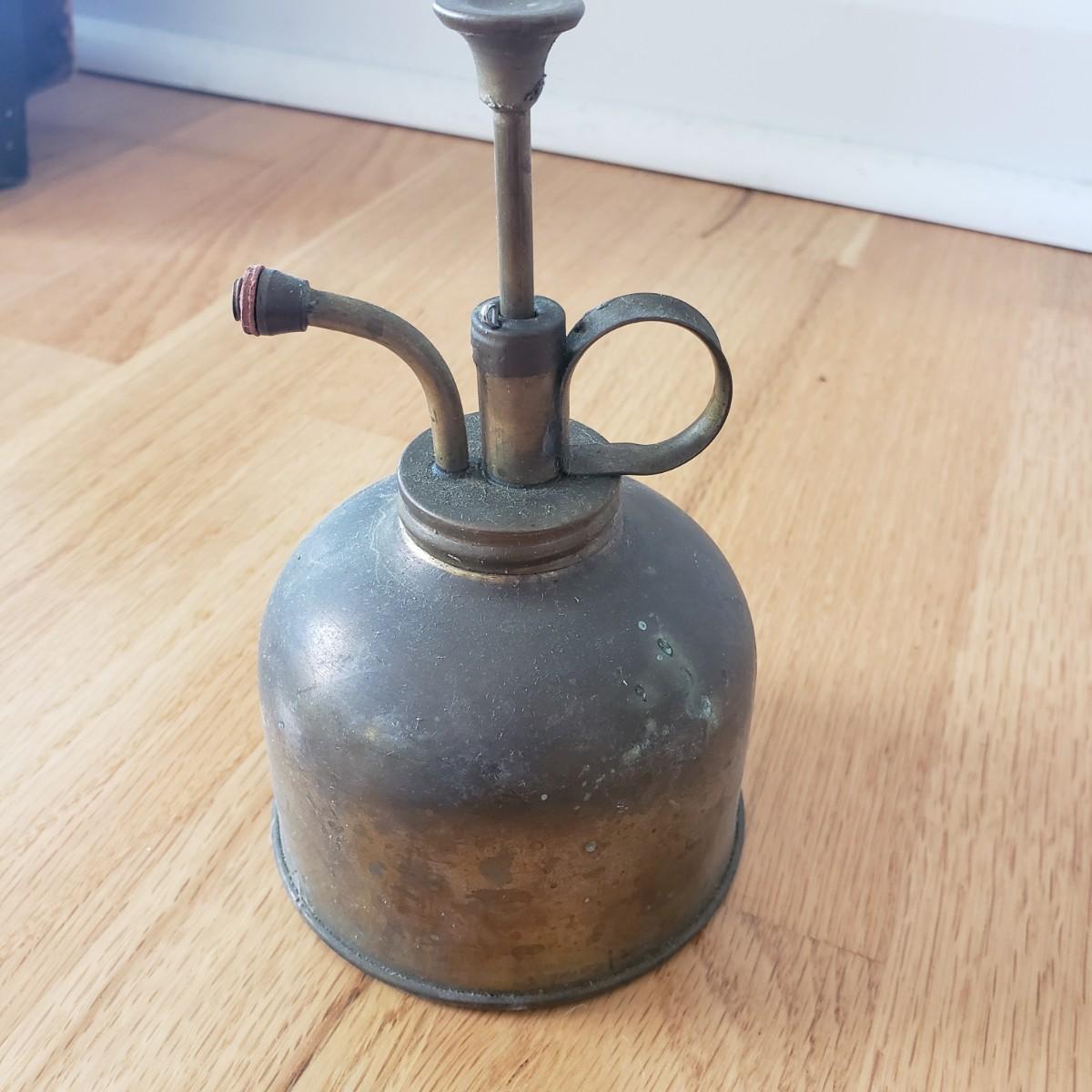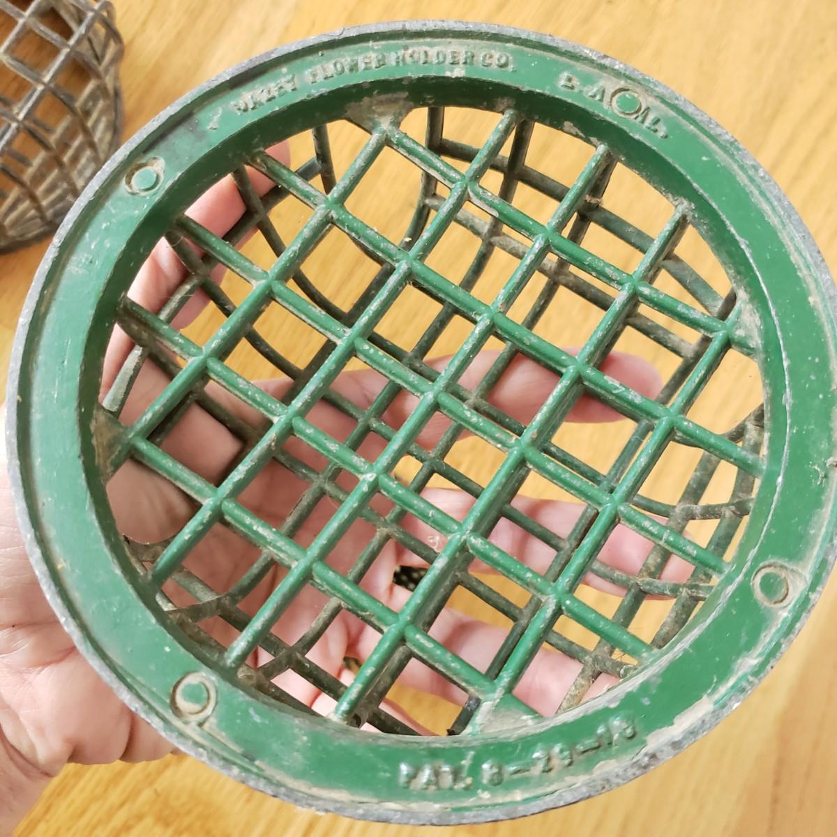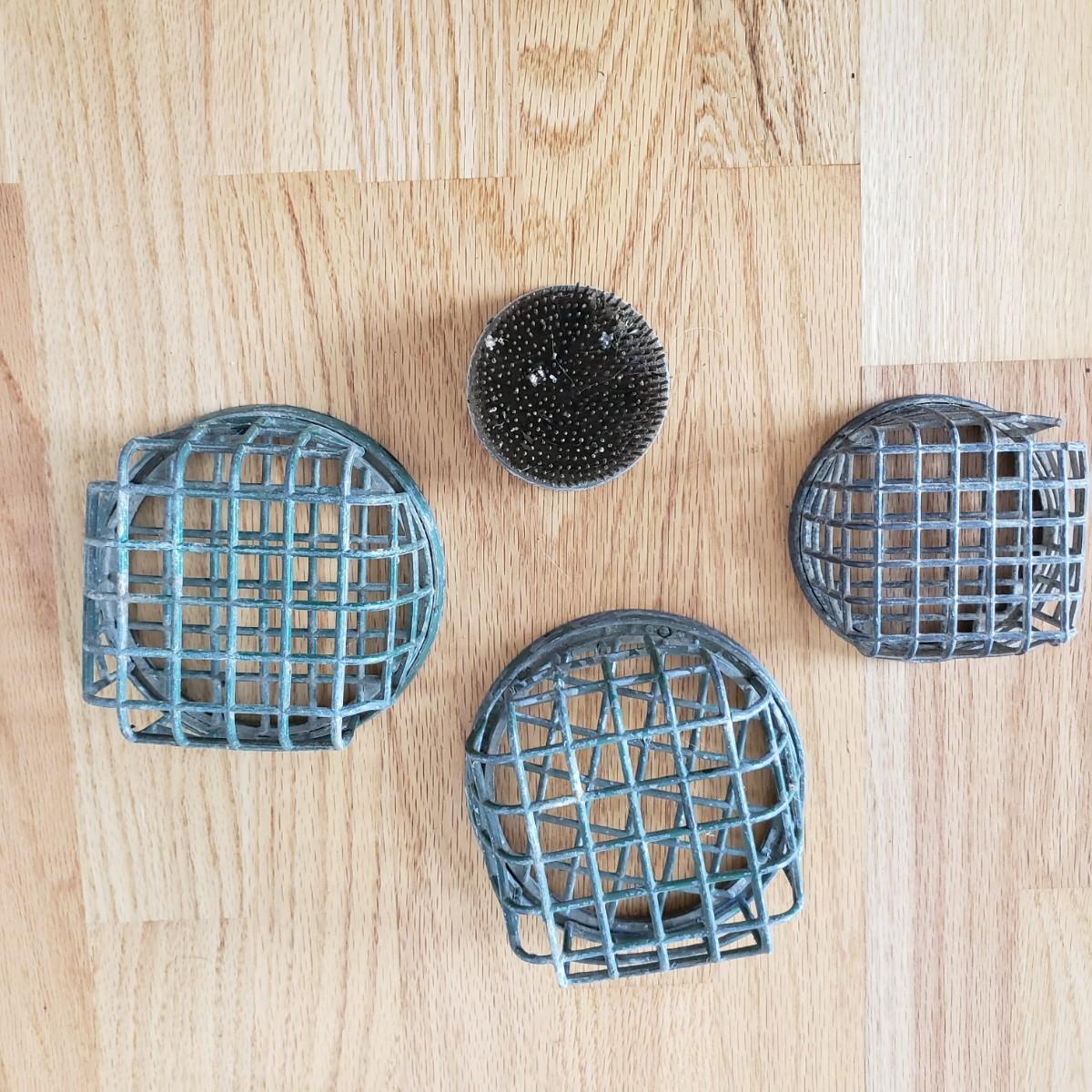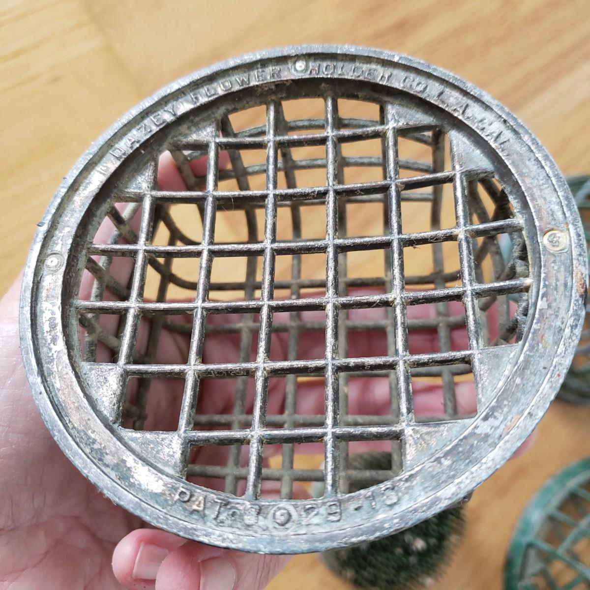 This lot contains three frogs from Dazely Flower Holder Co. From LA California. One of the grates has detached from the base. See picture. There are a pair of SRD made in Germany trimmers with engraved handles measuring 10". The large hedge trimmers are rusty, but useable. The red bridle bracket with a hook was made in England. The brass, pump mister was made in Hong Kong. The oil can measures 8" x 6"H.