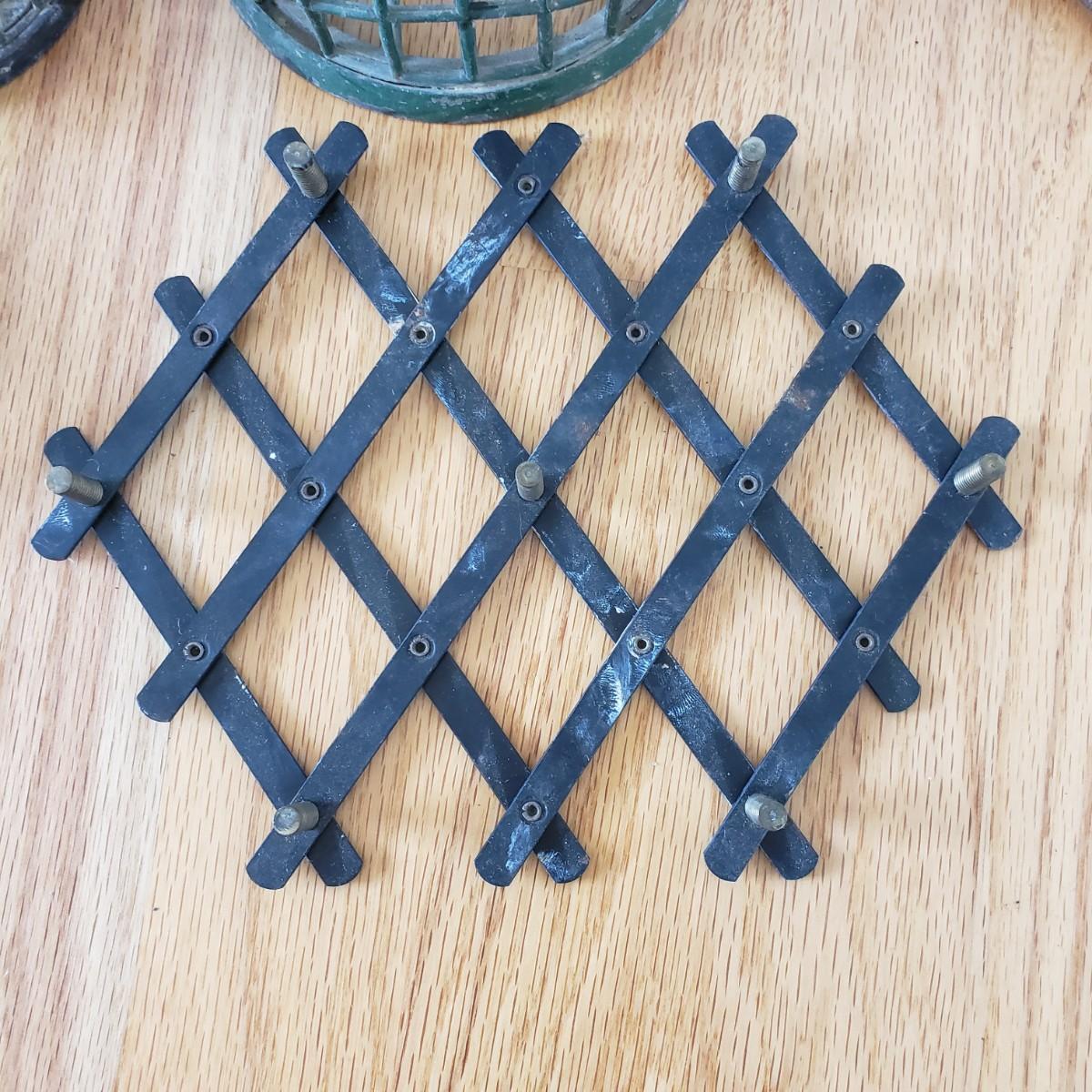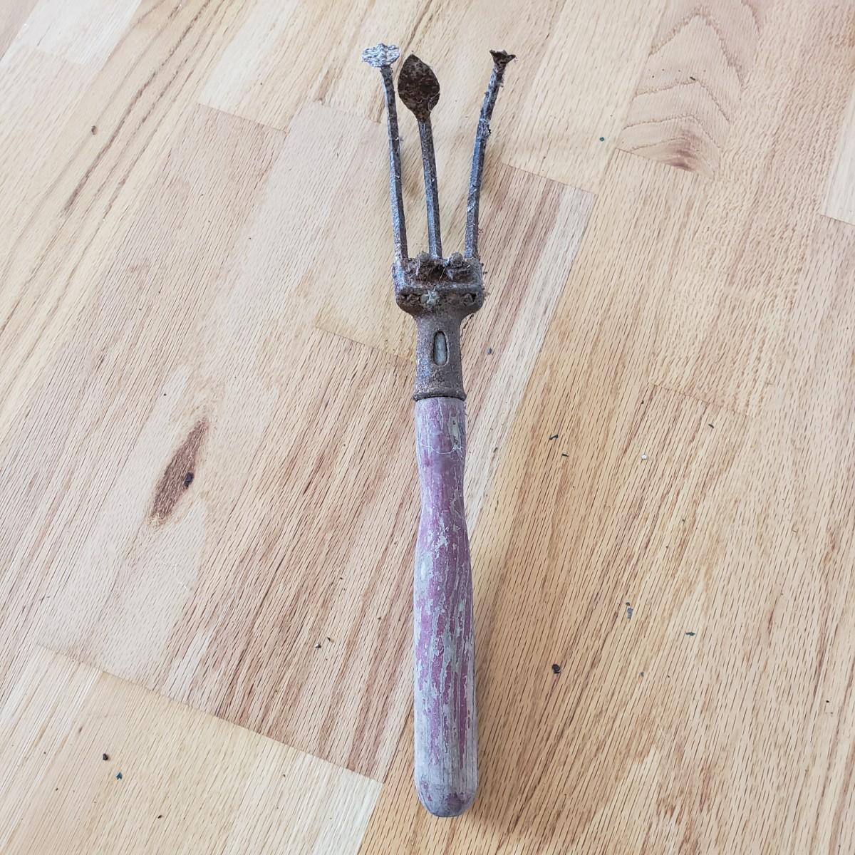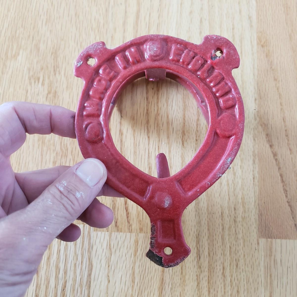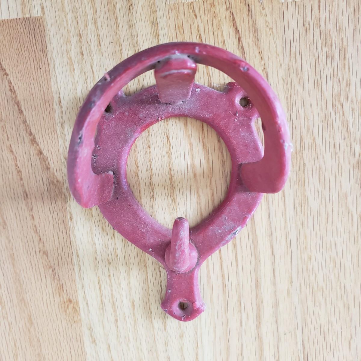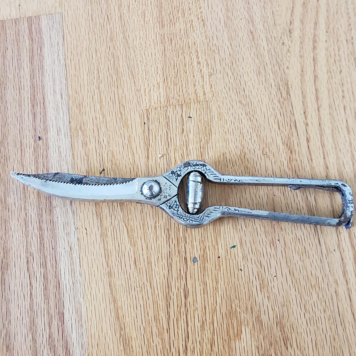 This lot contains three frogs from Dazely Flower Holder Co. From LA California. One of the grates has detached from the base. See picture. There are a pair of SRD made in Germany trimmers with engraved handles measuring 10". The large hedge trimmers are rusty, but useable. The red bridle bracket with a hook was made in England. The brass, pump mister was made in Hong Kong. The oil can measures 8" x 6"H.