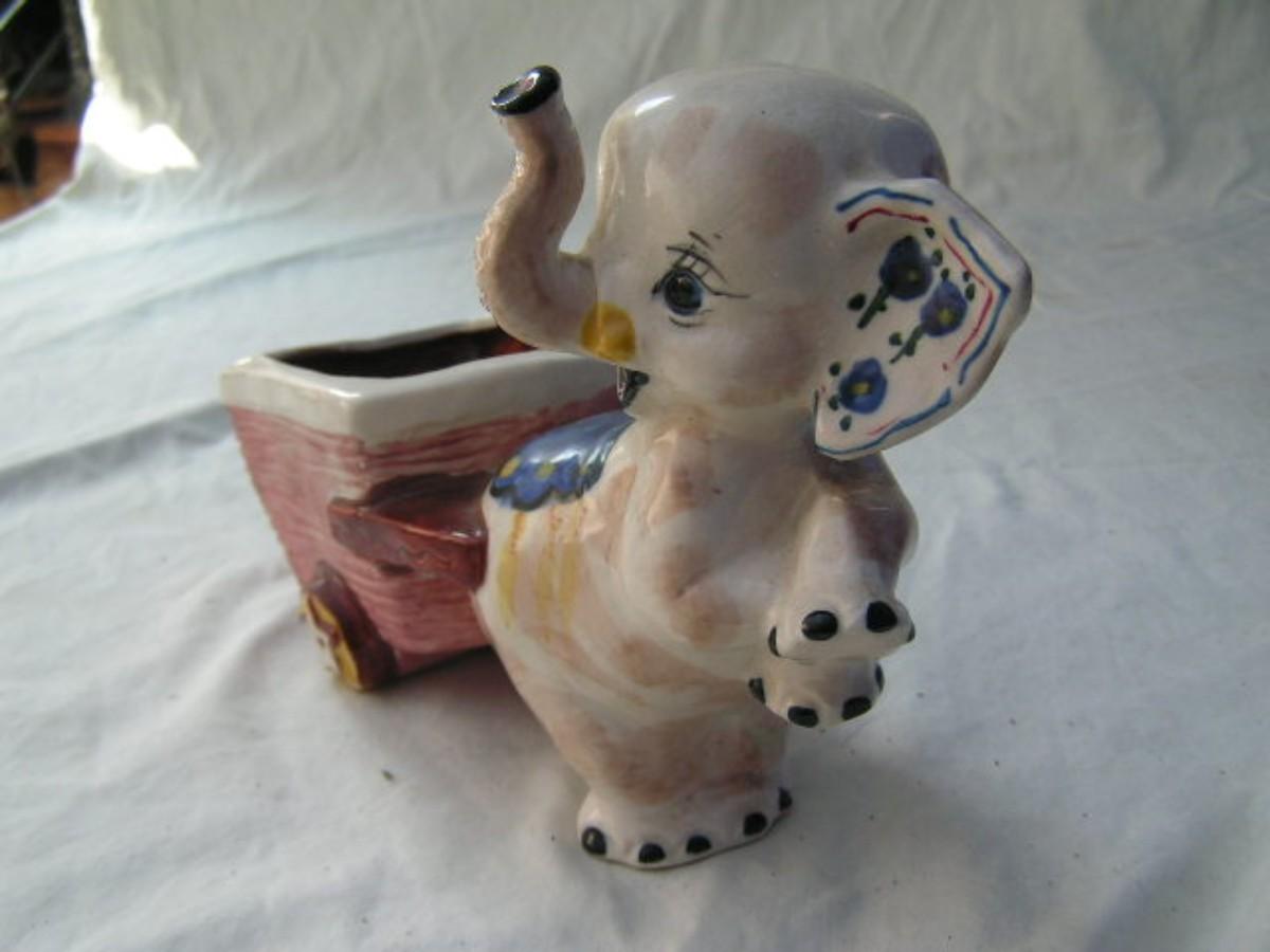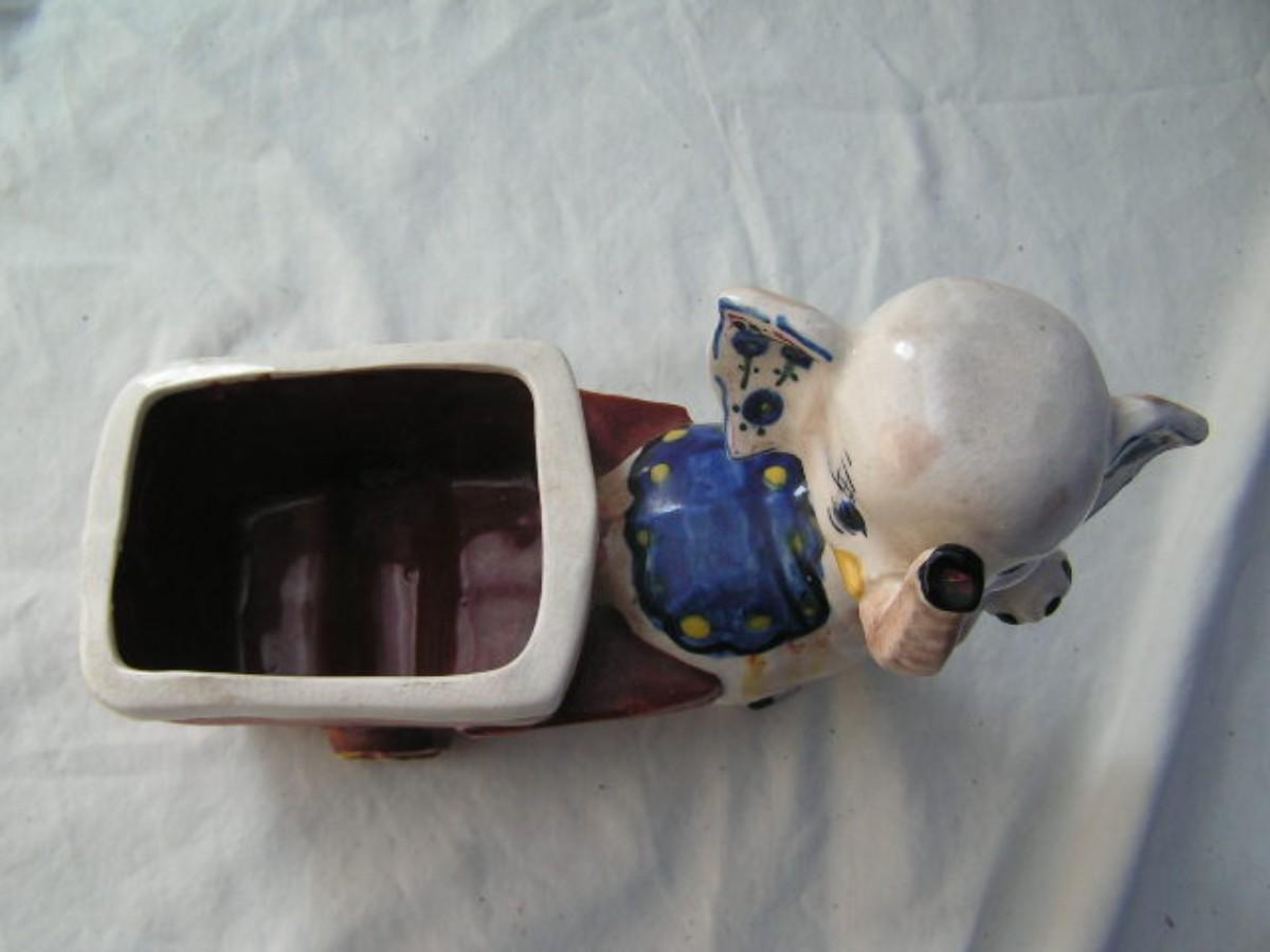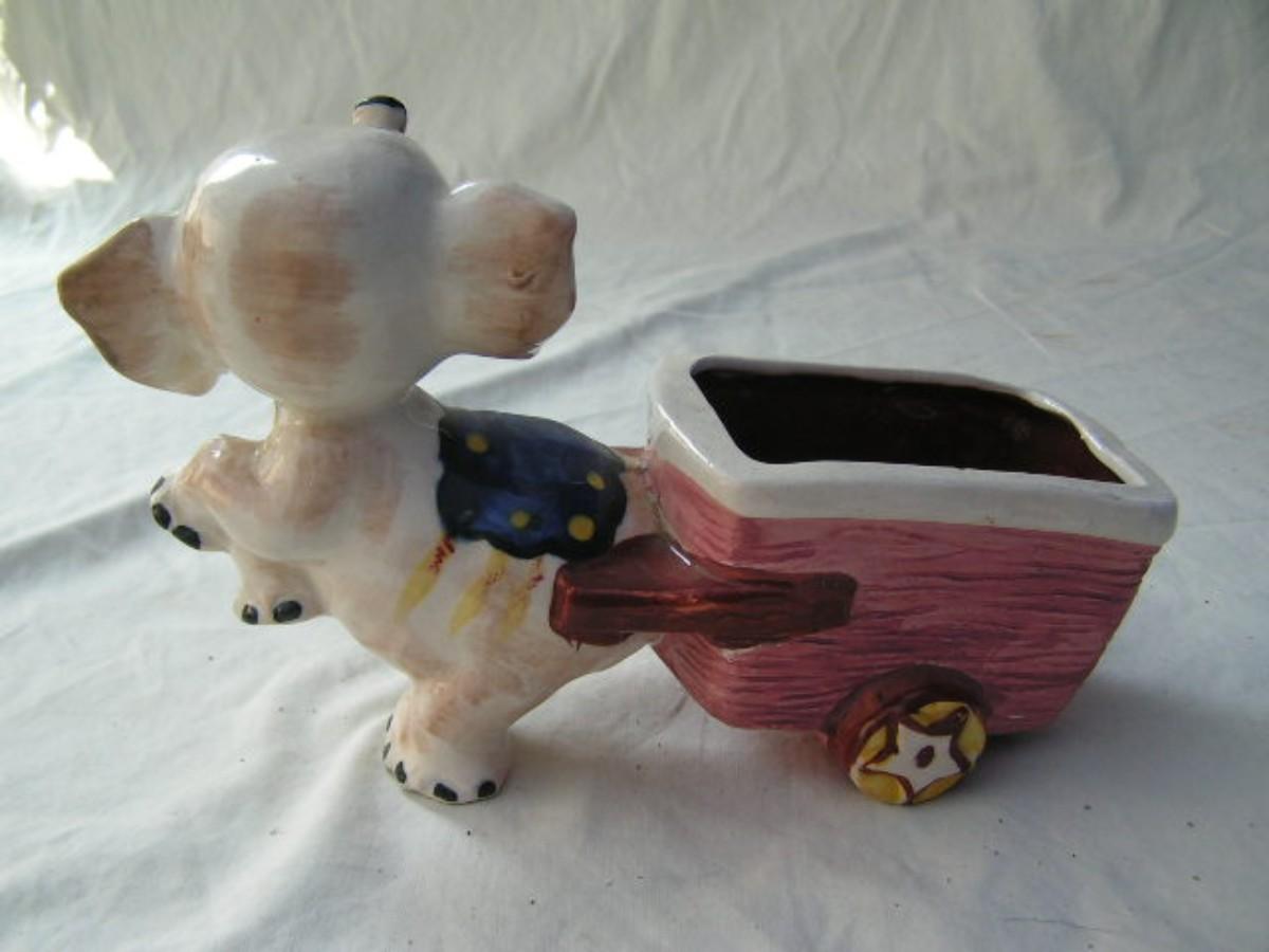 From “Occupied Japan” c.1945-1952. Vintage Enesco “Elephant Pulling A Cart” planter for window sill or similar use. Hand painted glazed ceramic. Has significant historical value. Very nice condition considering age. About 5-3/4" tall x 8-1/2" long.