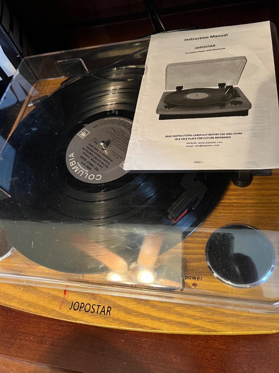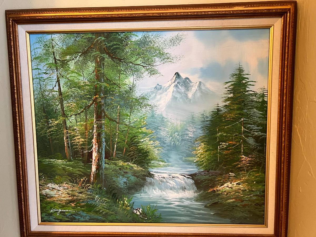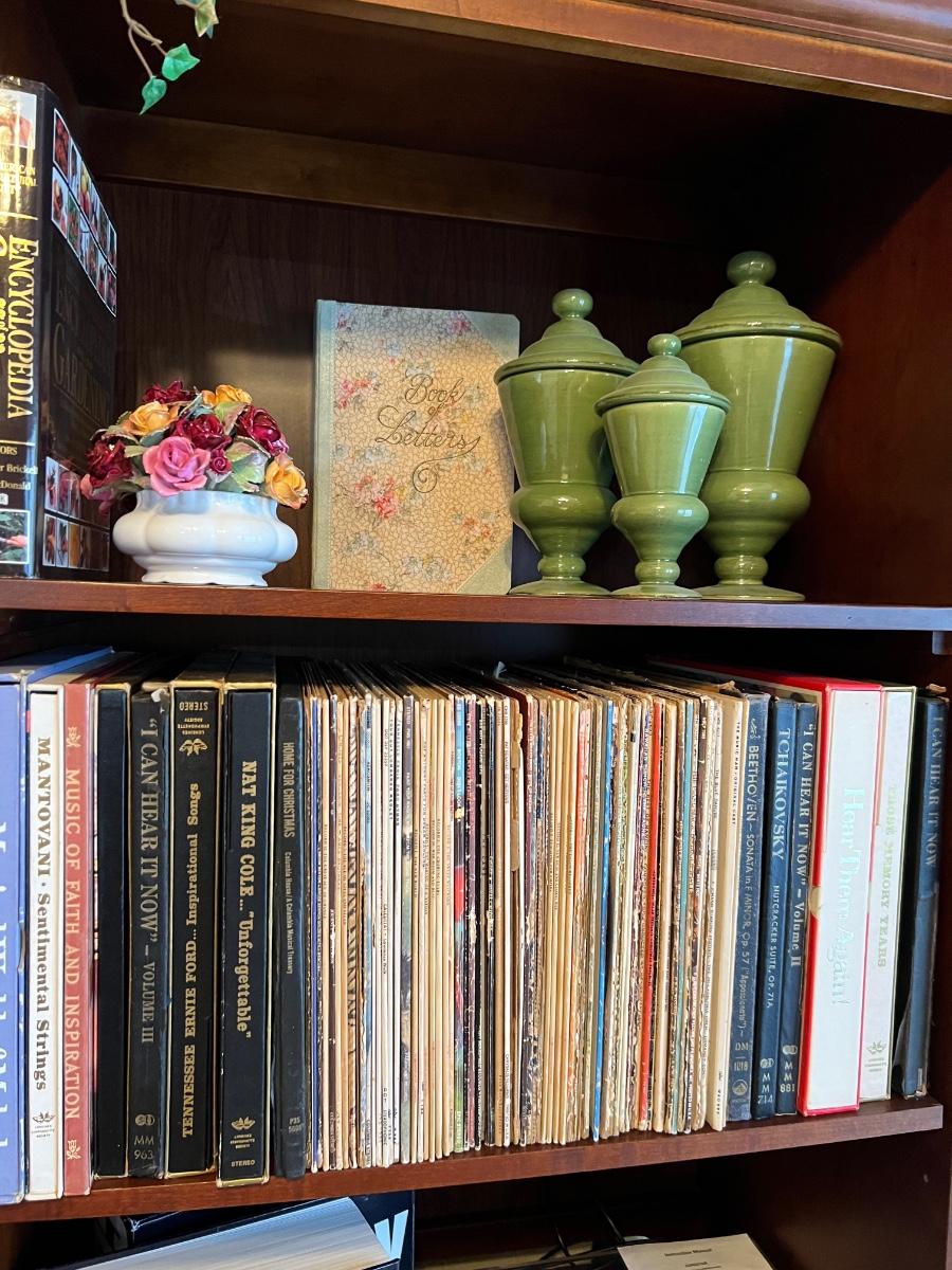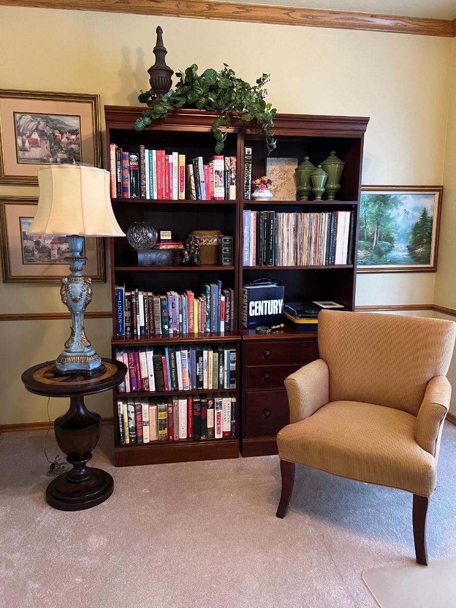 Book Case Full of Books, Original Oil Painting, Pair of prints, Chair, side table, lamp, record player, decor as pictured