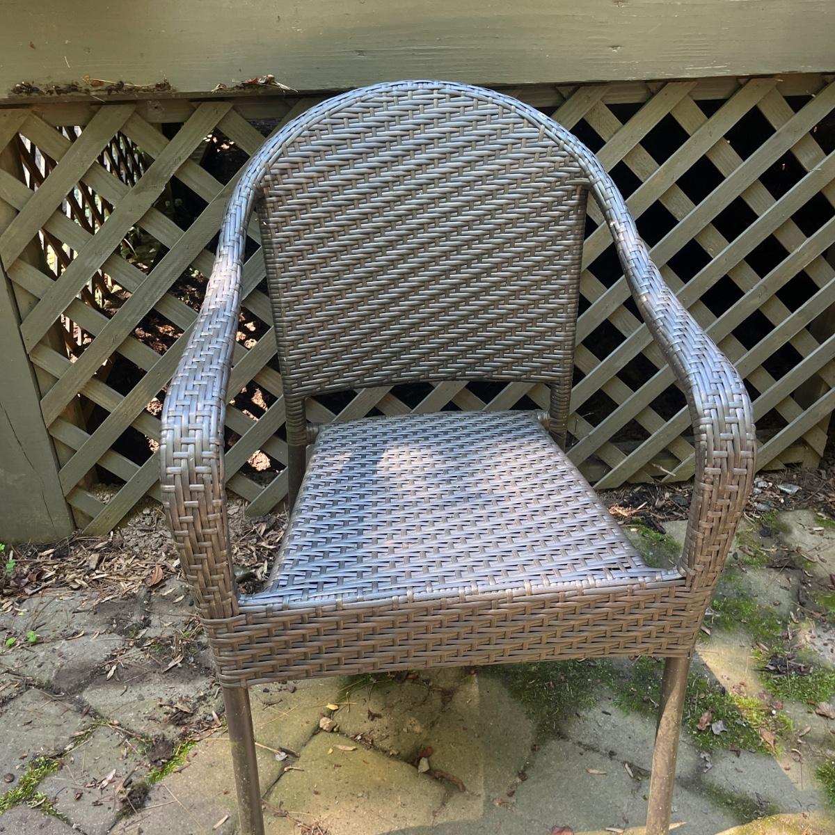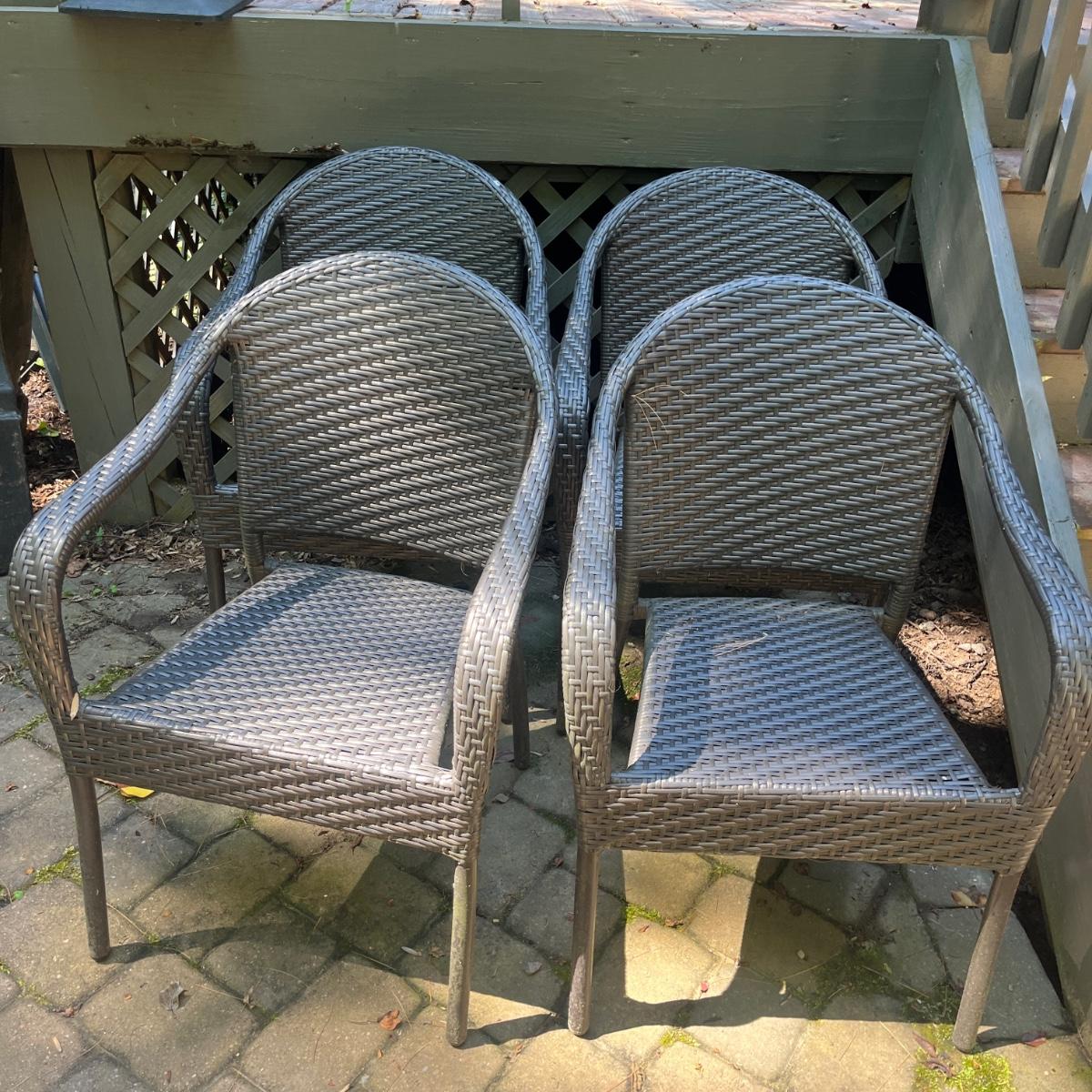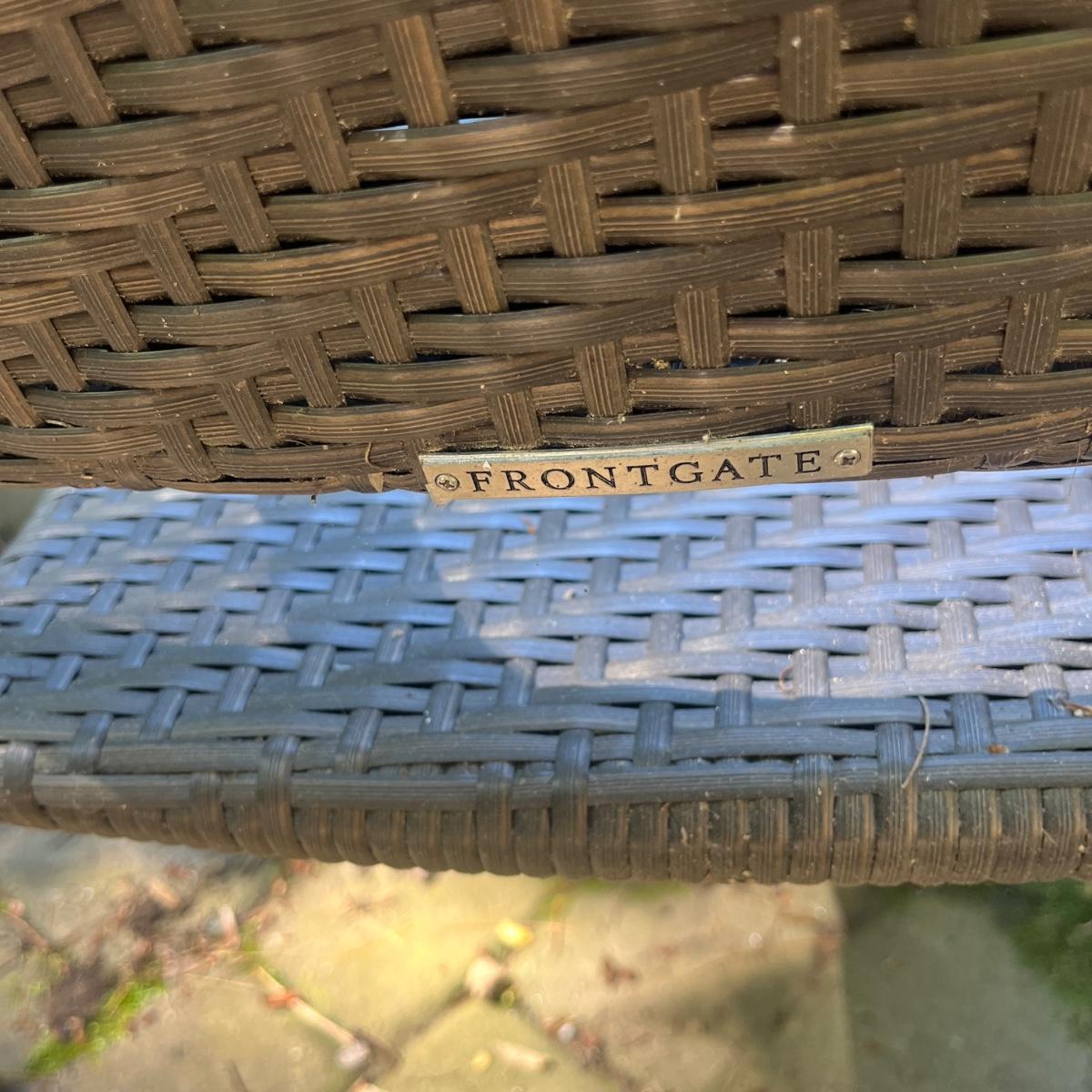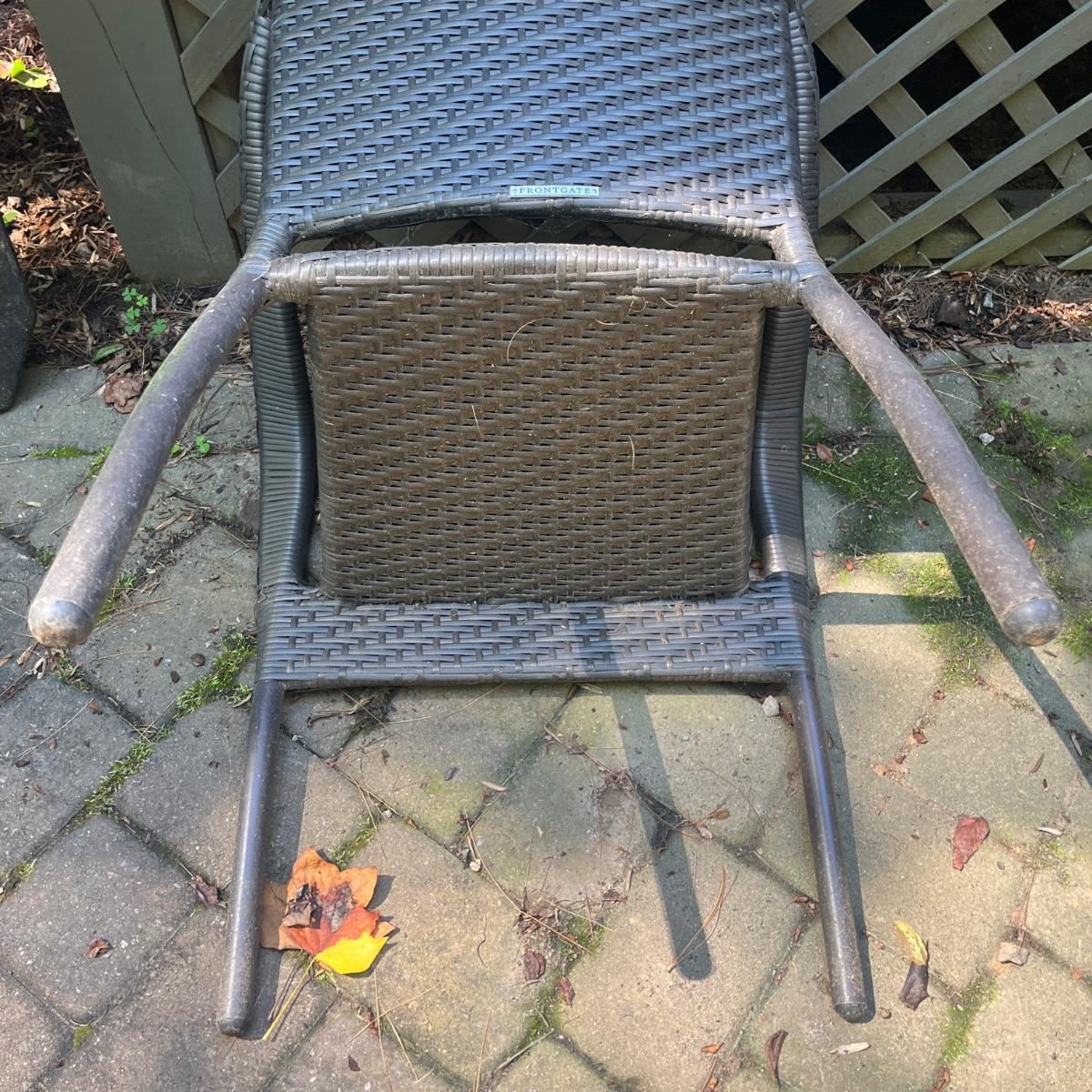 Lot includes four Frontgate stacking all weather wicker chairs and an all weather wicker table. Chairs measure 24” x 24” x 34”H with a 17” seat height. Table has fading on top, see pictures.