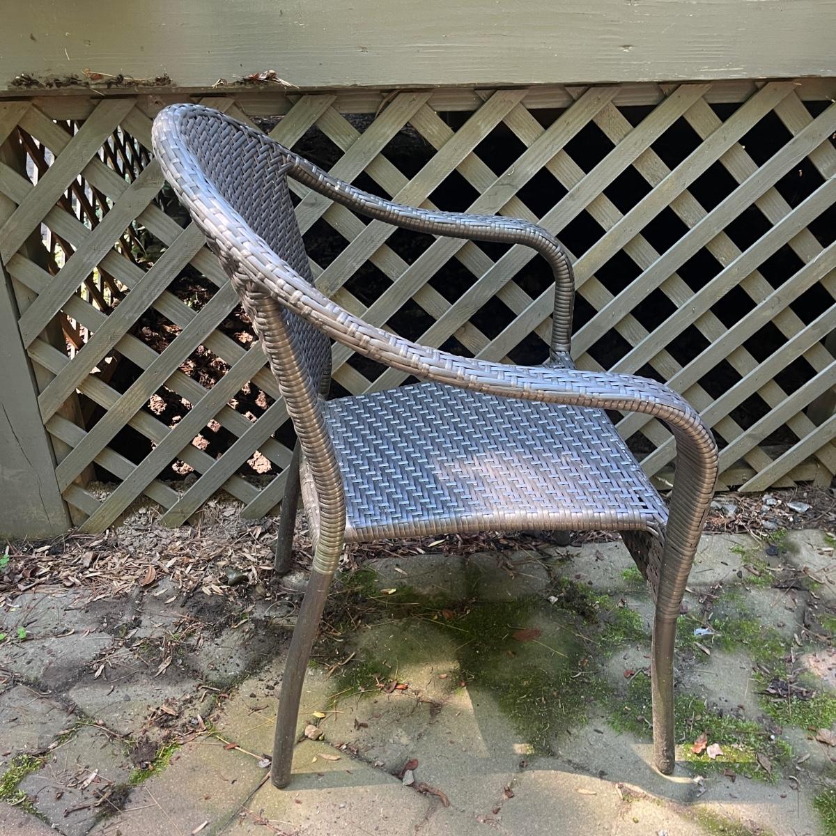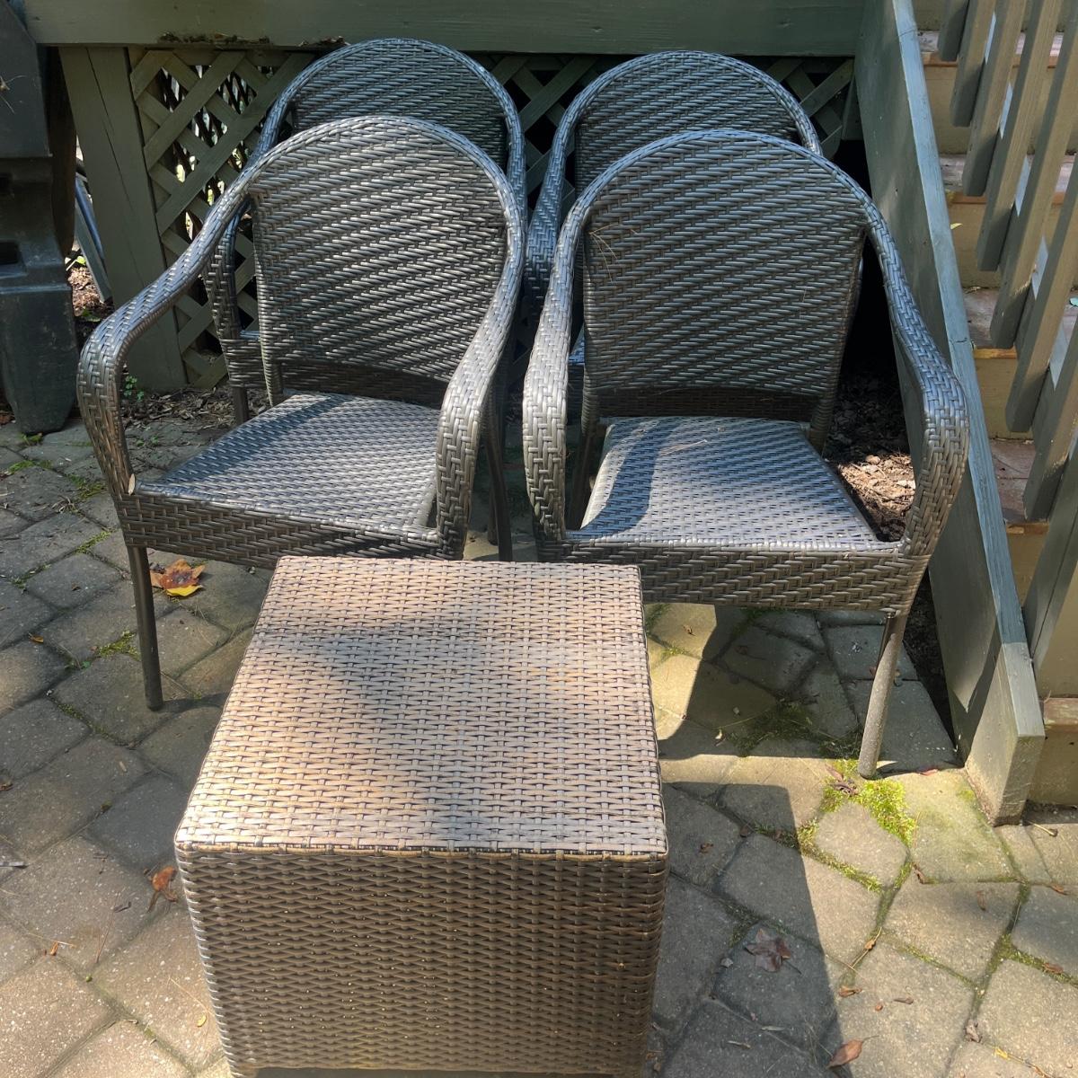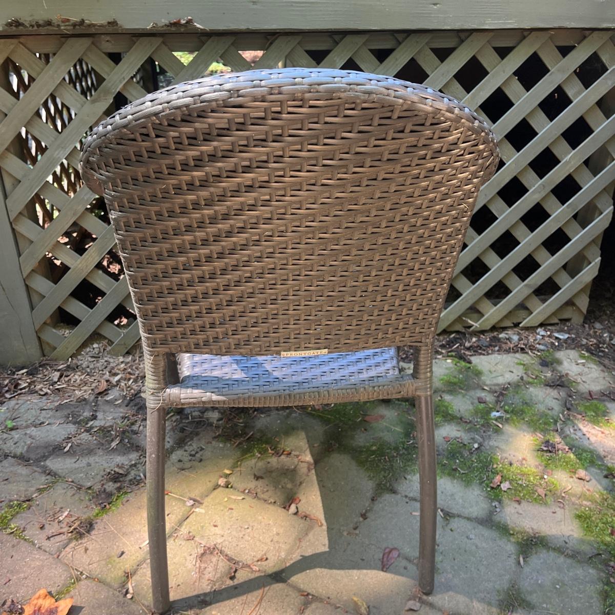 Lot includes four Frontgate stacking all weather wicker chairs and an all weather wicker table. Chairs measure 24” x 24” x 34”H with a 17” seat height. Table has fading on top, see pictures.
