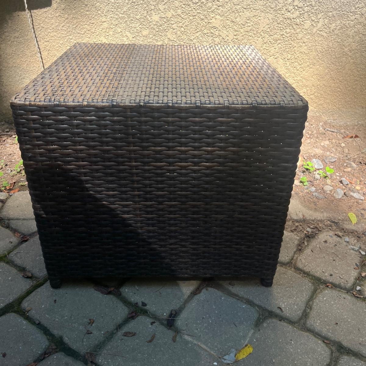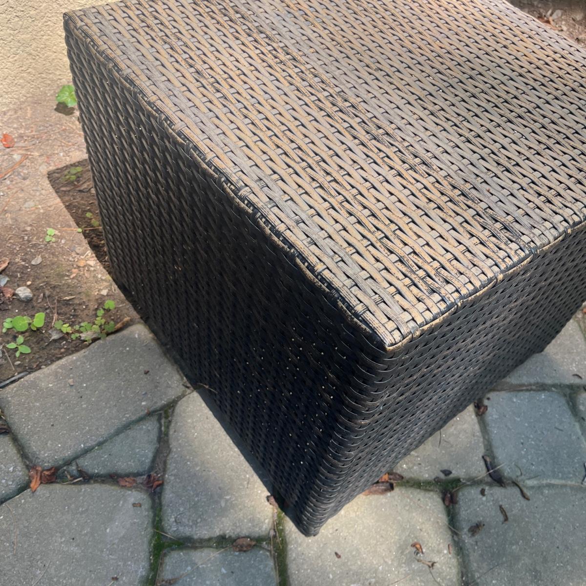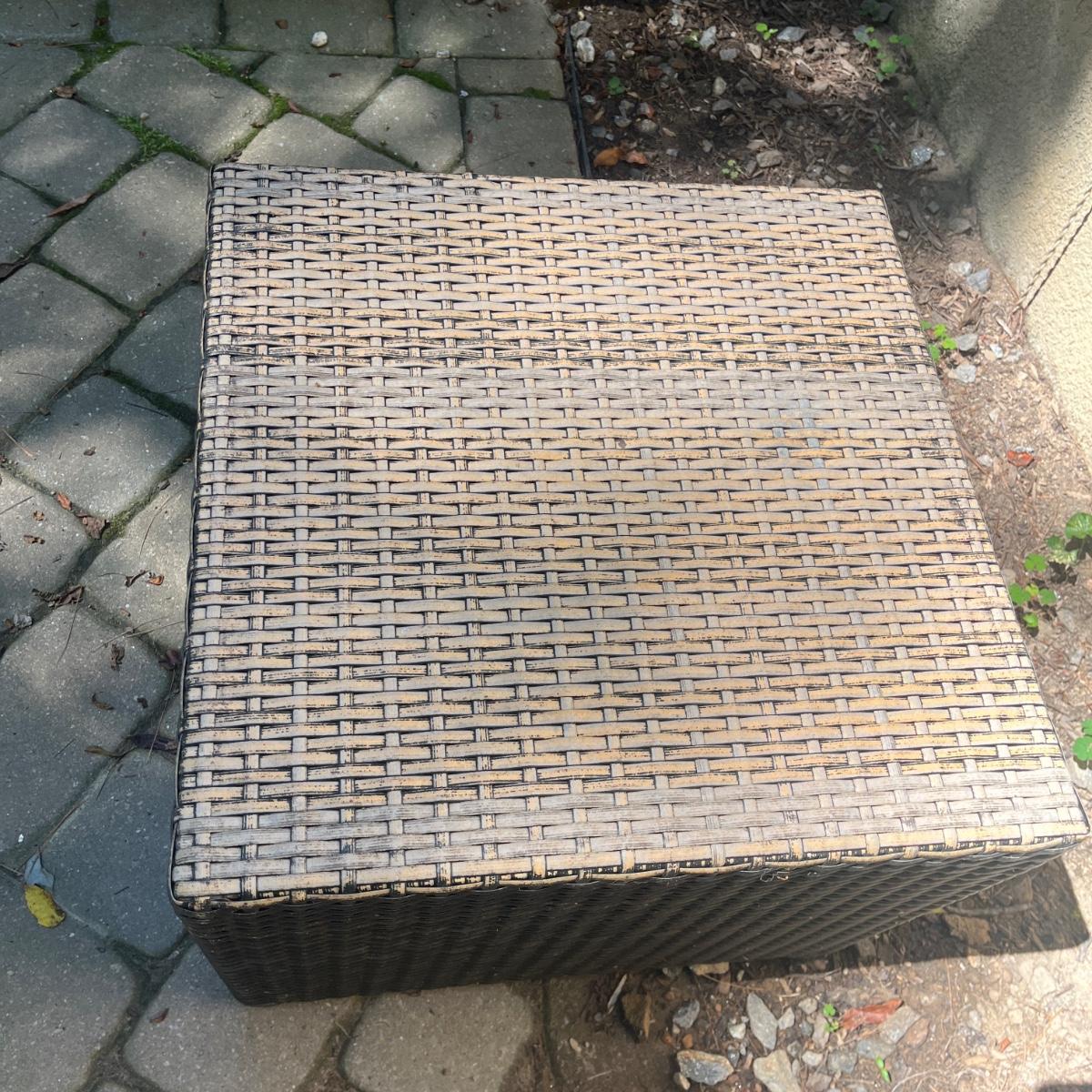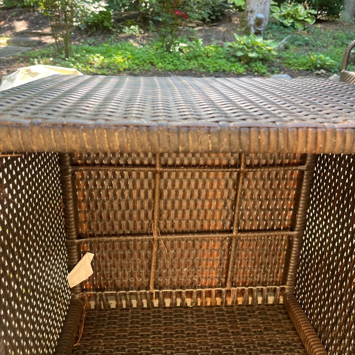 Lot includes four Frontgate stacking all weather wicker chairs and an all weather wicker table. Chairs measure 24” x 24” x 34”H with a 17” seat height. Table has fading on top, see pictures.