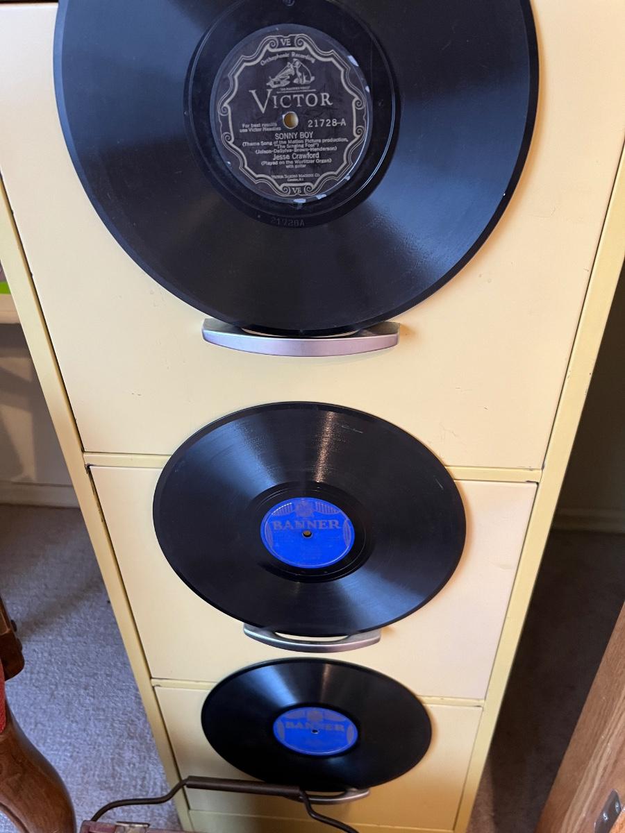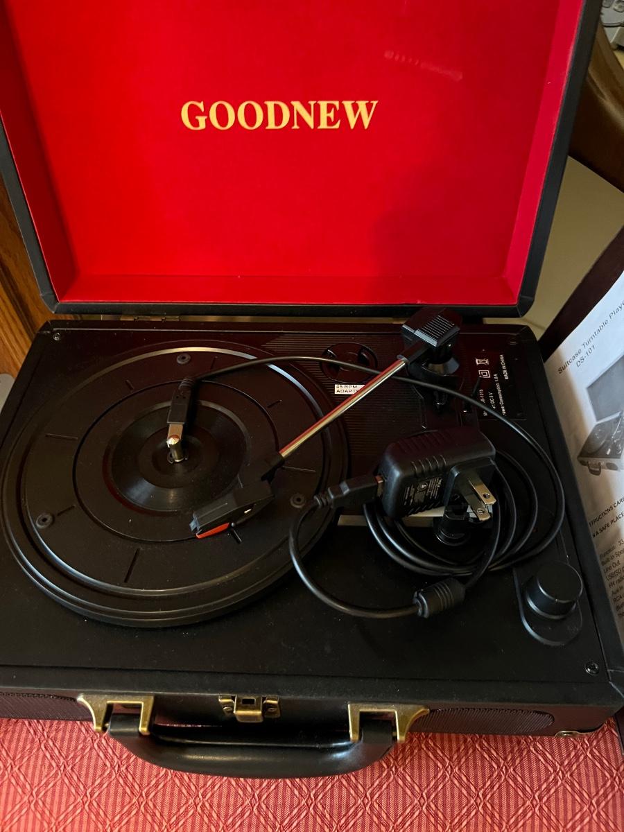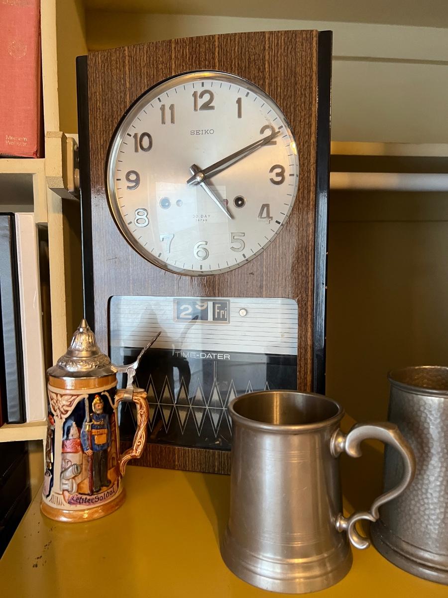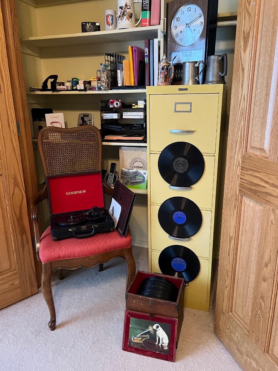 Seiko 30 day Time-Dater clock, Portable record player, file Cabinet. box of vintage albums. Chair, & office supplies as pictured