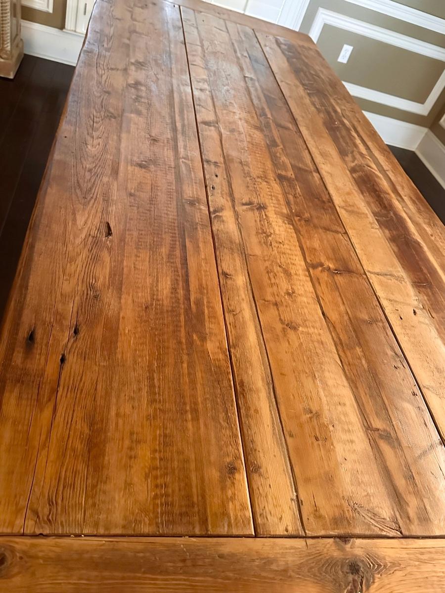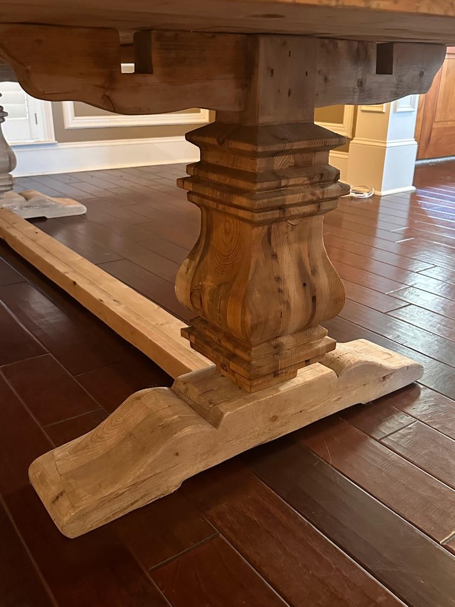 Appears to be cypress, but maybe cedar ~ it’s heavy beautiful and can be left as is, stained or painted ~ has (2) 18” end leaves that slide onto each side making it a total length of 144" ~ table without leaves 108” (9ft) x 30” H x 42” W ~ no chairs are included; however, I have shown a picture of how Client has set up ~ Chairs sold separately
