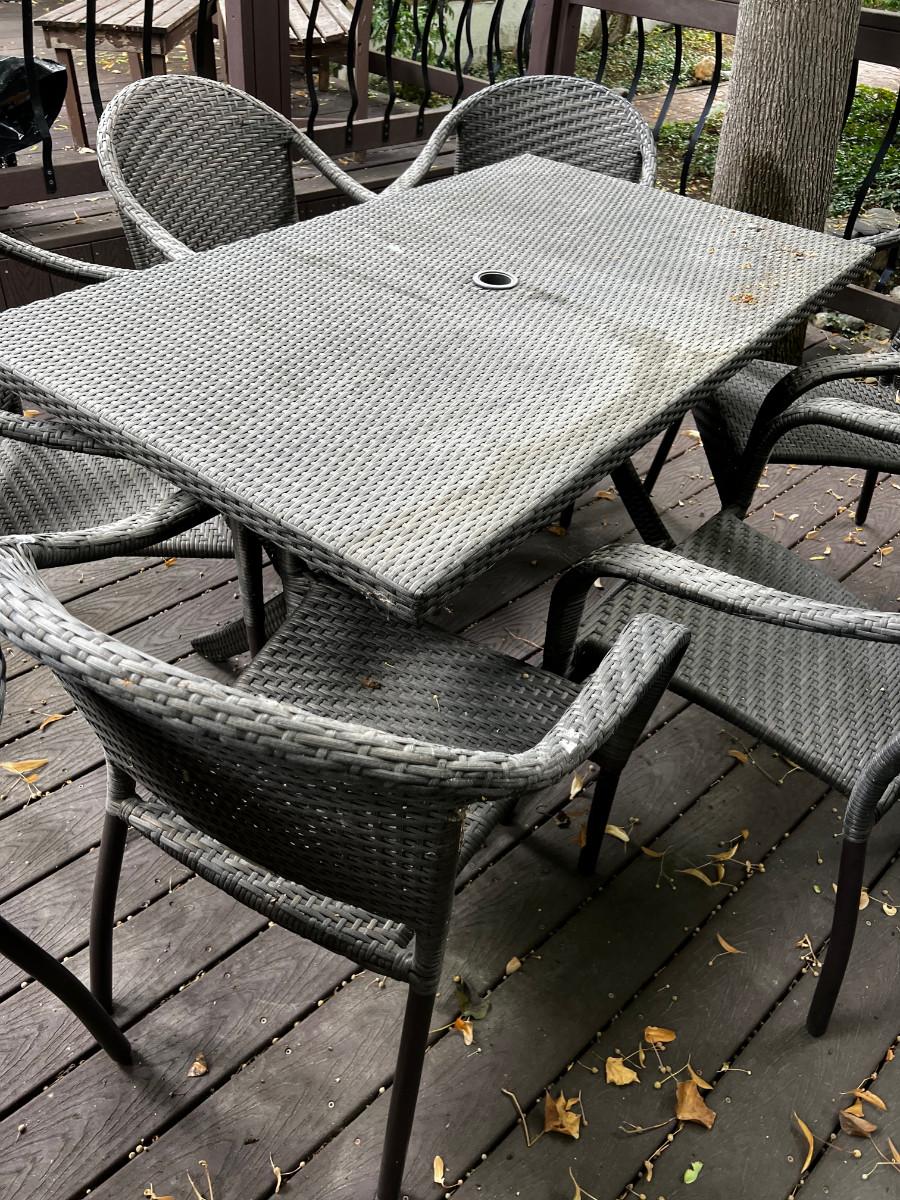8 chairs Table is 55 by 32: FOLDING TABLE X BASE. Chairs will stack. Excellent for storage.