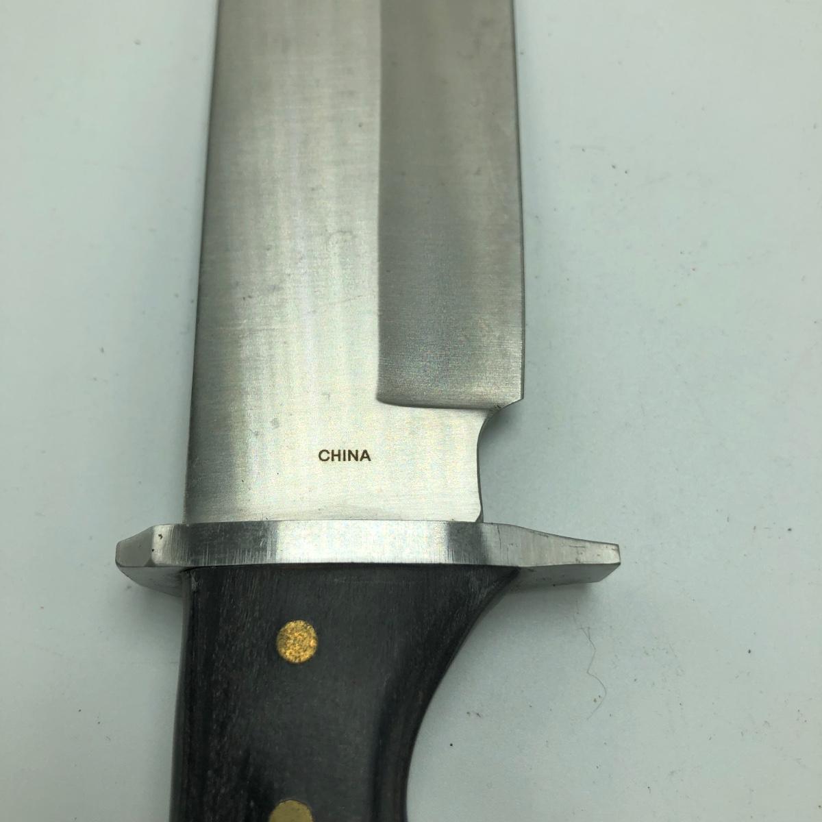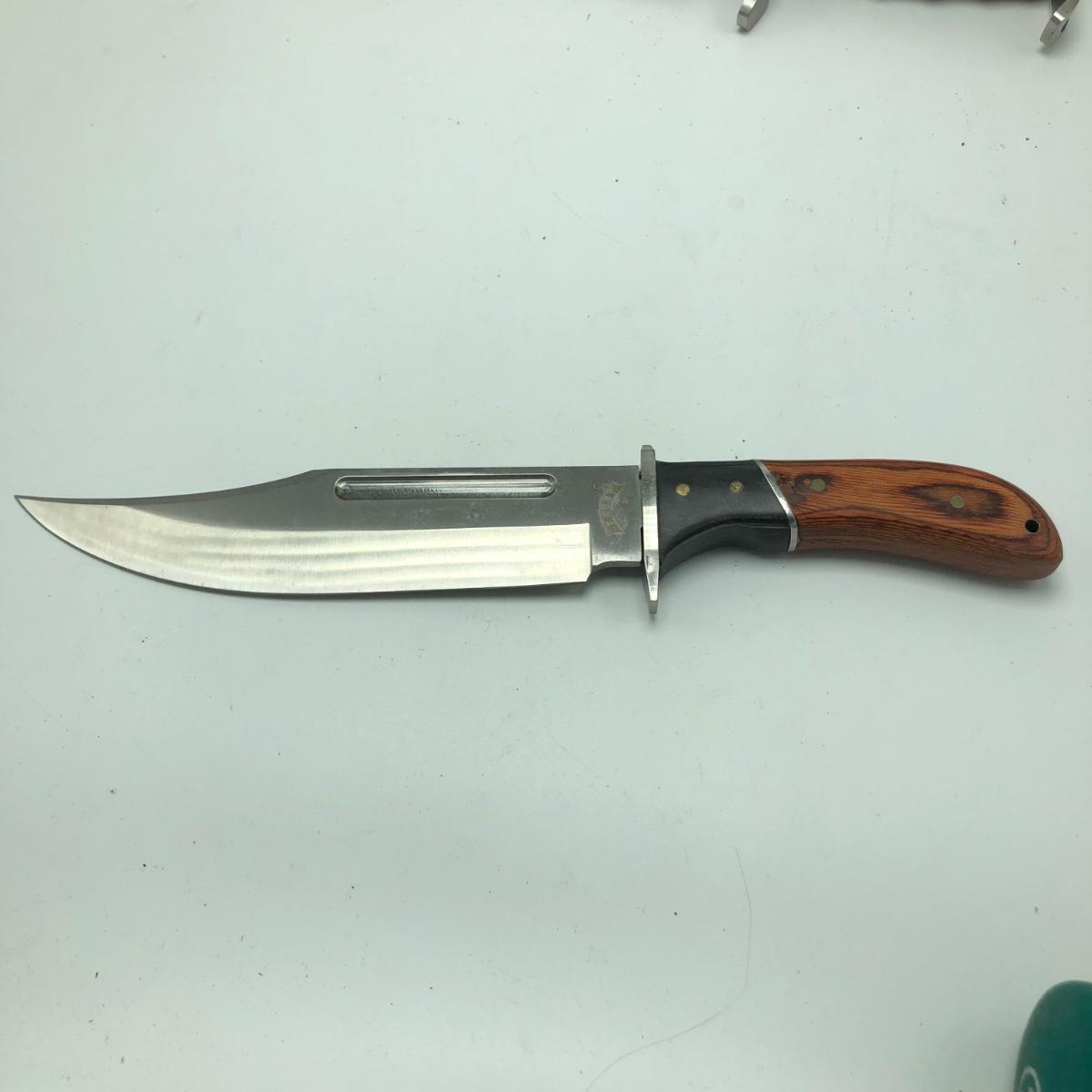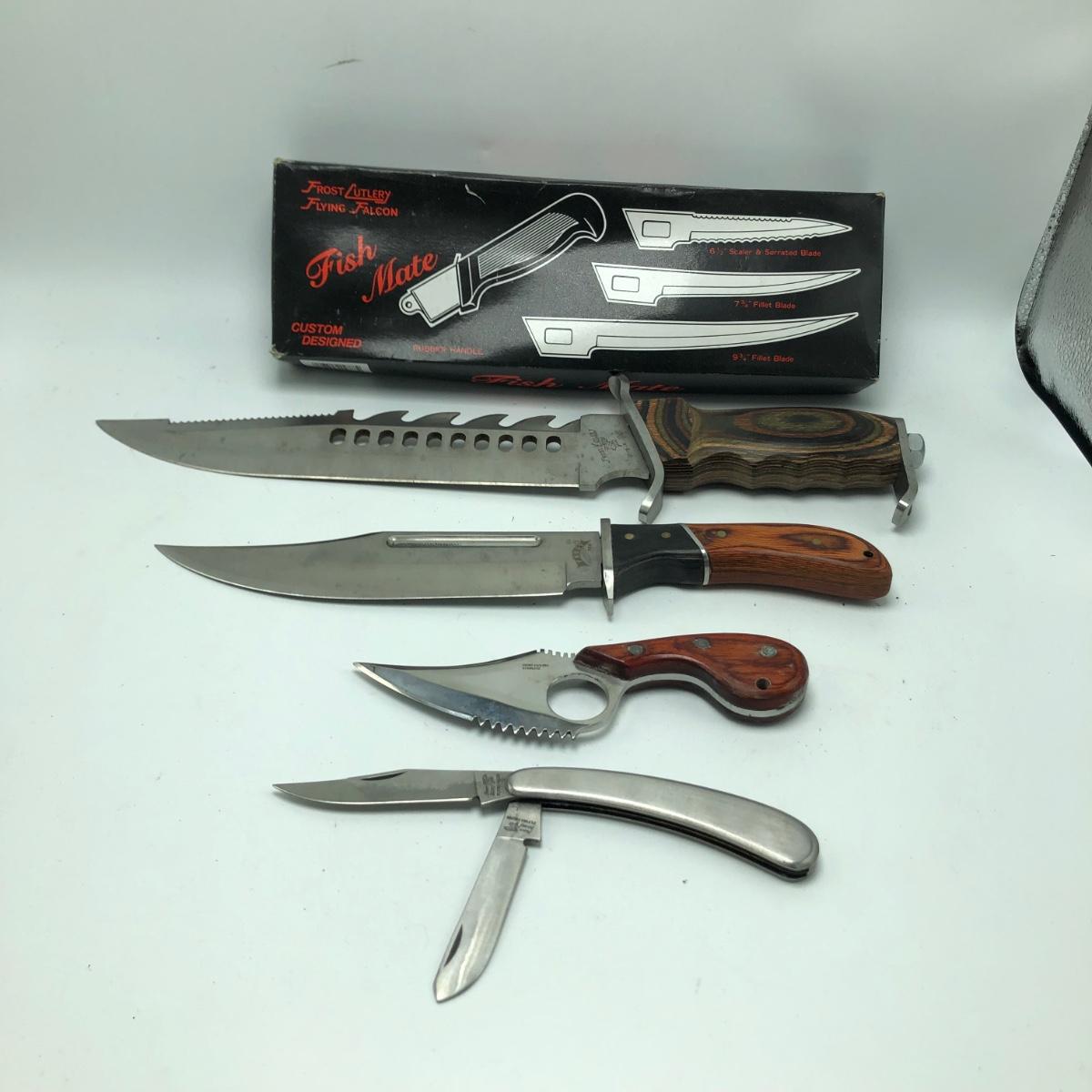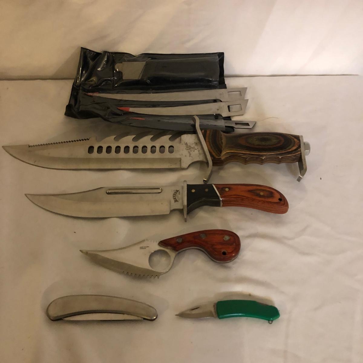 Lot contains a total of six knives: two Bowie knives, one skinner knife, two pocket knives and a three blade fish knife. Largest knife measures 16” long.
